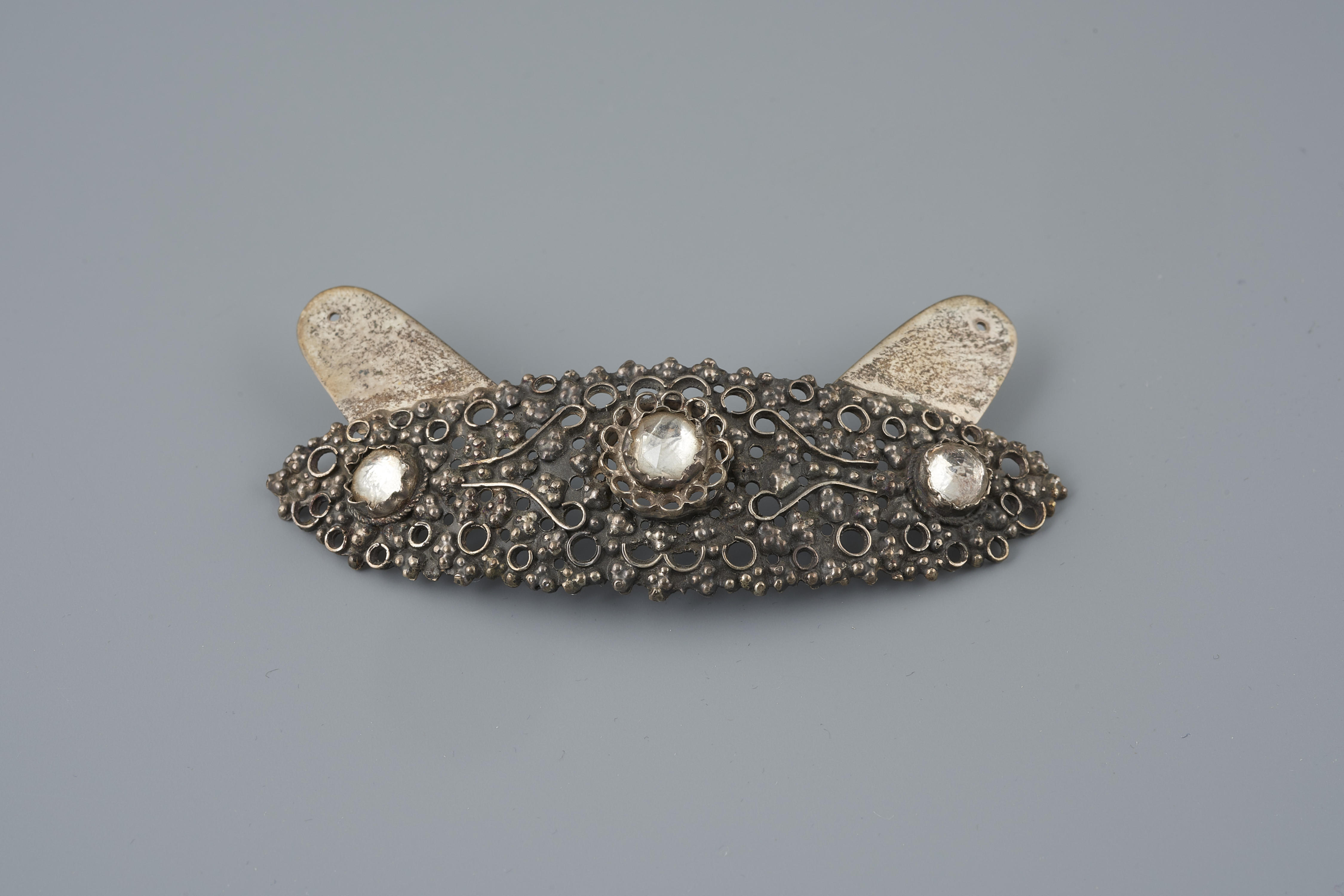 Zilveren voorhoofdsplaat met imitatiediamanten van glas, gedragen door een vrouw uit de provincie Groningen. De vervaardiger is onbekend.