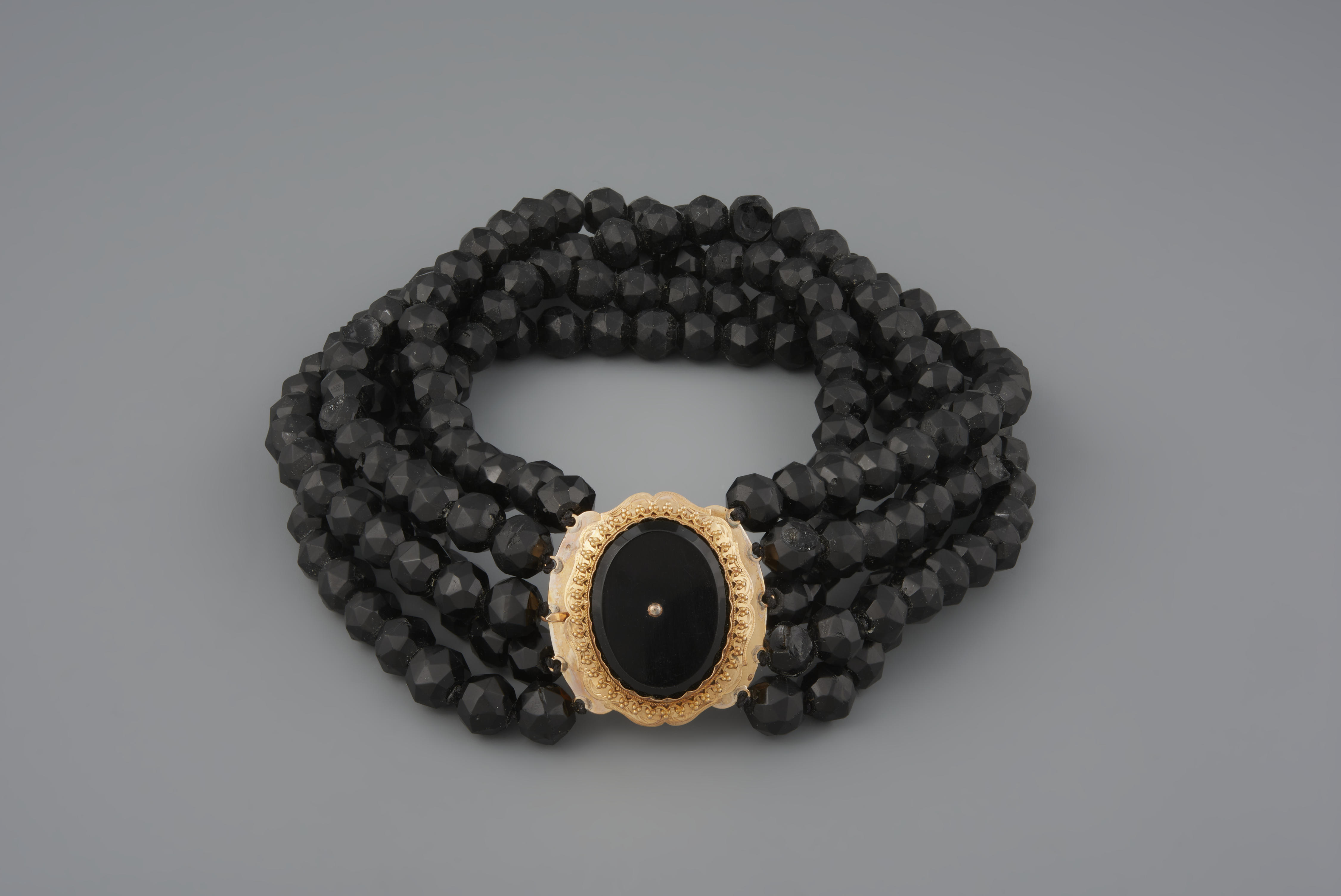 Halssnoer met kralen van zwart glas en een slot met een edelsteen (mogelijk onyx) in een 14-karaats gouden vatting. Op de steen zit een klein gouden knopje. Het halssnoer is gedragen door een vrouw uit Kampen bij de rouwdracht. Dit type is niet specifiek streekgebonden en kan ook bij algemene modedracht gedragen zijn.