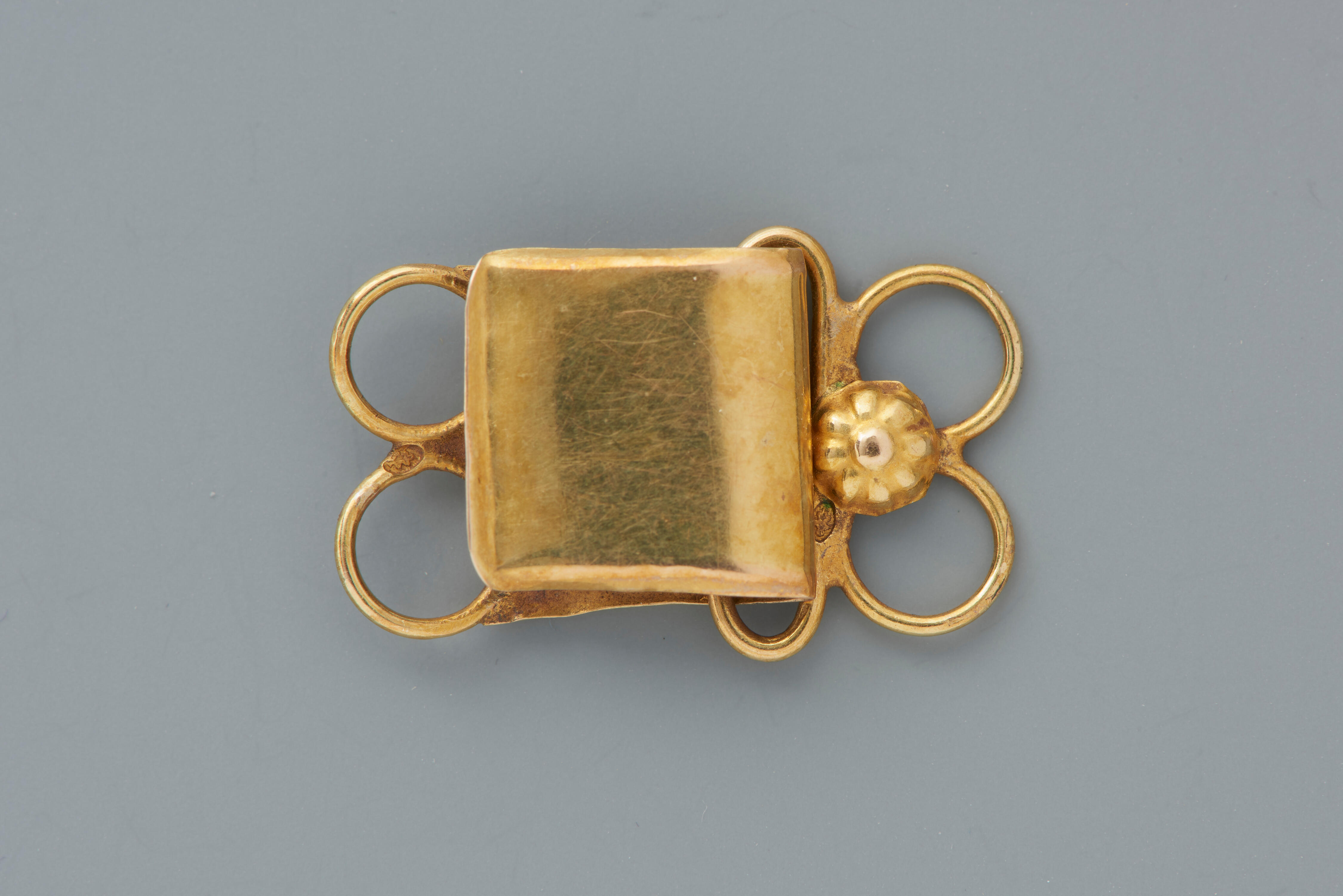 Een 14-karaats gouden haak en oog, oorspronkelijk gebruikt voor het sluiten van de keellinten van een kaphoed en gedragen door een meisje of vrouw in streekdracht van het eiland Walcheren. De sluiting draagt geen meesterteken. Toen de kaphoeden aan het eind van de negentiende eeuw op Walcheren uit de mode raakten, werden de gouden sluitingen ...