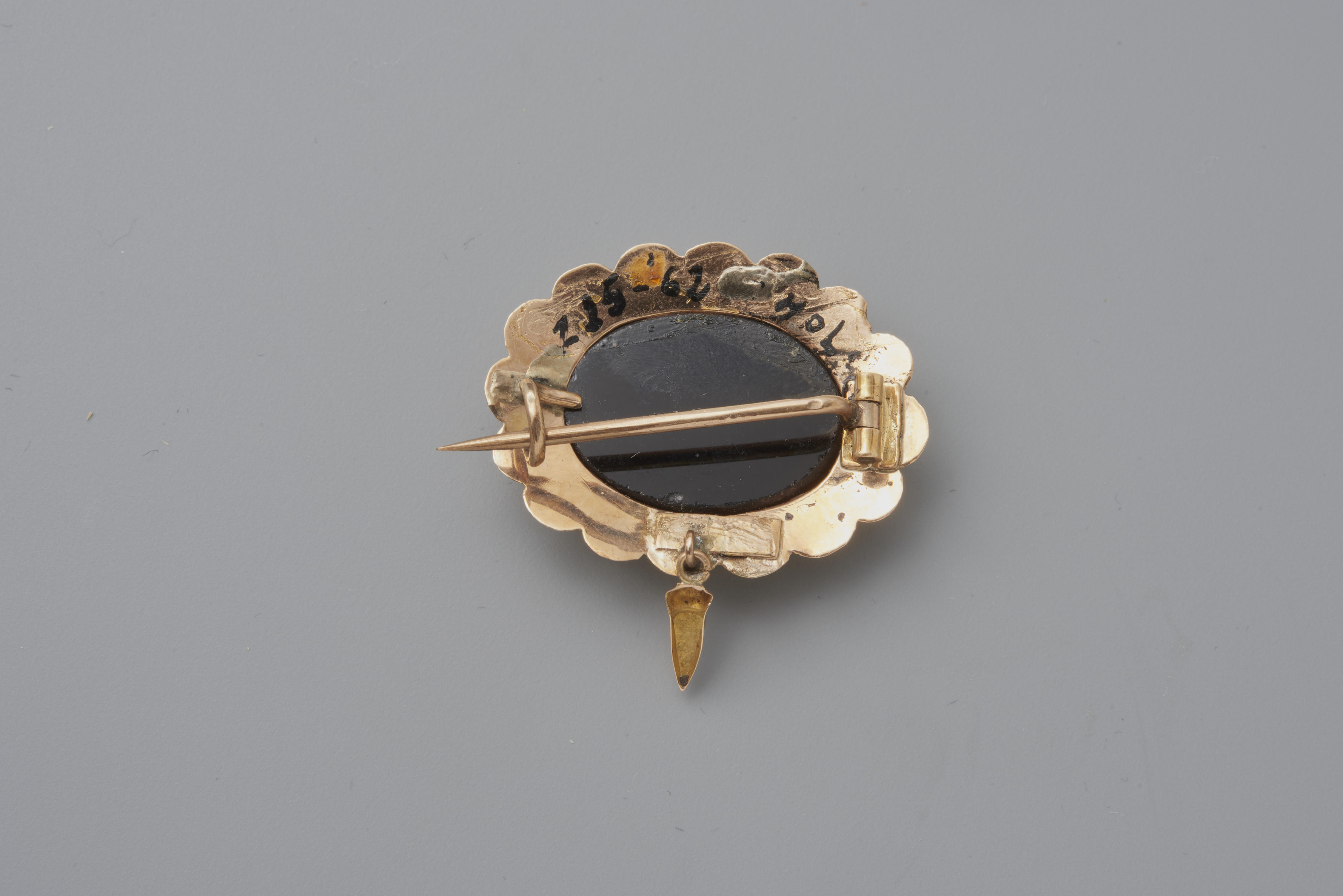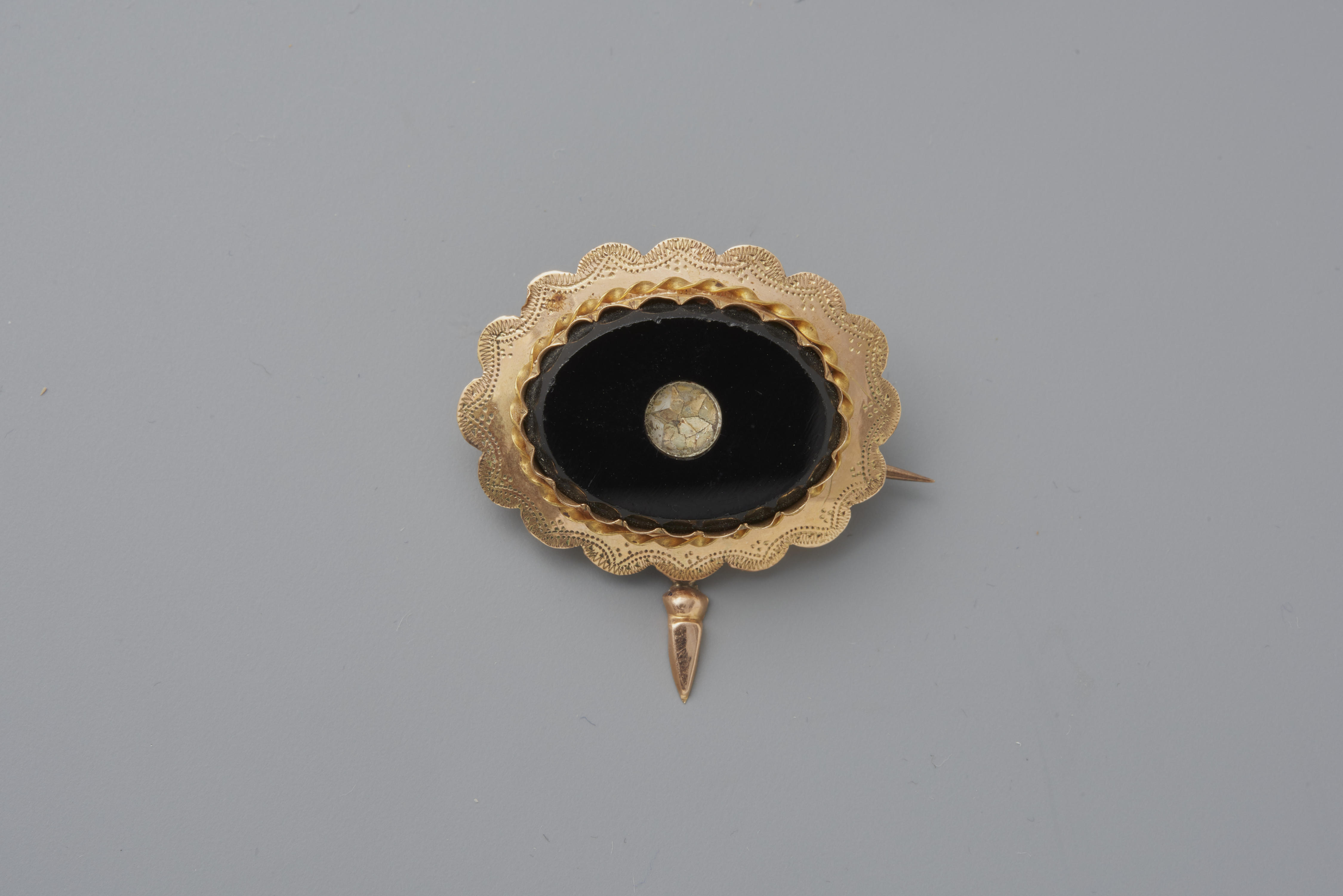 Deze algemene modebroche is gemaakt omstreeks 1890 en gedragen door een vrouw in streekdracht van de Zuid-Hollandse eilanden. Dit type broche was dikwijls onderdeel van een set met zowel oorhangers als mutsspelden. Het goud is ongemerkt. De zwarte steen kan van onyx zijn, maar is vermoedelijk van zwart glas. In de zwarte steen zit een ...