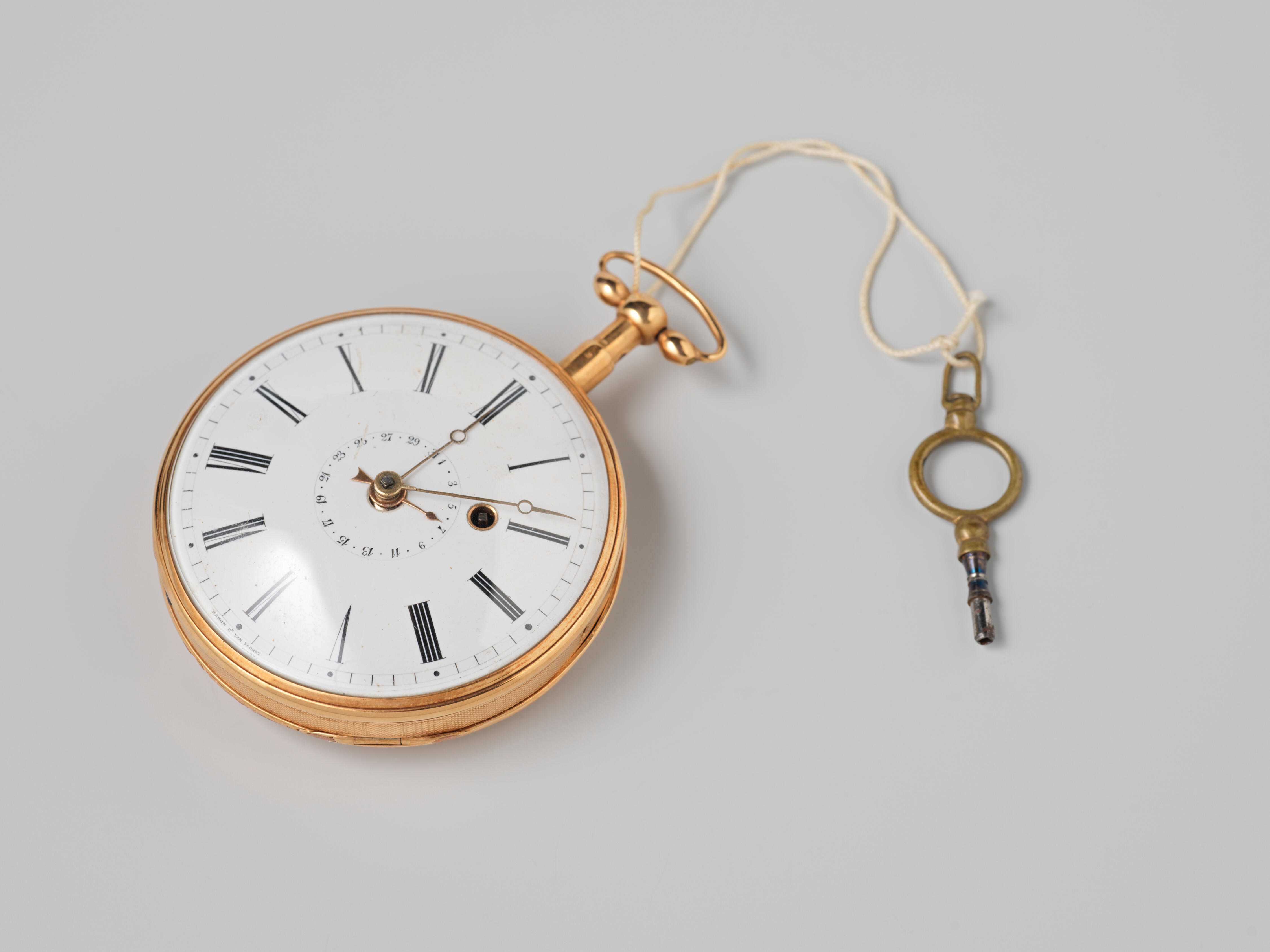 Een 18-karaats gouden zakhorloge met sleutel. Het horloge heeft een geëmailleerde wijzerplaat met Romeinse cijfers en een maandkalender in de middencirkel. Het opschrift onder het cijfer VI luidt: 'Baron Ed. van Voorst'. Het deksel van de kast heeft diverse stempels en inscripties.