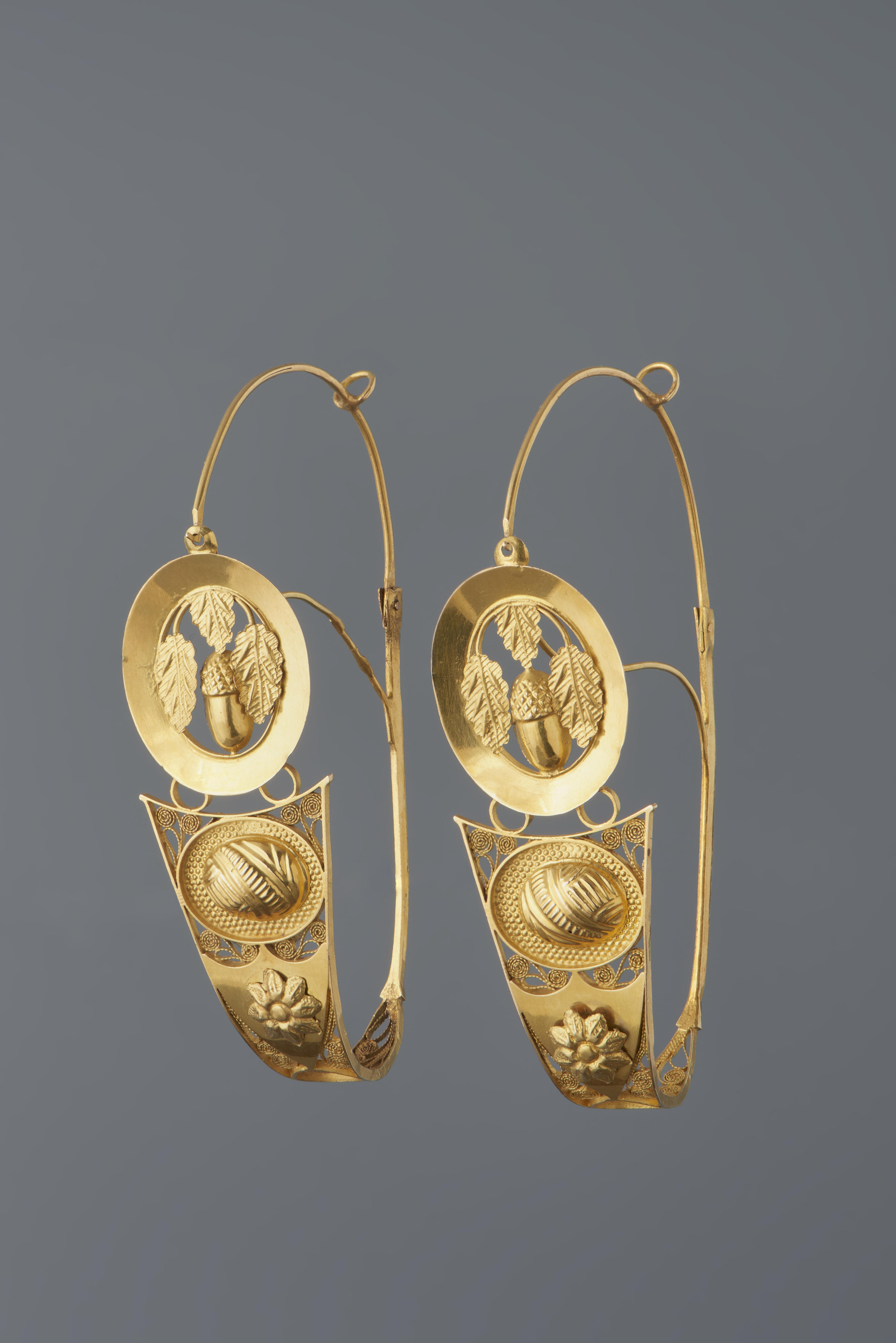 Paar 18-karaats gouden oorringen, tussen 1826 en 1837 gemaakt door J.M. Lazonder in Schoonhoven. Rond 1830 waren dit soort oorringen modieus. Bij streekdracht zijn ze op verschillende manieren gedragen. In Twente werden ze baandels genoemd en in de voorrand van de muts gedragen. Op Tholen werden vergelijkbare sieraden door mannen als oorringen gedragen. Het gebruik ...