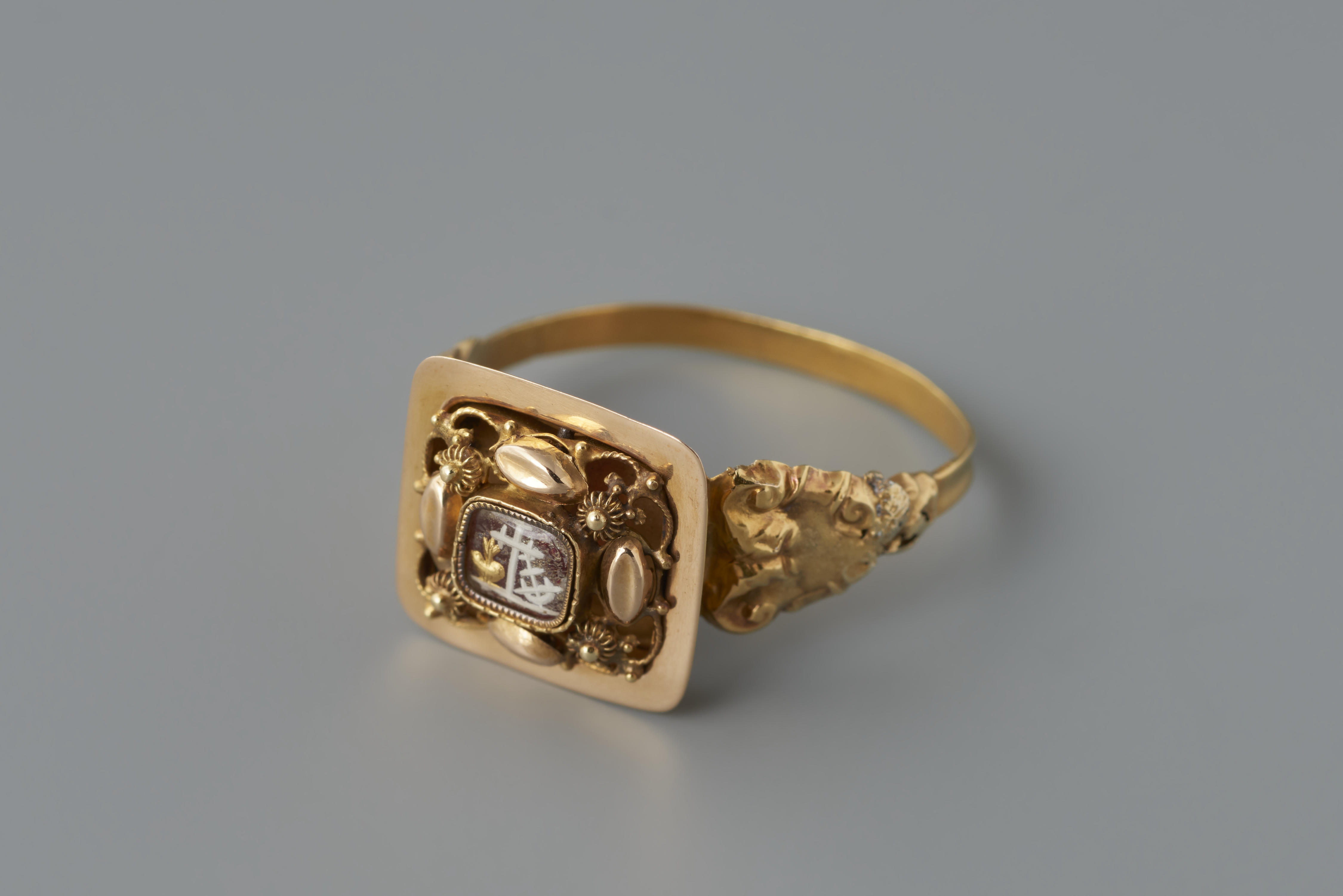 Ring van 18-karaats goud, gedragen door een vrouw uit Noord-Brabant. Op de achterzijde van het glazen steentje zijn de symbolen voor 'geloof, hoop en liefde' geschilderd. Het meesterteken is mogelijk van J.B. Citroen uit Amsterdam.