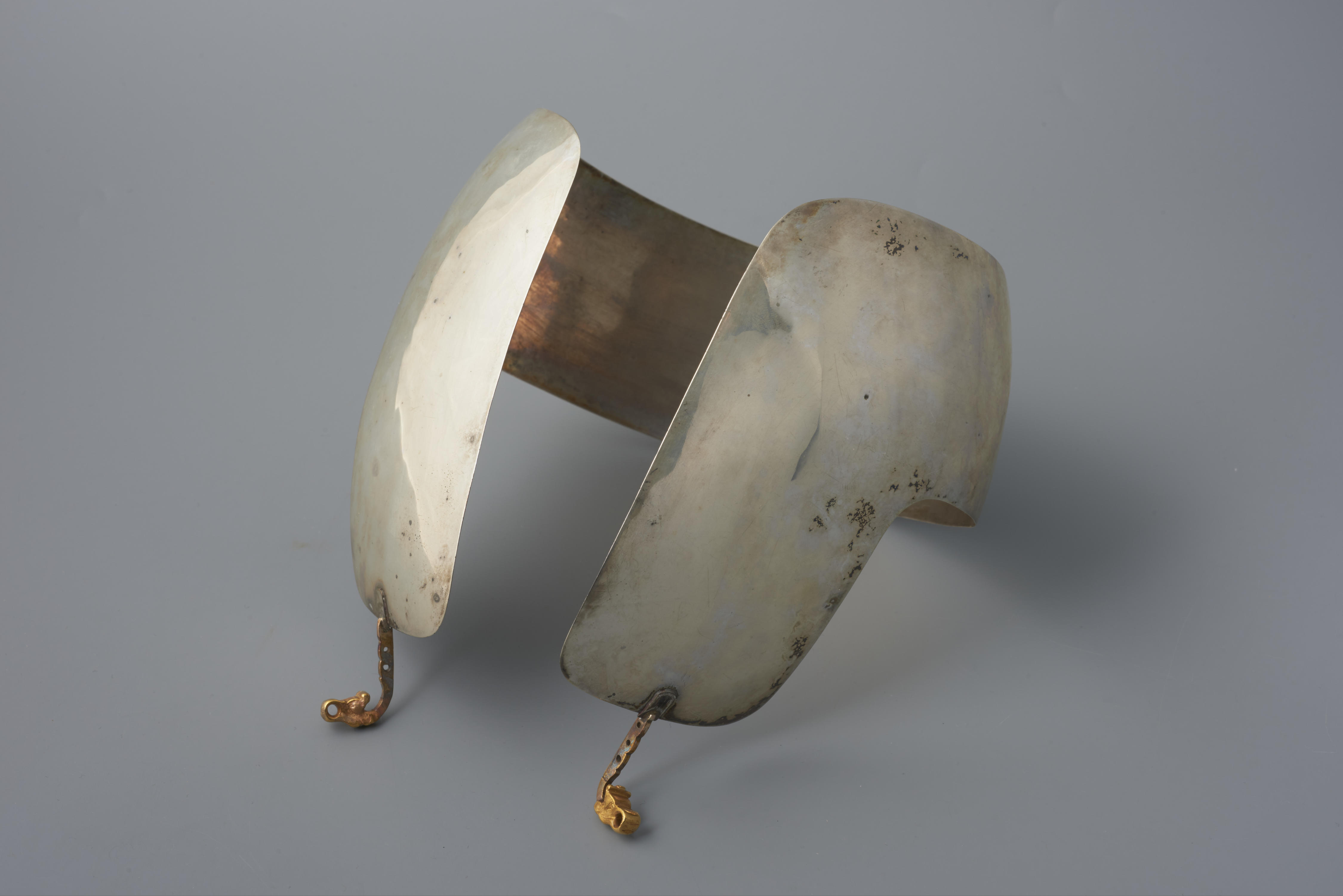 Een zilveren oorijzer met gouden uiteinden, zogenoemde 'tuten', gedragen door een vrouw in streekdracht uit Laren (Noord-Holland). Ze droeg over het oorijzer de zogenoemde 'vierkante muts'. In het verbindingsstuk tussen de beugel en de boeken zitten twee gaatjes. Hierdoor kunnen spelden worden gestoken die de muts en het oorijzer aan elkaar bevestigen. In het oorijzer ...