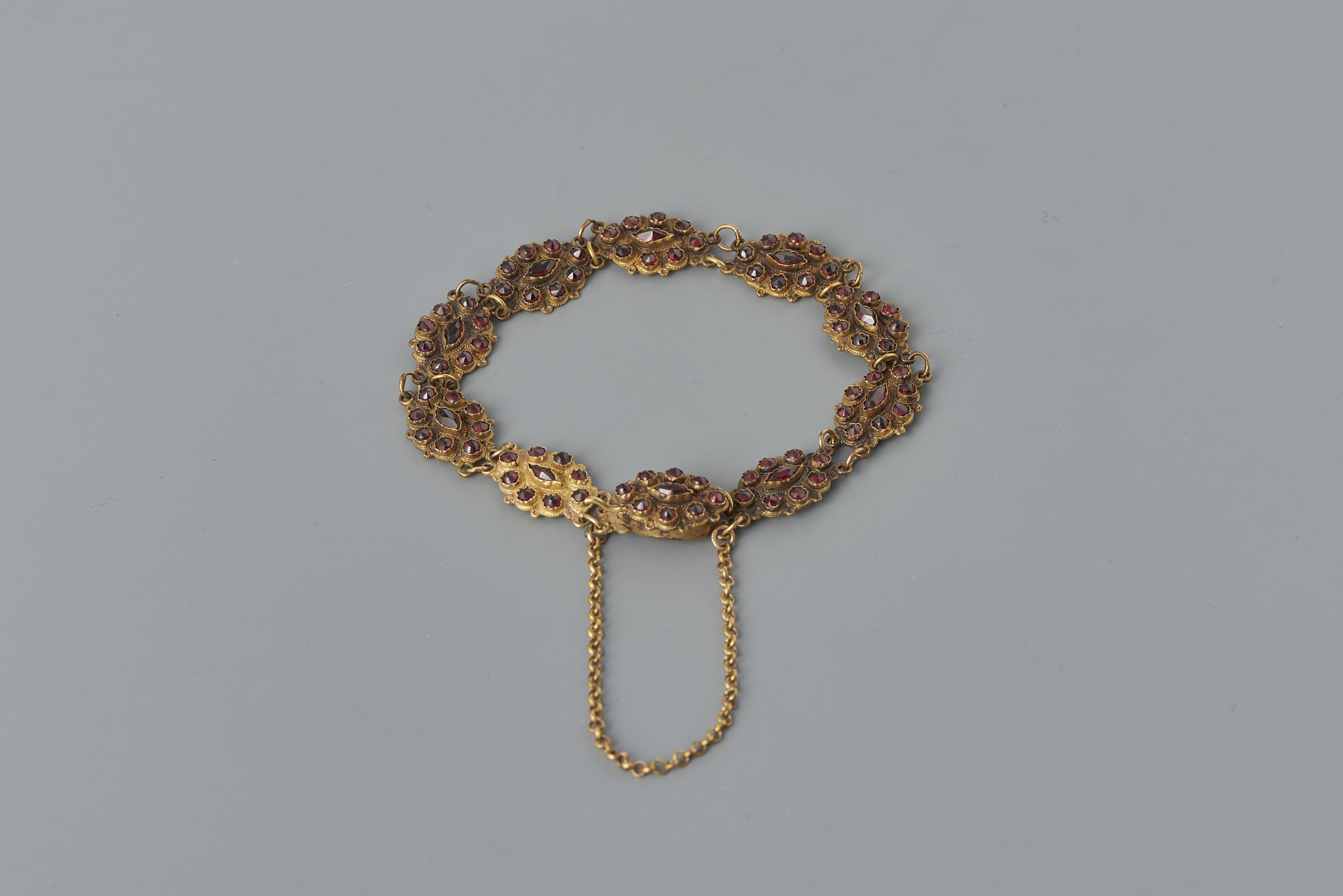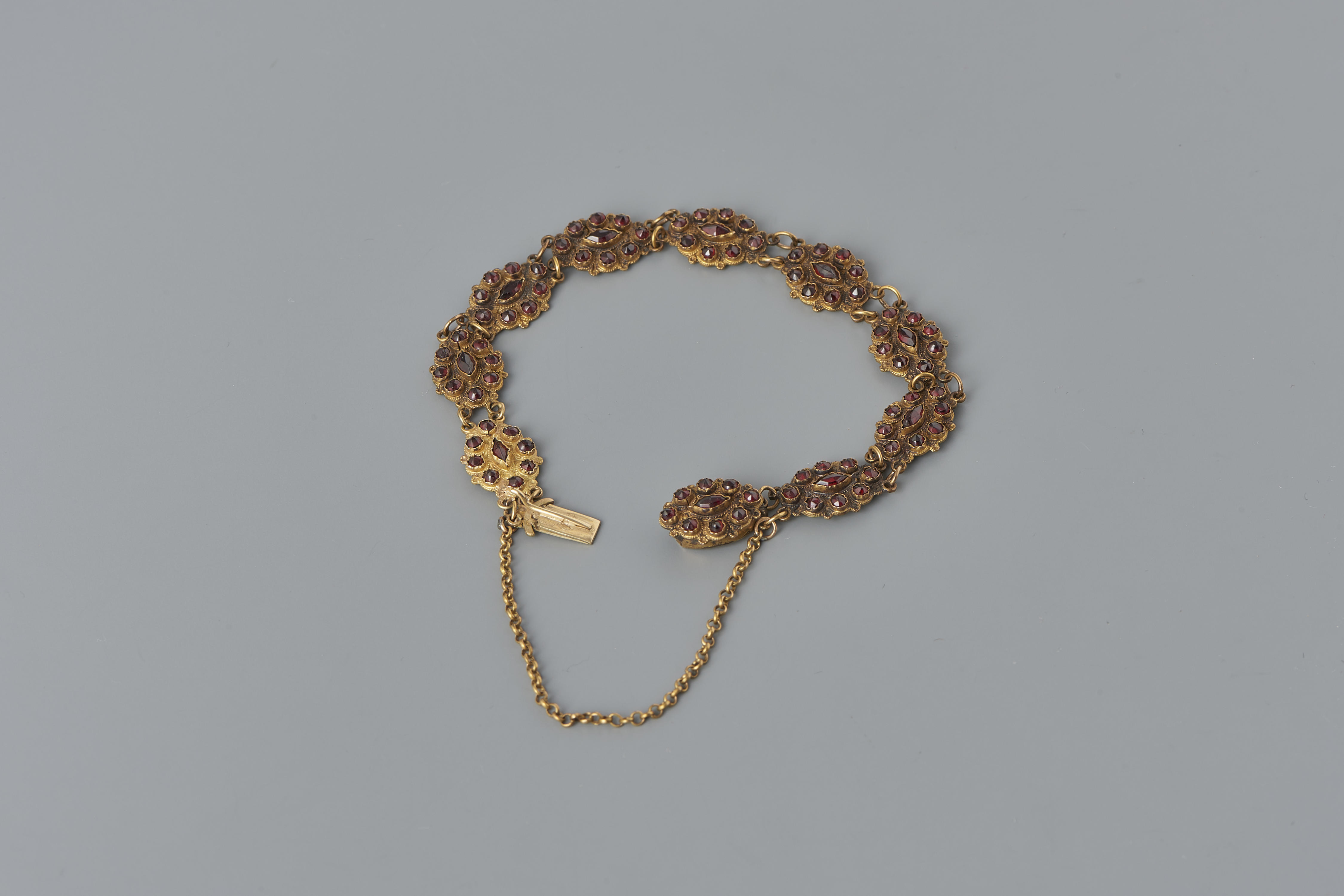 Zogeheten bootjesarmband of karkantarmband uit omstreeks 1855-1875, gedragen in Friesland. De armband bestaat uit tien schakels van 14-karaats goud, elk bezet met kleine granaten. De schakels zijn verbonden met kleine gouden ringetjes. Dergelijke armbanden werden in meerdere delen van Nederland gedragen, vooral in het noorden. Het goud is in de twintigste eeuw herkeurd. De armband ...