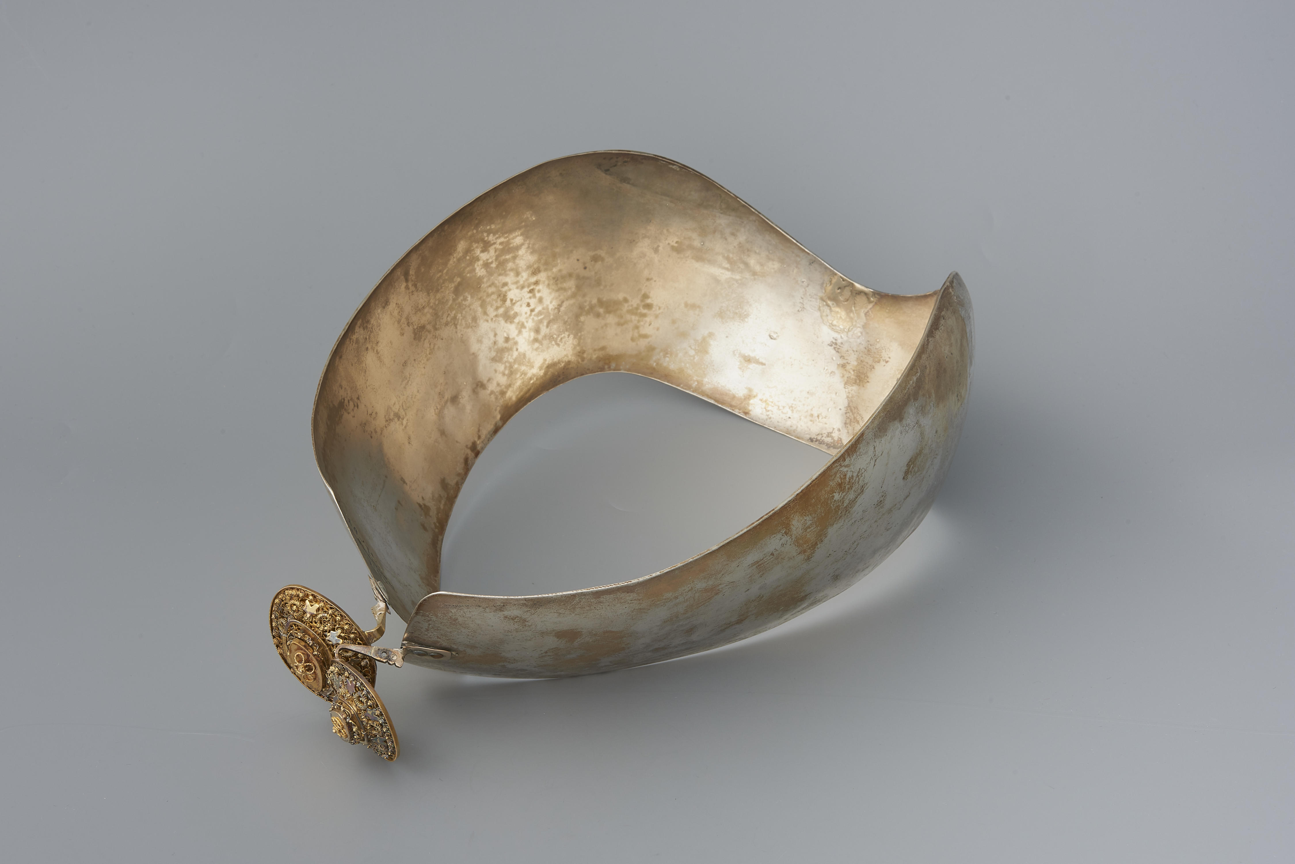 Zilveren oorijzer met 18-karaats gouden 'boeken', gedragen door een vrouw in streekdracht uit Scheveningen. Naast de oorijzers met ovale 'boeken' werden in Scheveningen ook oorijzers met 'stukken' gedragen. In de aanzetten van de boeken zitten twee gaatjes waardoor spelden gestoken kunnen worden om de muts aan het oorijzer vast te steken. De beugel is vermoedelijk ...