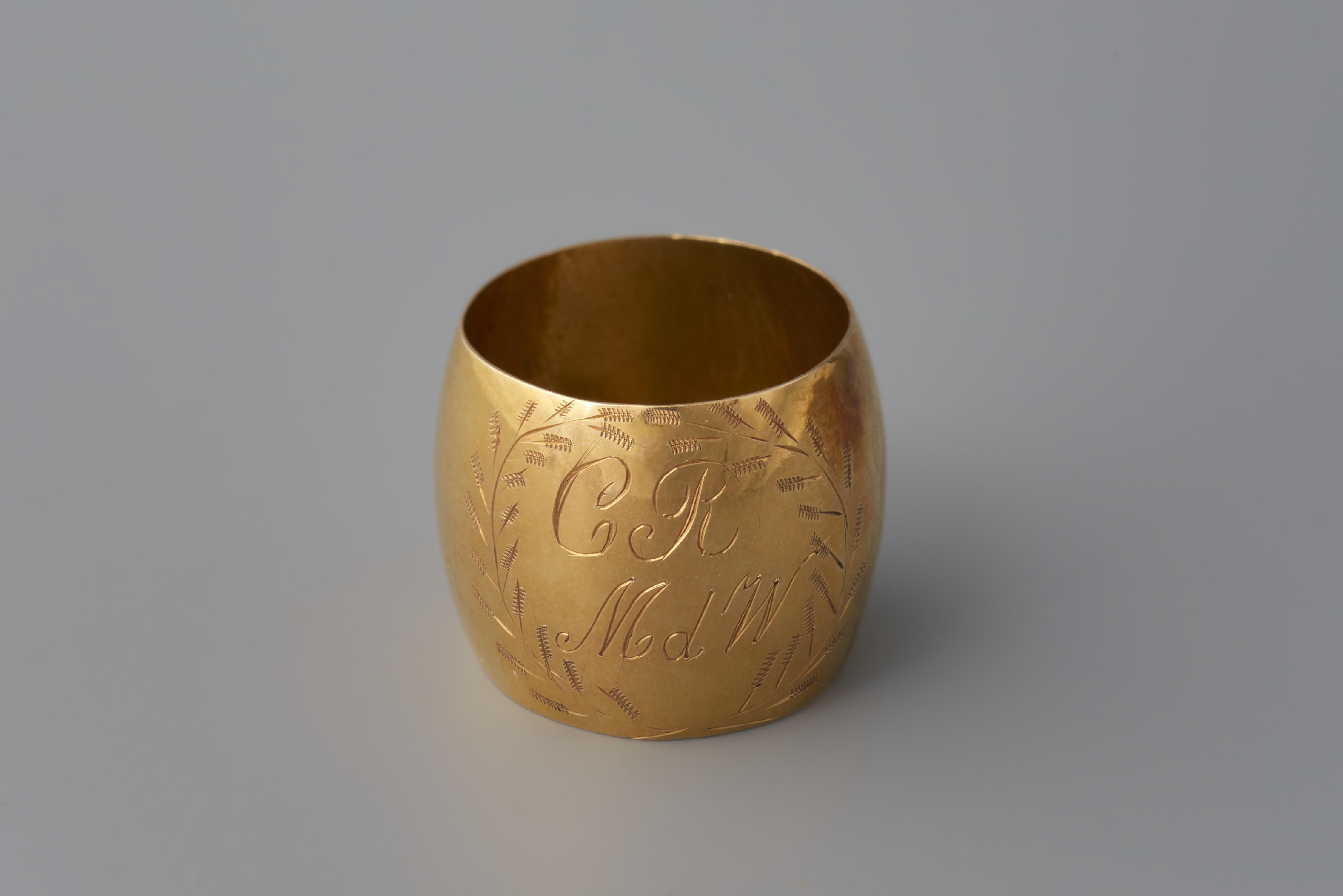 Trouwring van 18-karaats goud met de initialen C.R. en M.d.W., gedragen door een vrouw in streekdracht van Walcheren. Mogelijk hoorde deze ring bij het huwelijk van Christiaan Riemens en Maartje de Witte. Zij trouwden op 19 juni 1895 in Grijpskerke. De ring heeft een jaarletter van 1895. Het meesterteken is onduidelijk. Mogelijk is de ring ...