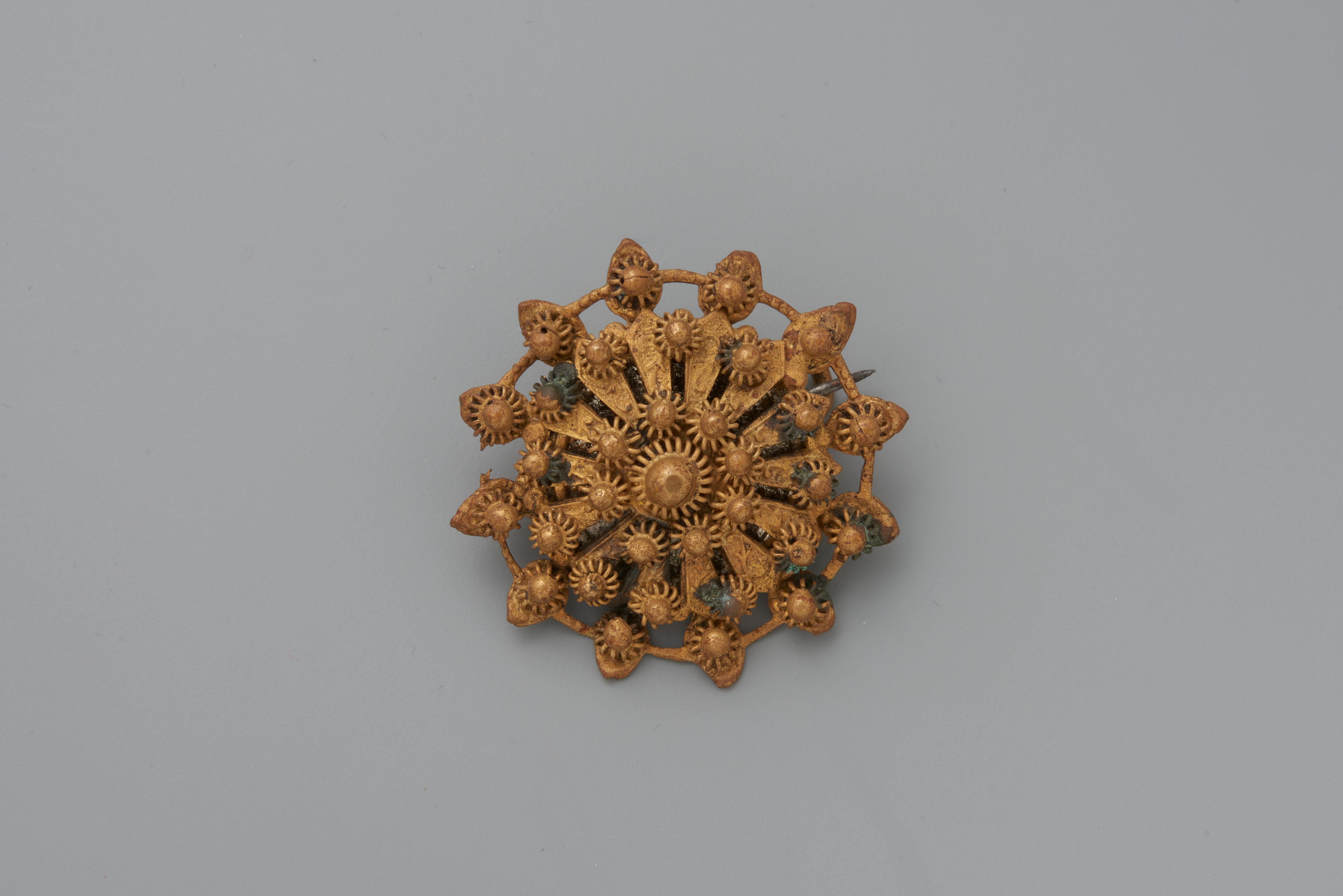 Vergulde 'mansbroche'. Op Walcheren werd vanaf het begin van de twintigste eeuw door de mannen een gouden broche gedragen op de boezeroen.