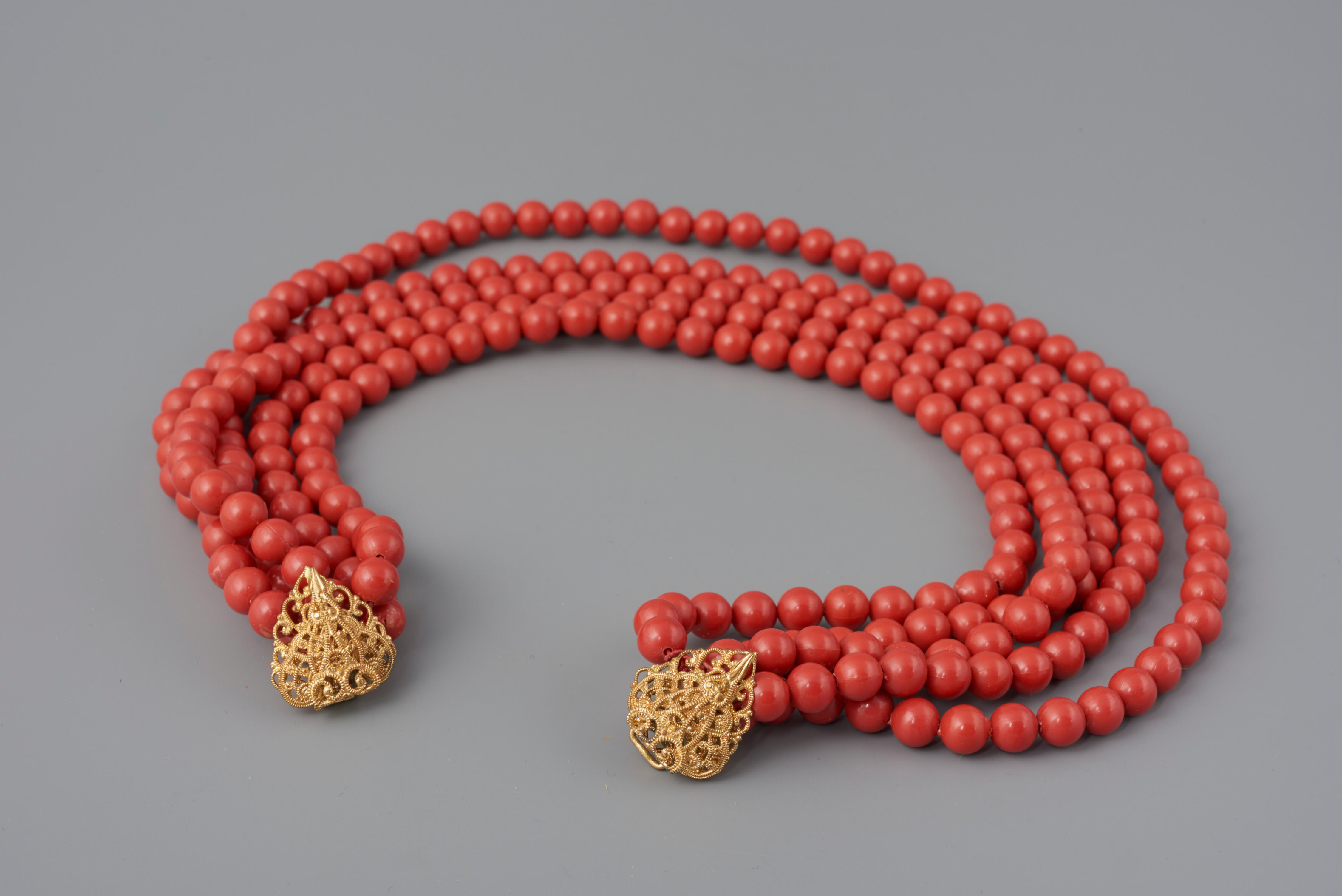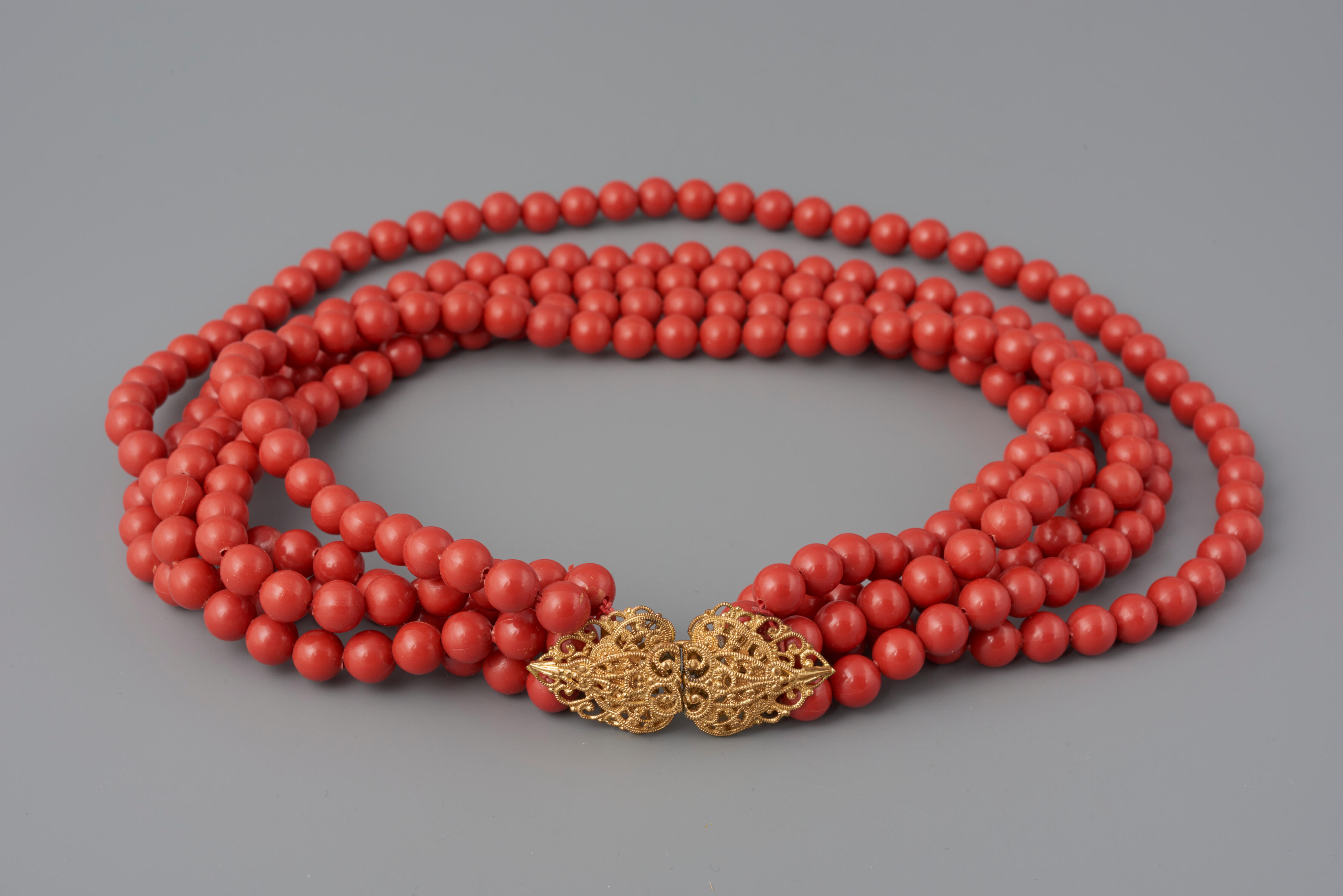 Een halssnoer, bestaande uit een tweedelige goudkleurig metalen sluiting en vijf strengen kunststof kralen. Het halssnoer is gedragen door een vrouw in streekdracht uit Arnemuiden bij de werkdracht.