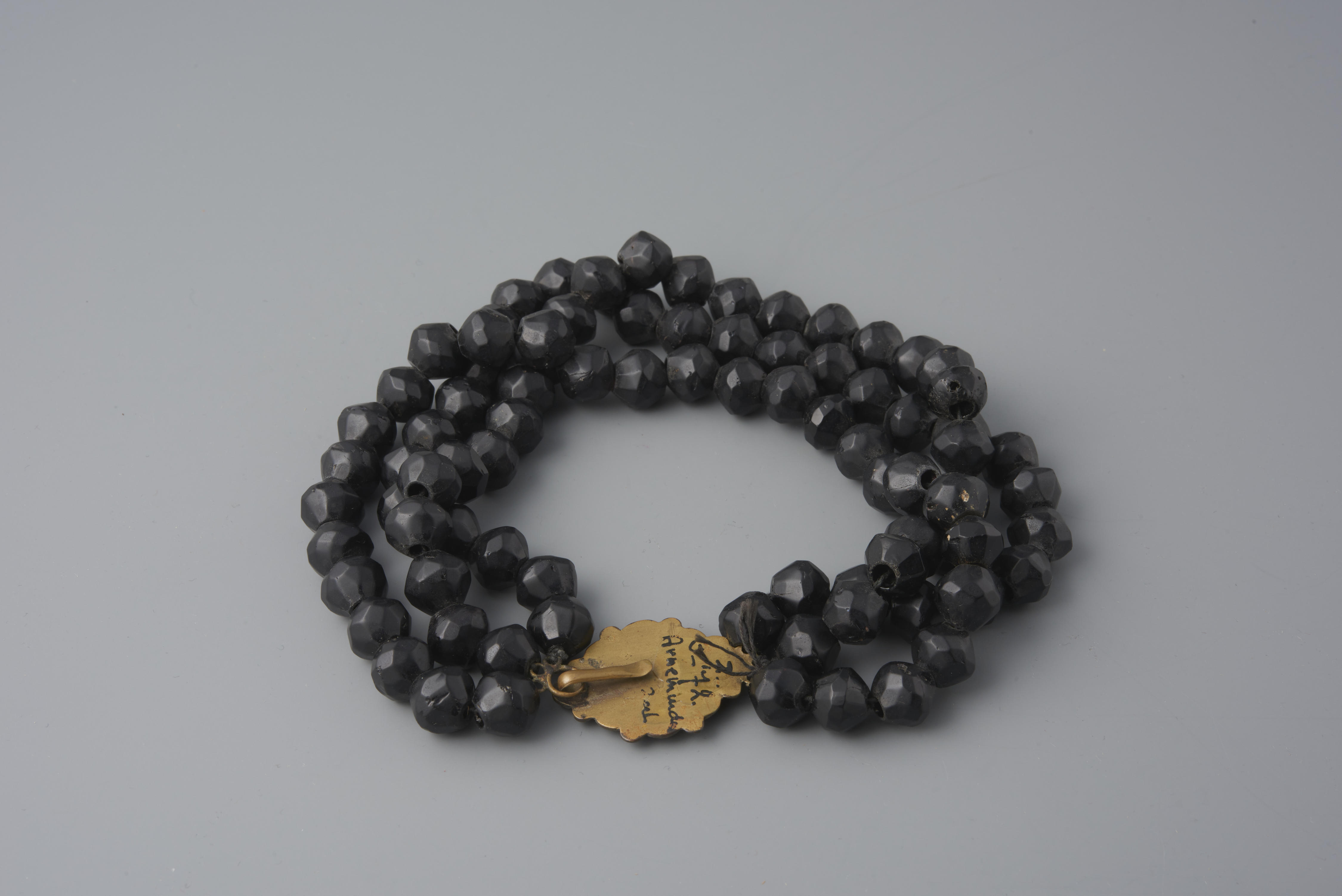 Halssnoer, bestaande uit drie strengen gefacetteerde glazen kralen en een koperen sluiting met gitten. Het halssnoer is gemaakt rond 1860-1900 en gedragen door een meisje uit Arnemuiden bij de rouwdracht.