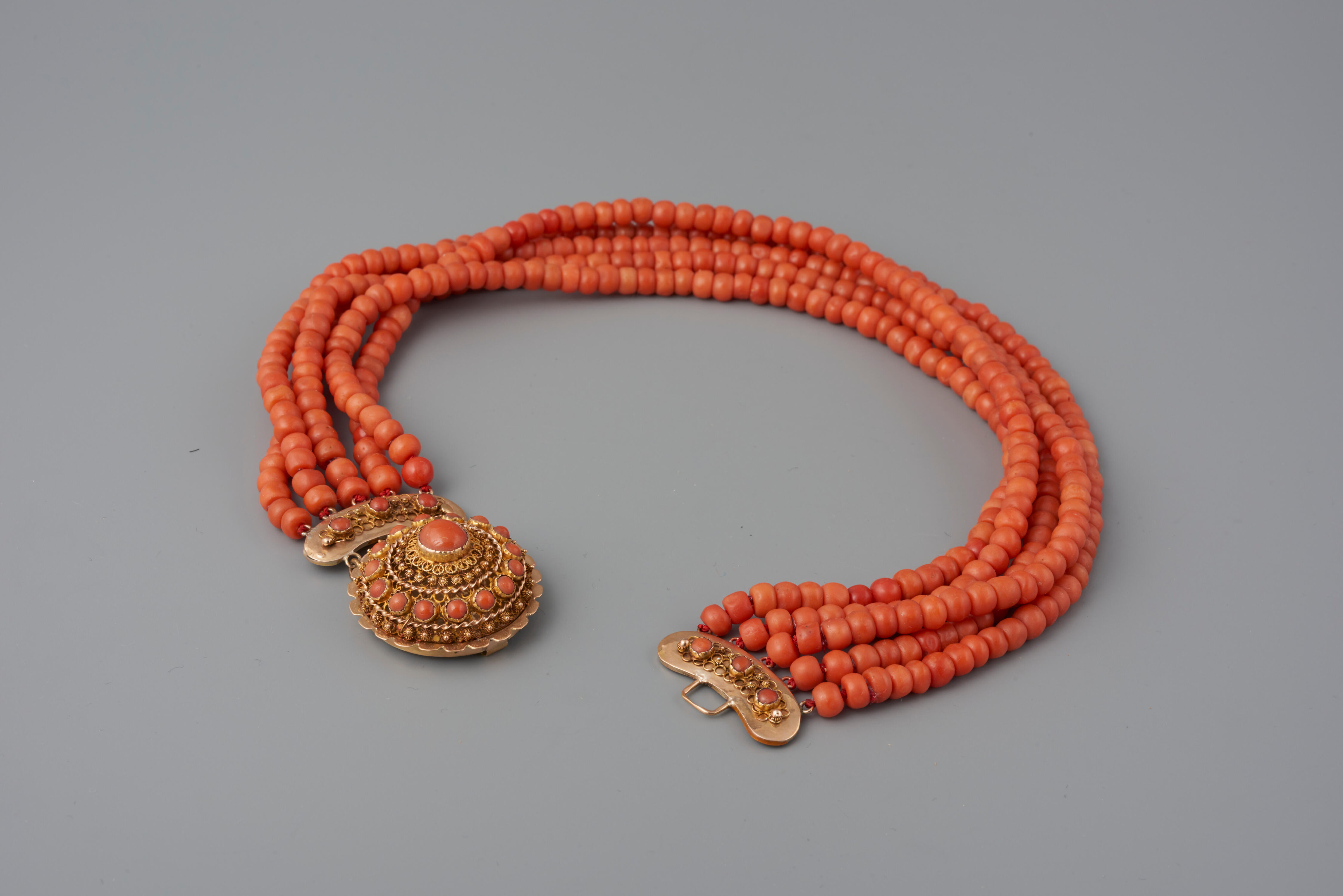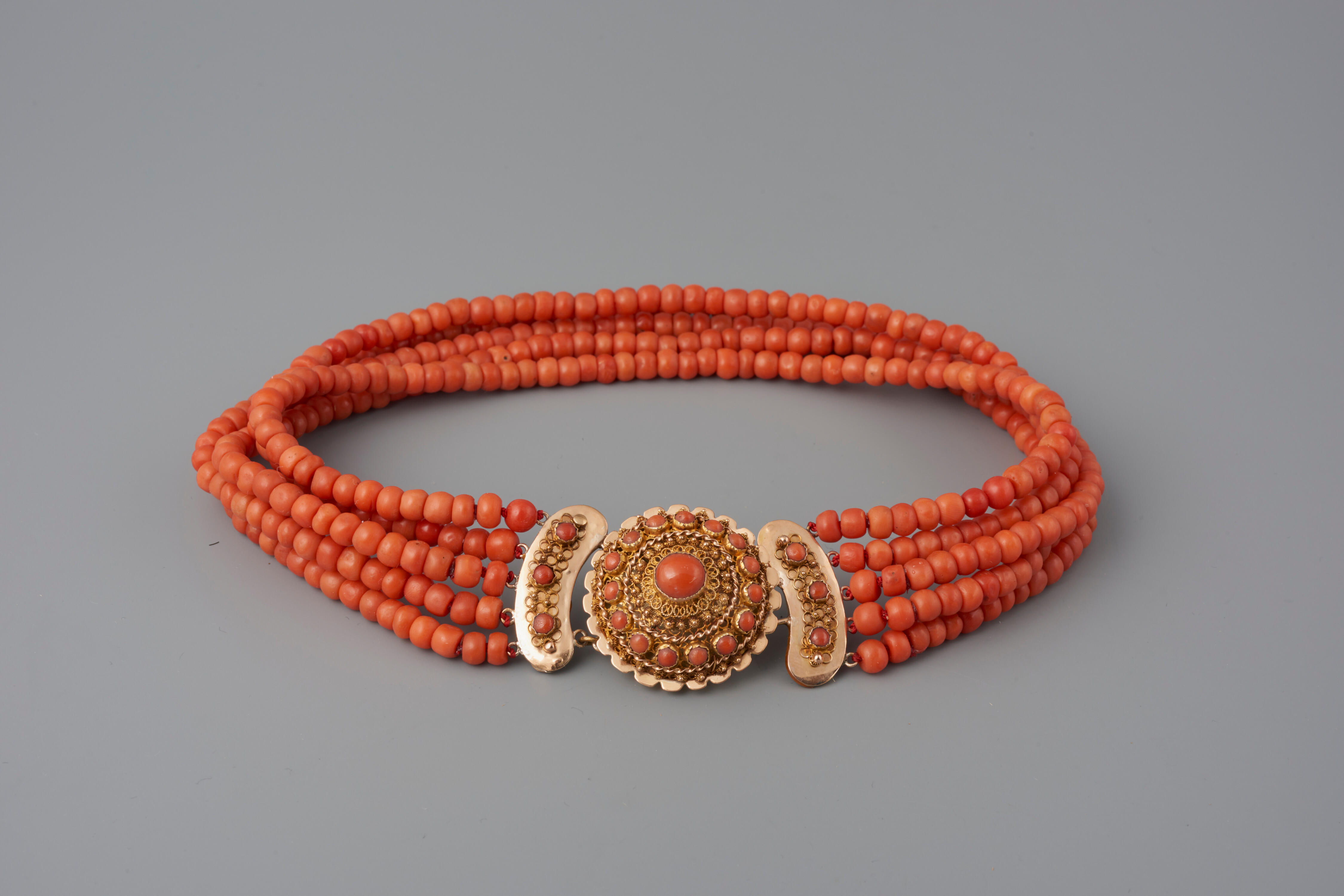 Een halssnoer, bestaande uit vijf strengen kralen van bloedkoraal aan een driedelig 14-karaats gouden slot, gedragen door een vrouw in streekdracht van het eiland Walcheren. Het slot is waarschijnlijk vervaardigd door P. Sonsbeek, werkzaam in Schoonhoven tussen 1899 en 1918.
