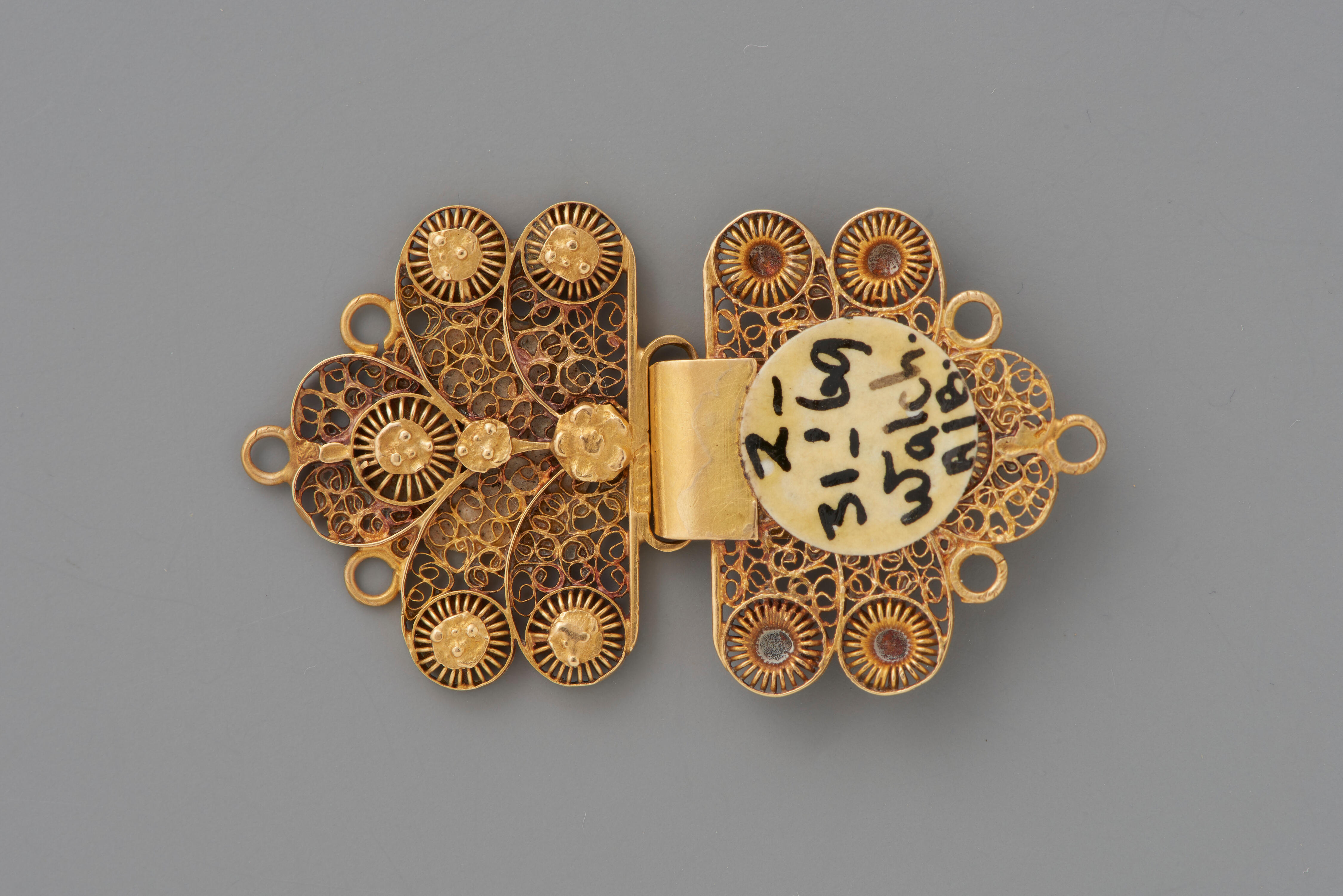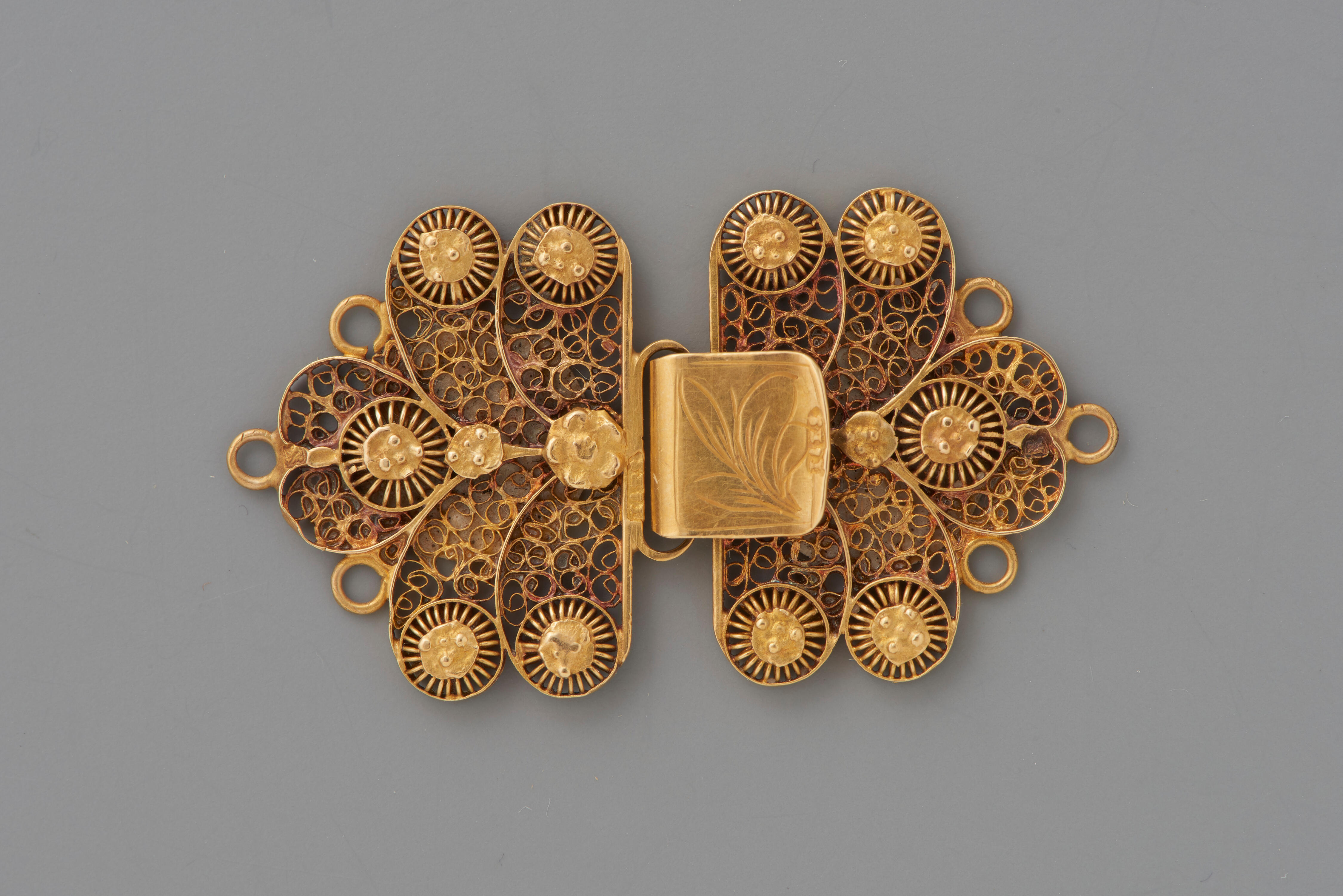 Een gouden haak en oog, gebruikt voor het sluiten van de achterlinten van een kaphoed en gedragen door een meisje of vrouw in streekdracht van het eiland Walcheren. Het meesterteken is onduidelijk. Toen de kaphoeden aan het eind van de negentiende eeuw op Walcheren uit de mode raakten, werden de gouden haken en ogen op ...