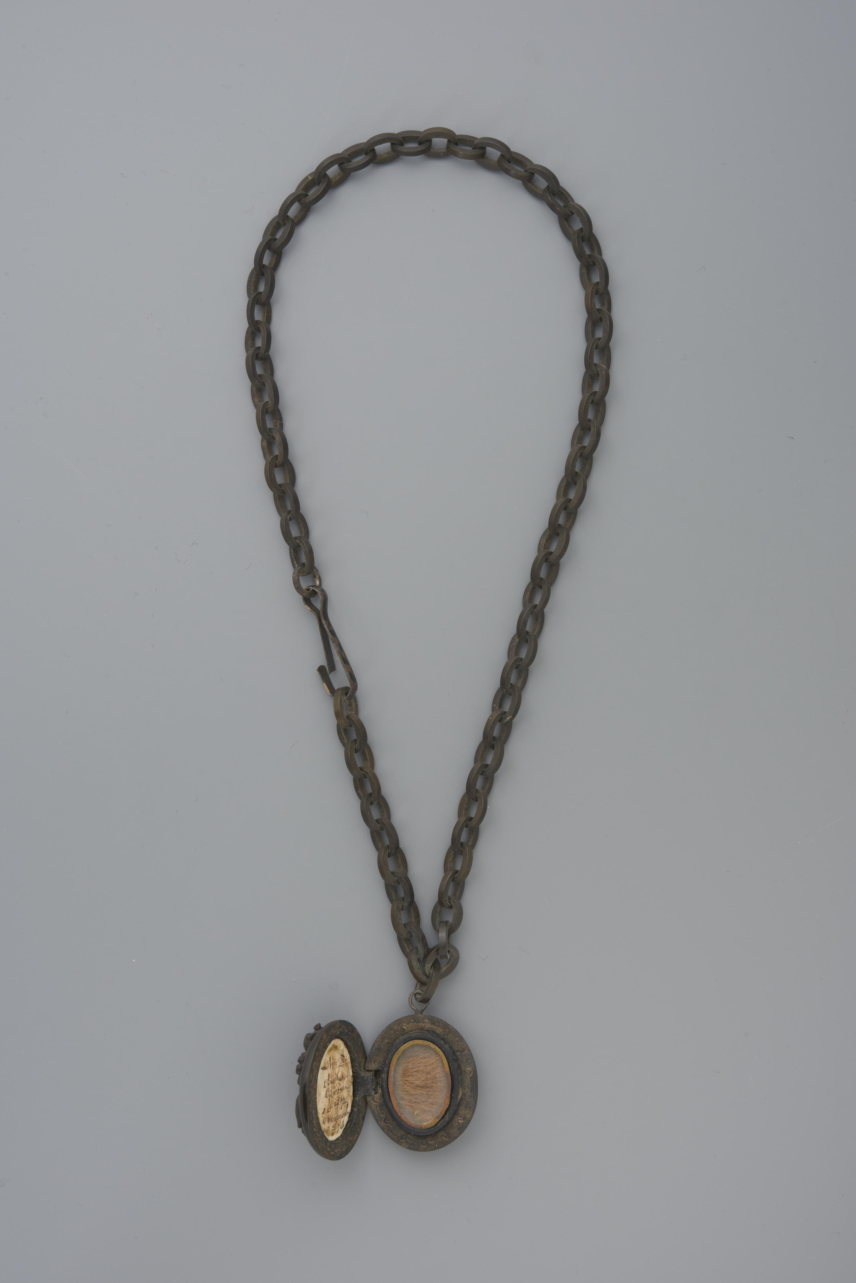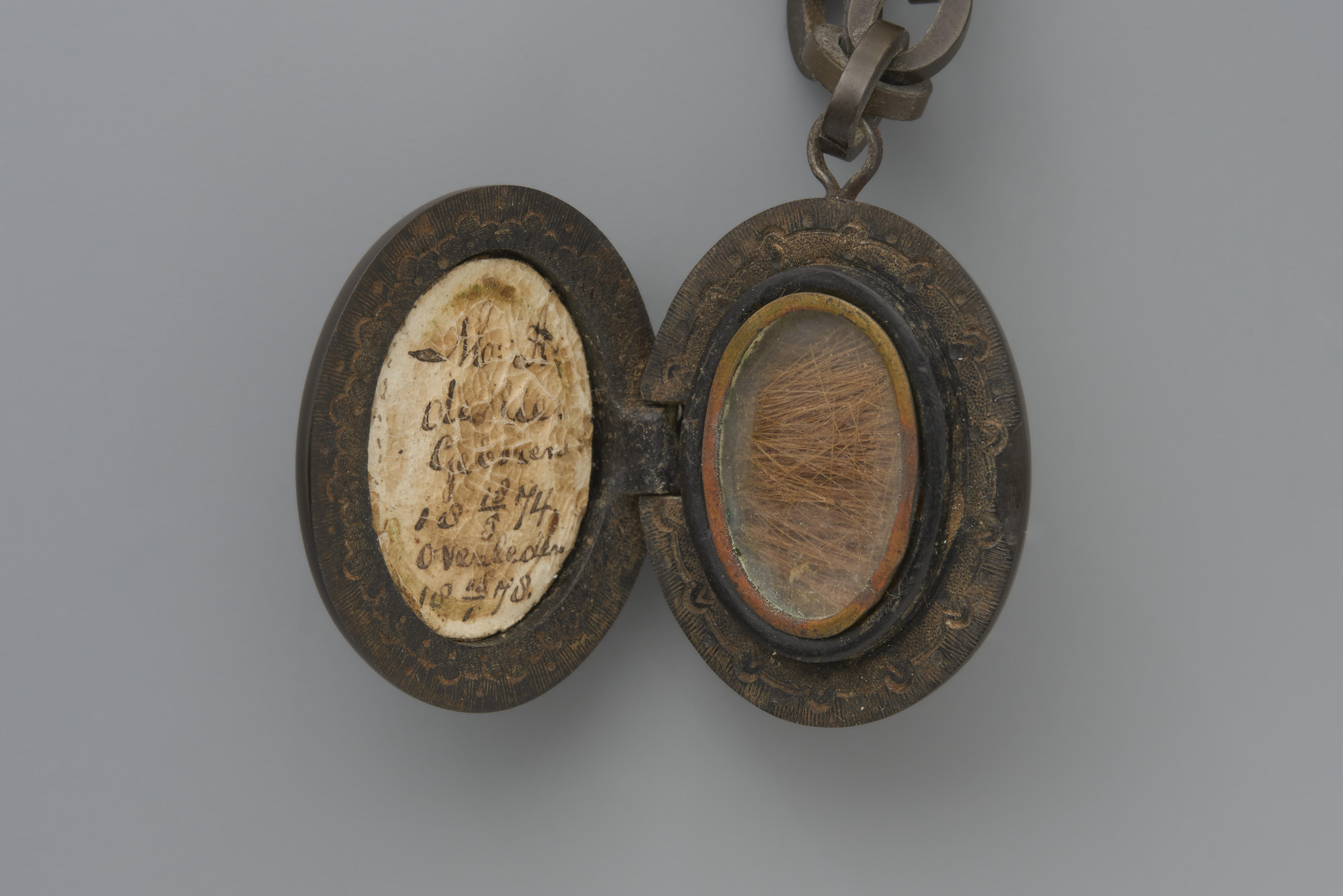 Schakelketting met medaillon, vermoedelijk vervaardigd van bog oak (fossiel hout). In het medaillon staan de naam ‘Margaretha Aagje de Mie’ en de data ‘18-5-1874’ en ‘15-1-1878’. In de andere kant van het medaillon zit een blonde haarlok. Margaretha Aagje was het tweede kind en de eerste dochter van apothekersbediende Dirk de Mie en zijn vrouw ...