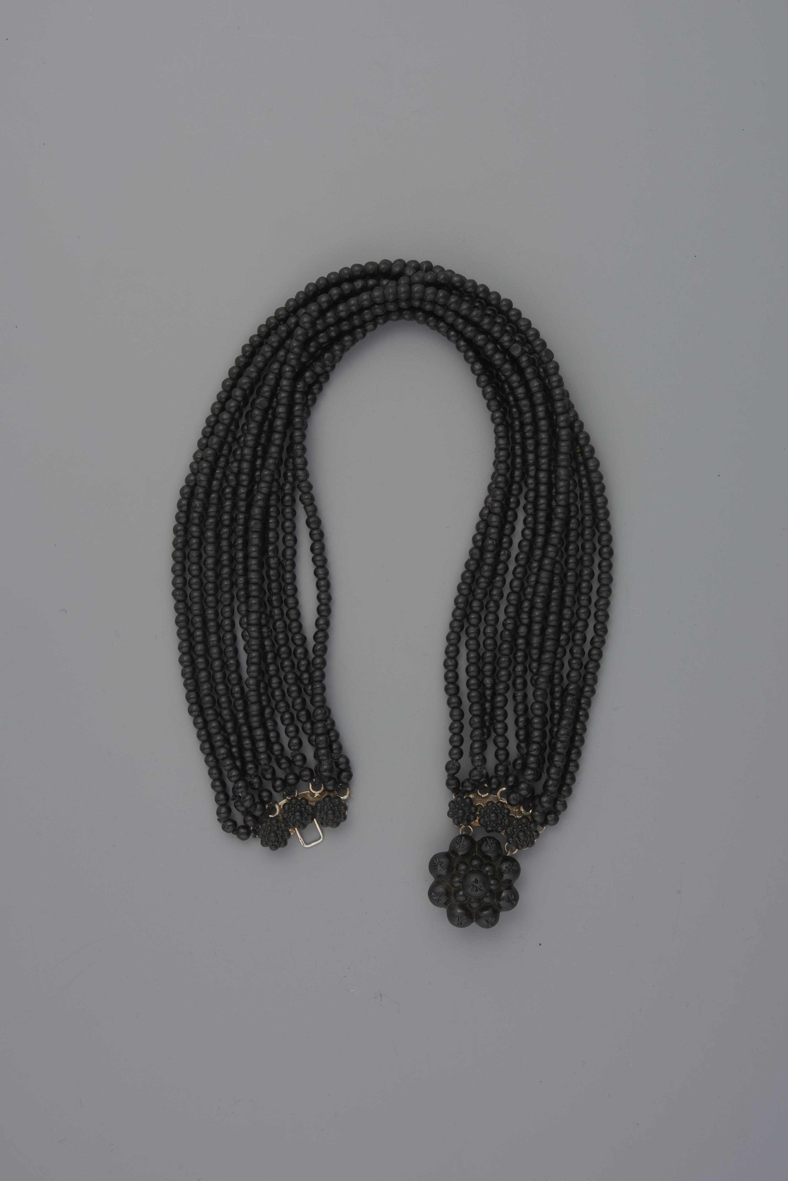 Halssnoer van tien strengen glazen kralen aan een zogenaamd braamslot. Aan de achterkant is het slot van zilver. Het halssnoer is gedragen door een vrouw uit Arnemuiden bij de rouwdracht. Dit type halssnoer komt omstreeks 1910-1930 veel voor op Walcheren en in Arnemuiden en is ook op Zuid-Beveland en de Zuid-Hollandse eilanden gedragen. De sluiting ...