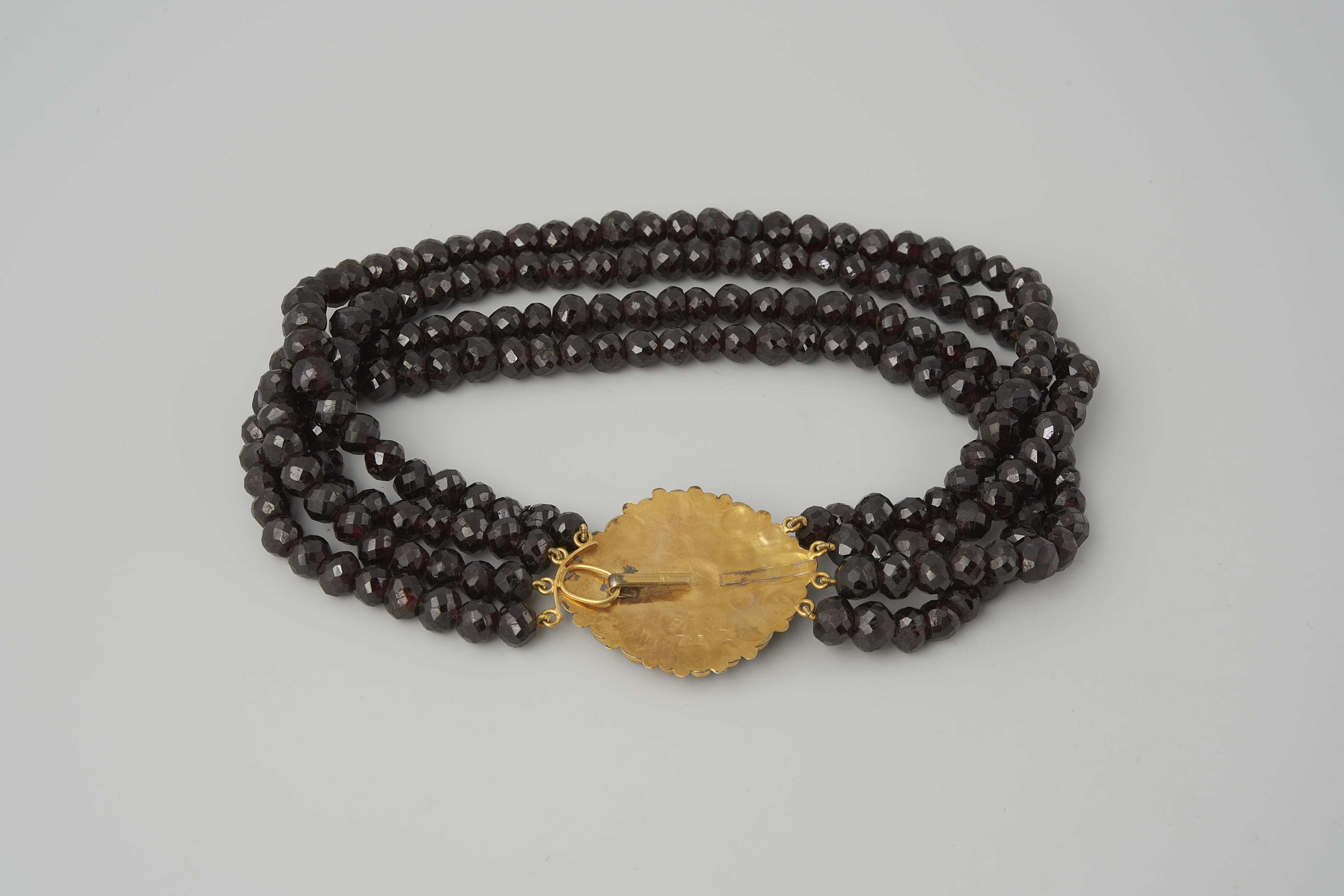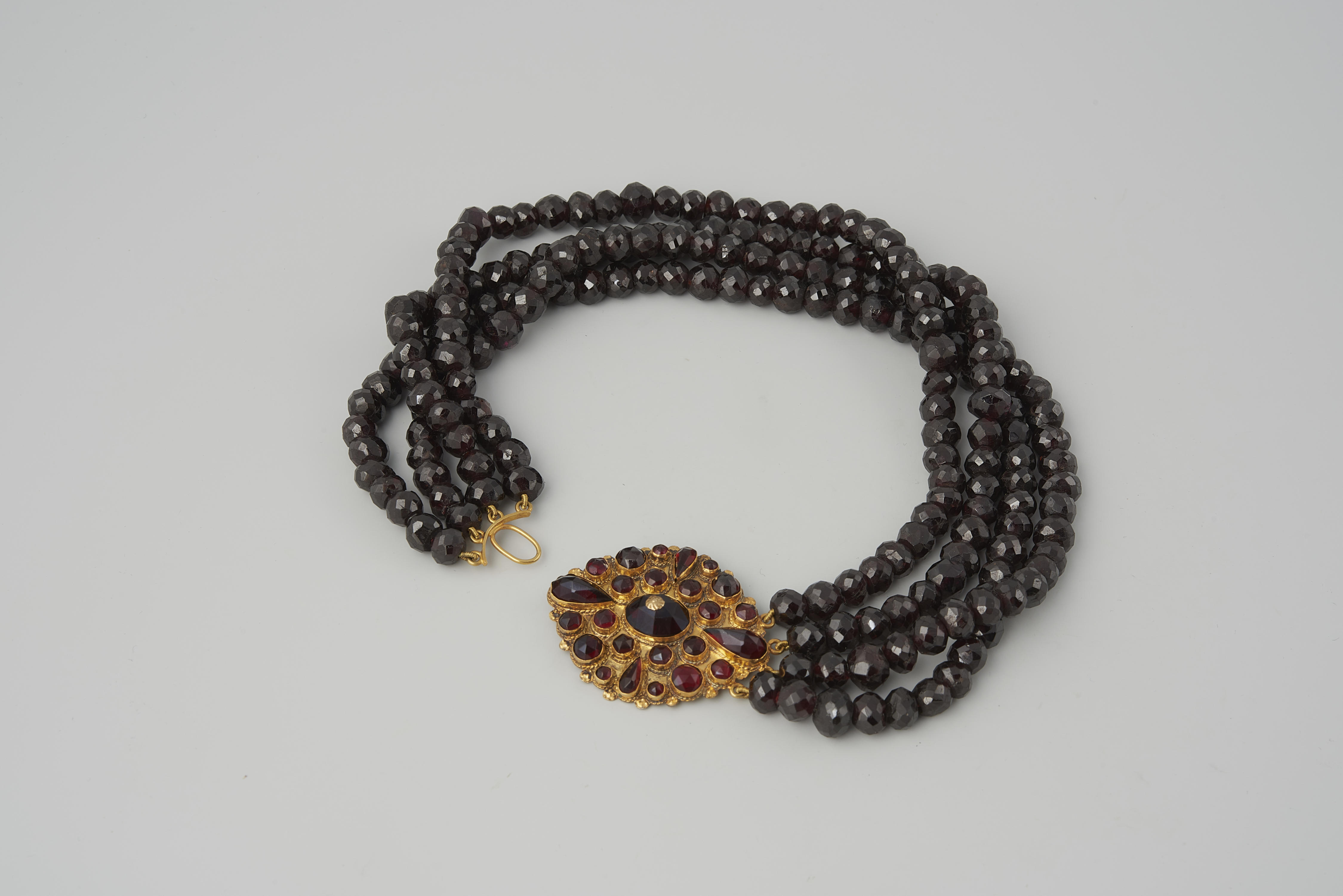 Dit halssnoer bestaat uit vier strengen granaten kralen en een ongewaarborgd gouden slot. Het is gedragen door een vrouw van het eiland Walcheren. Het slot is omstreeks 1875 gemaakt door Evert Schotman uit Dordrecht.