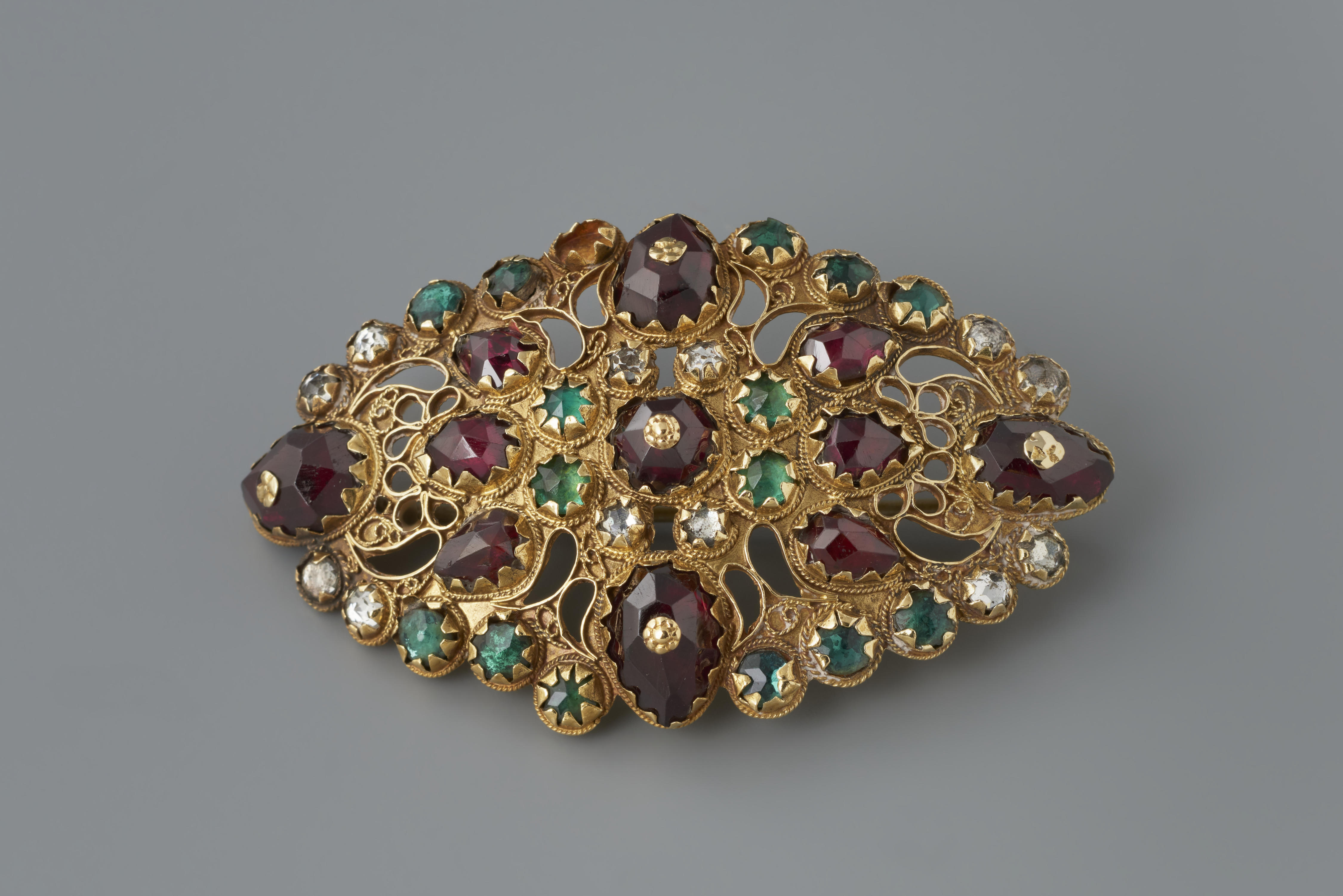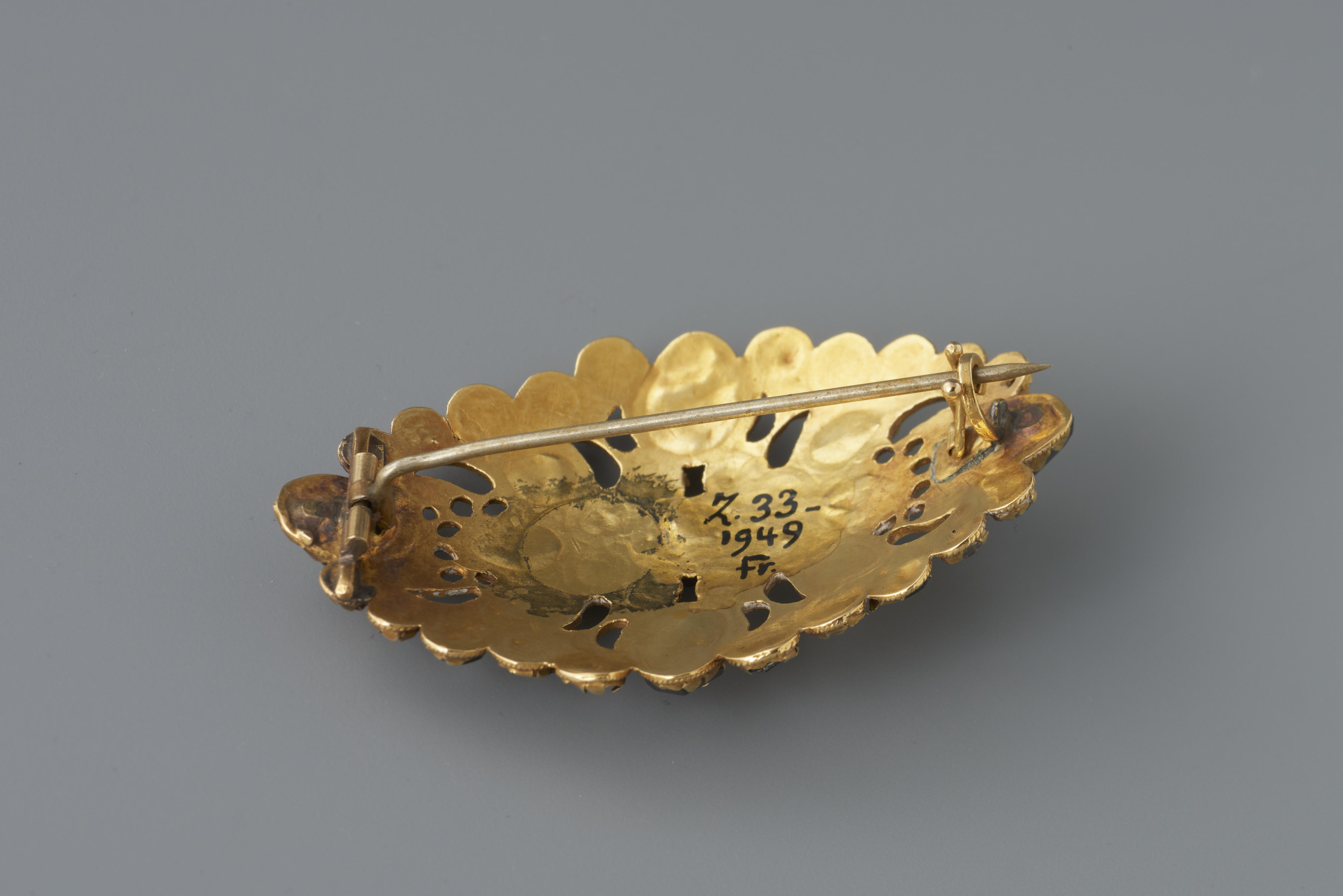 Deze gouden broche is waarschijnlijk oorspronkelijk het slot van een halsketting geweest. Het slot is gemaakt omstreeks 1830-1840. De vervaardiger is onbekend.
