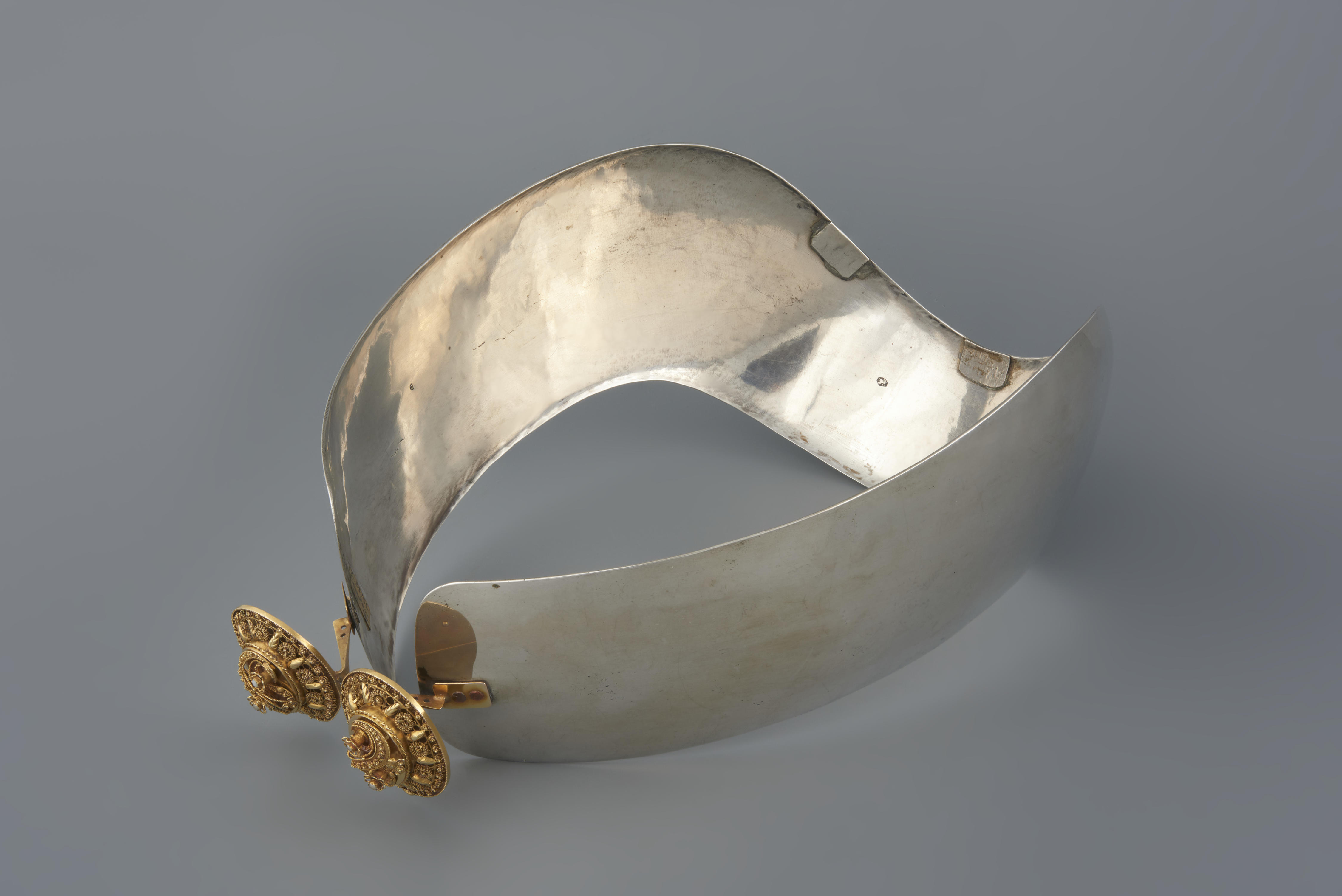 Zilveren oorijzer met 14-karaats gouden 'boeken', gedragen door een vrouw in streekdracht uit Scheveningen. Naast de oorijzers met ovale 'boeken' werden in Scheveningen ook oorijzers met 'stukken' gedragen. De boeken zijn versierd met parels. In de aanzetten van de boeken zitten twee gaatjes, waardoor spelden gestoken kunnen worden om de muts aan het oorijzer vast ...