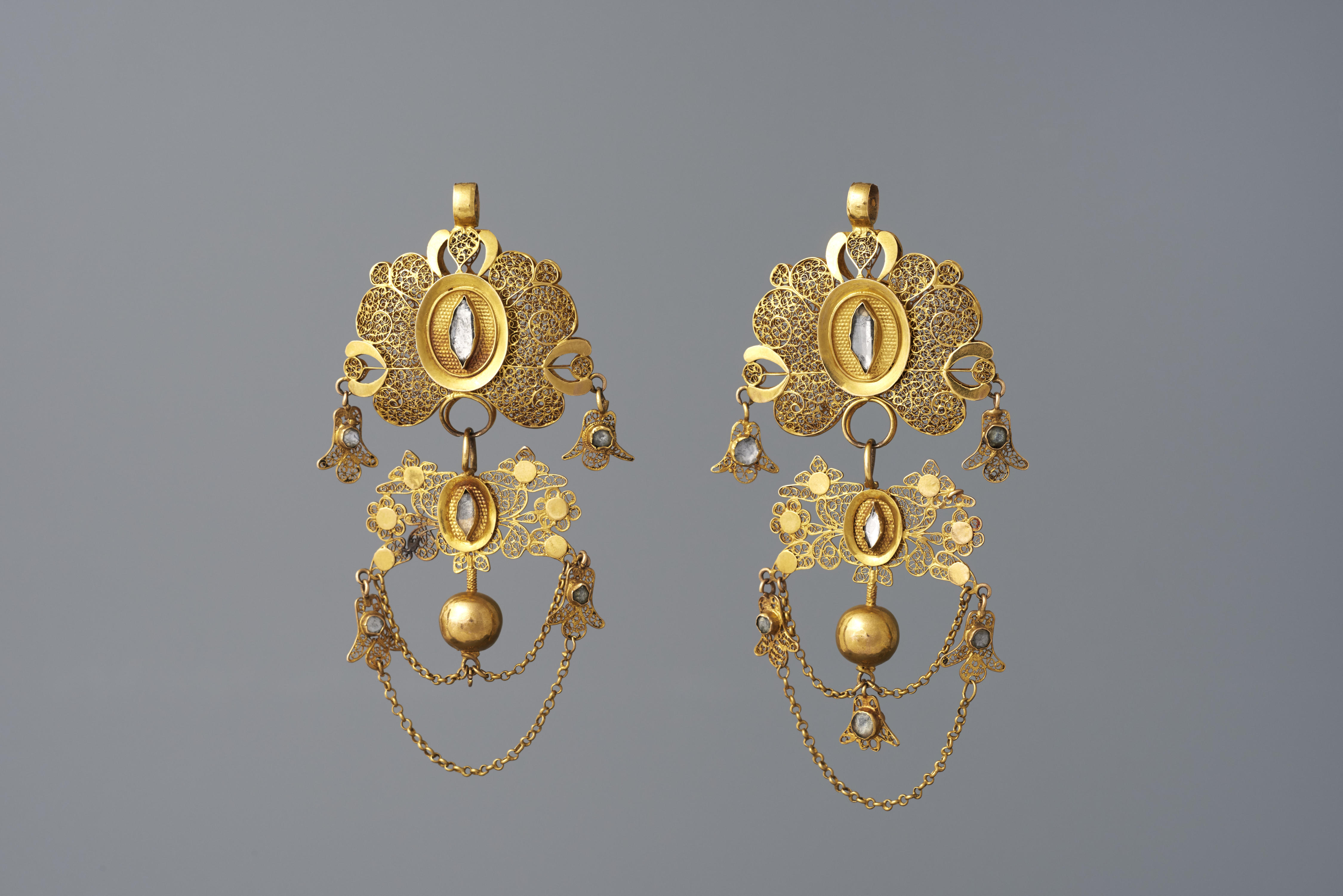 Deze hangers van 14-karaats goud worden ook wel 'spiegelbellen' genoemd. Ze werden als versiering aan de krullen van het oorijzer gedragen. Spiegelbellen werden alleen op Tholen gedragen. De hangers zijn vóór 1856 vervaardigd door Hendrik Minné uit Delft. Ze hebben een gehaltemerk van ná 1853.