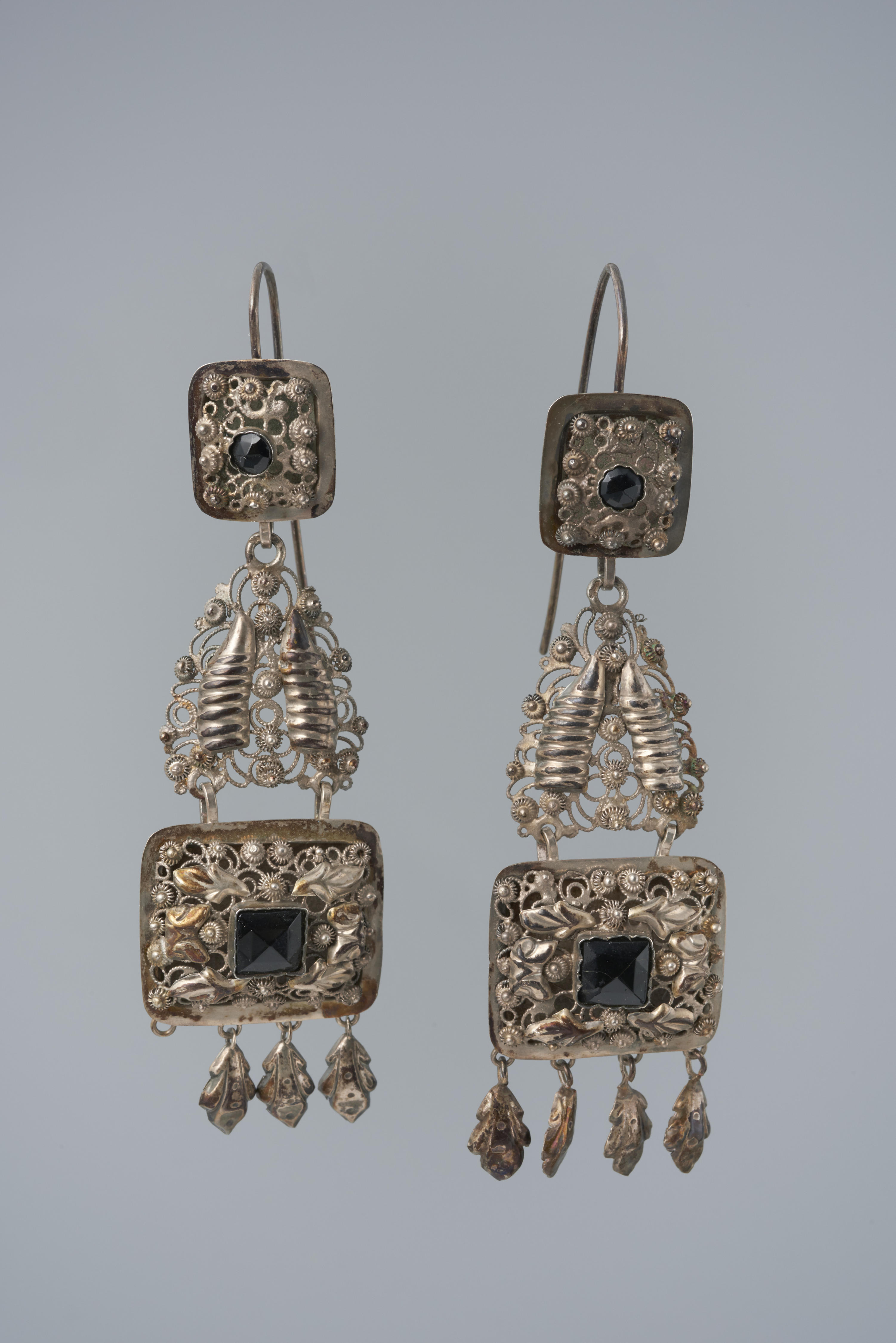 Paar zilveren 'steenbellen' uit omstreeks 1870. De bellen zijn gedragen door een vrouw uit Cadzand bij de rouwdracht. Ze worden in een lusje in de ondermuts gehaakt en hangen langs de wangen in de voorstrook van de muts. De vervaardiger is onbekend. Zilveren steenbellen voor de rouw zijn zeldzamer dan de reguliere gouden steenbellen.