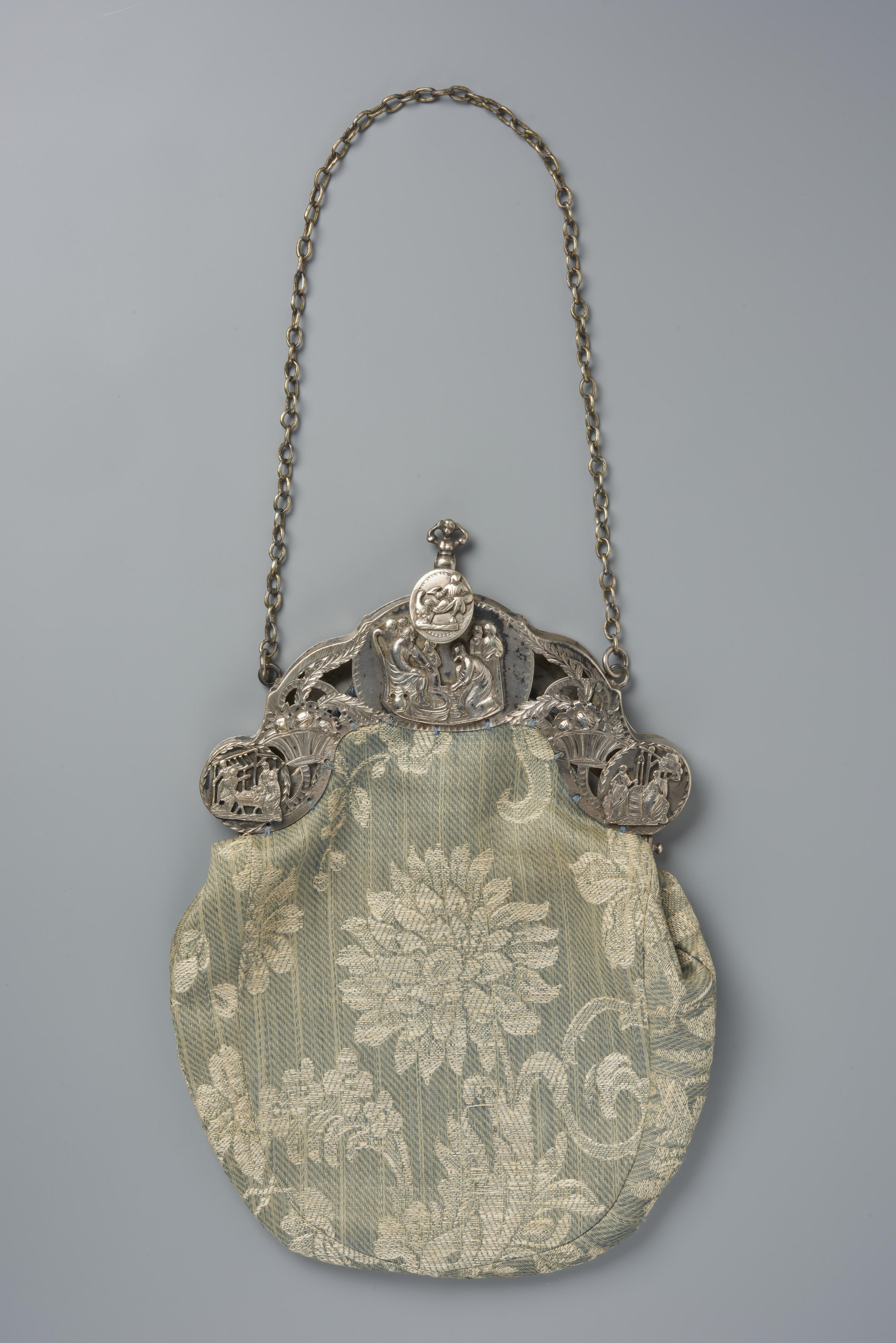 Beugeltas met draagketting. De tasbeugel is verworven zonder tas. In het museum is de tasbeugel van een damasten tas voorzien. De tasbeugel heeft een jaarletter die gebruikt is tussen 1807 en 1809 en een gehaltemerk dat gebruikt is tussen 1807 en 1812. Hij is vervaardigd door H.P. Fleringa in Leeuwarden. In de achterkant van de ...