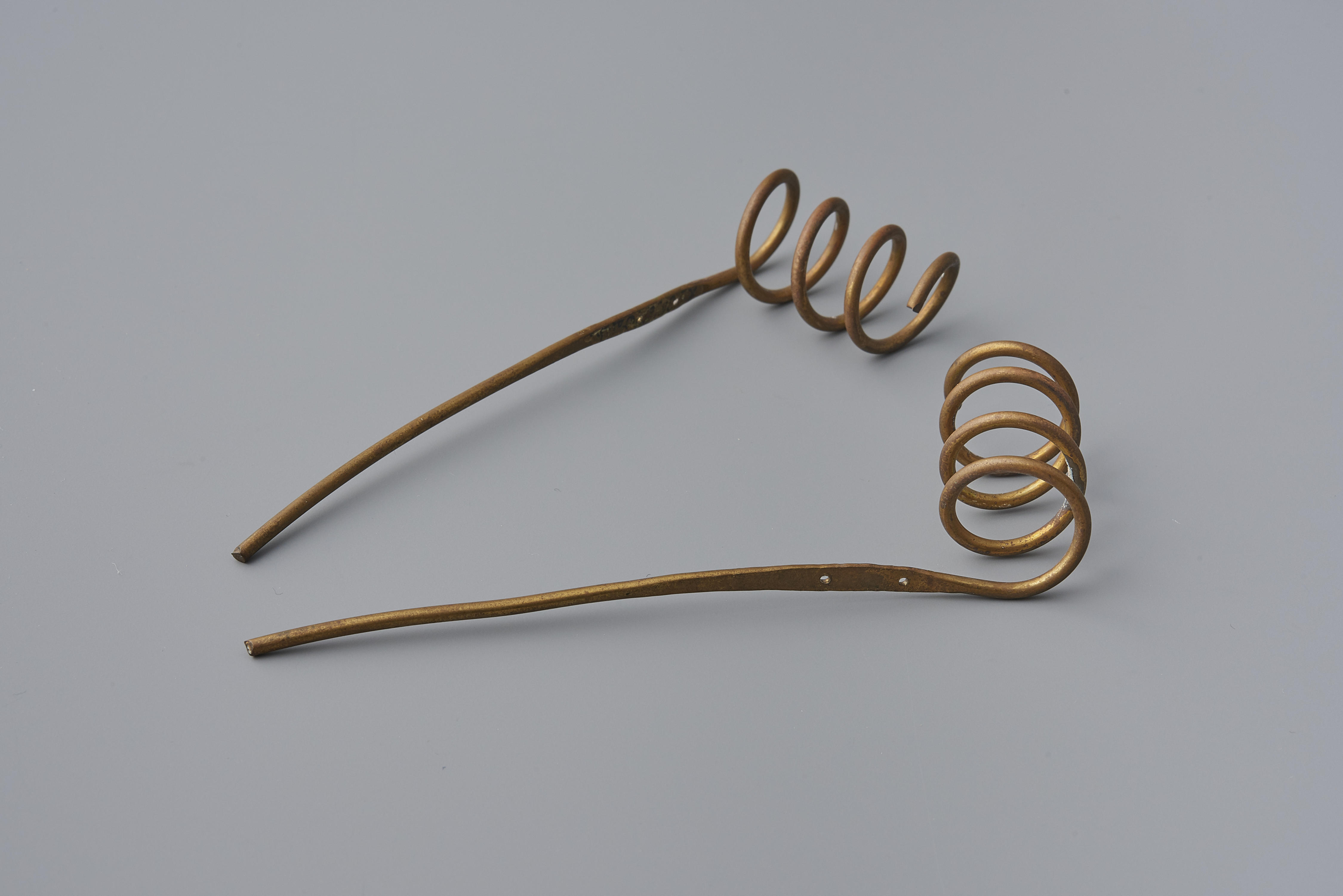 Twee losse messing oorijzerkrullen, afkomstig van een oorijzer dat gedragen is door een vrouw in streekdracht van Walcheren. De krullen hebben vier windingen. In de aanzet van de krullen zitten twee gaatjes. Door deze gaatjes kunnen spelden worden gestoken om de oorijzeruiteinden in de ondermuts vast te maken.