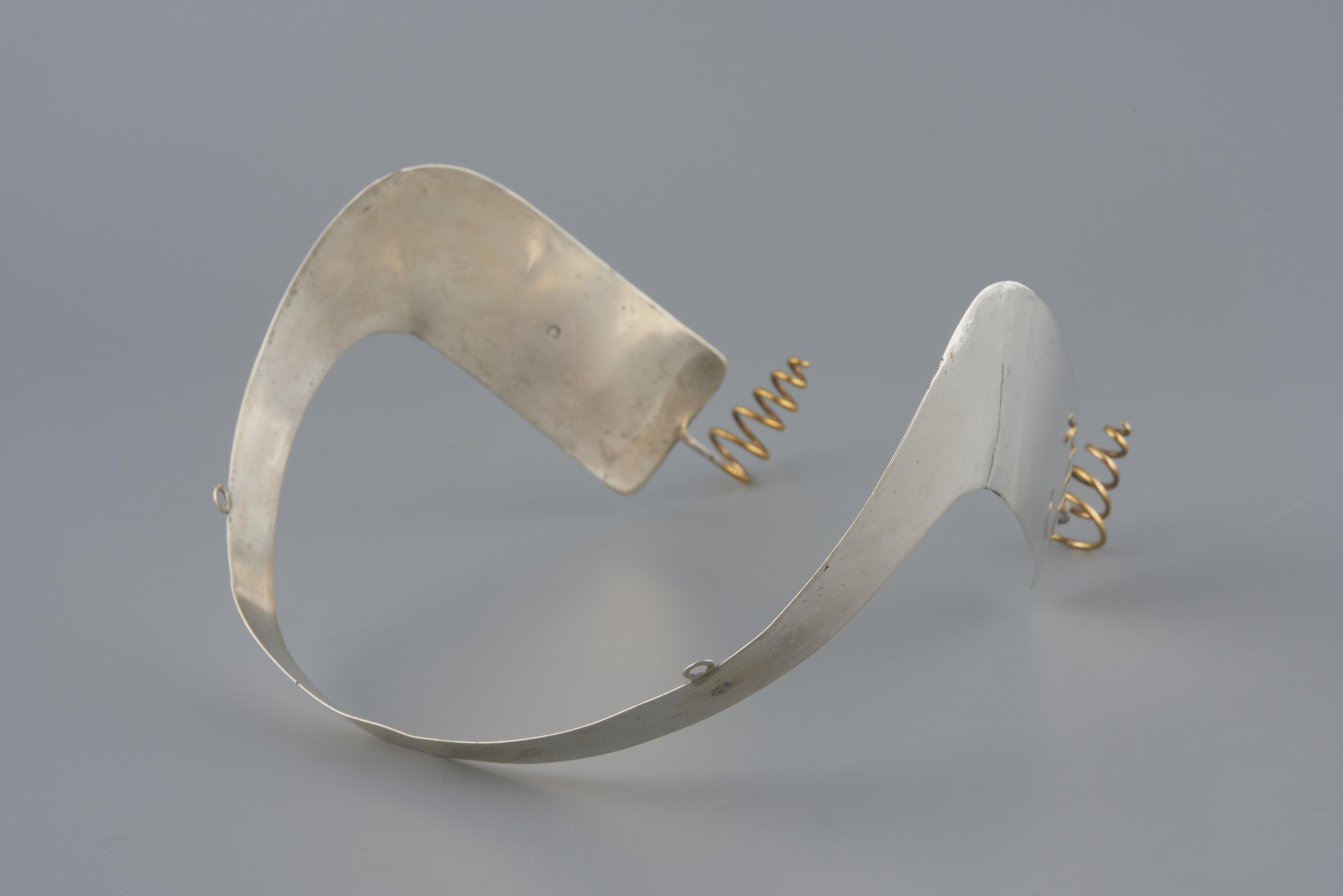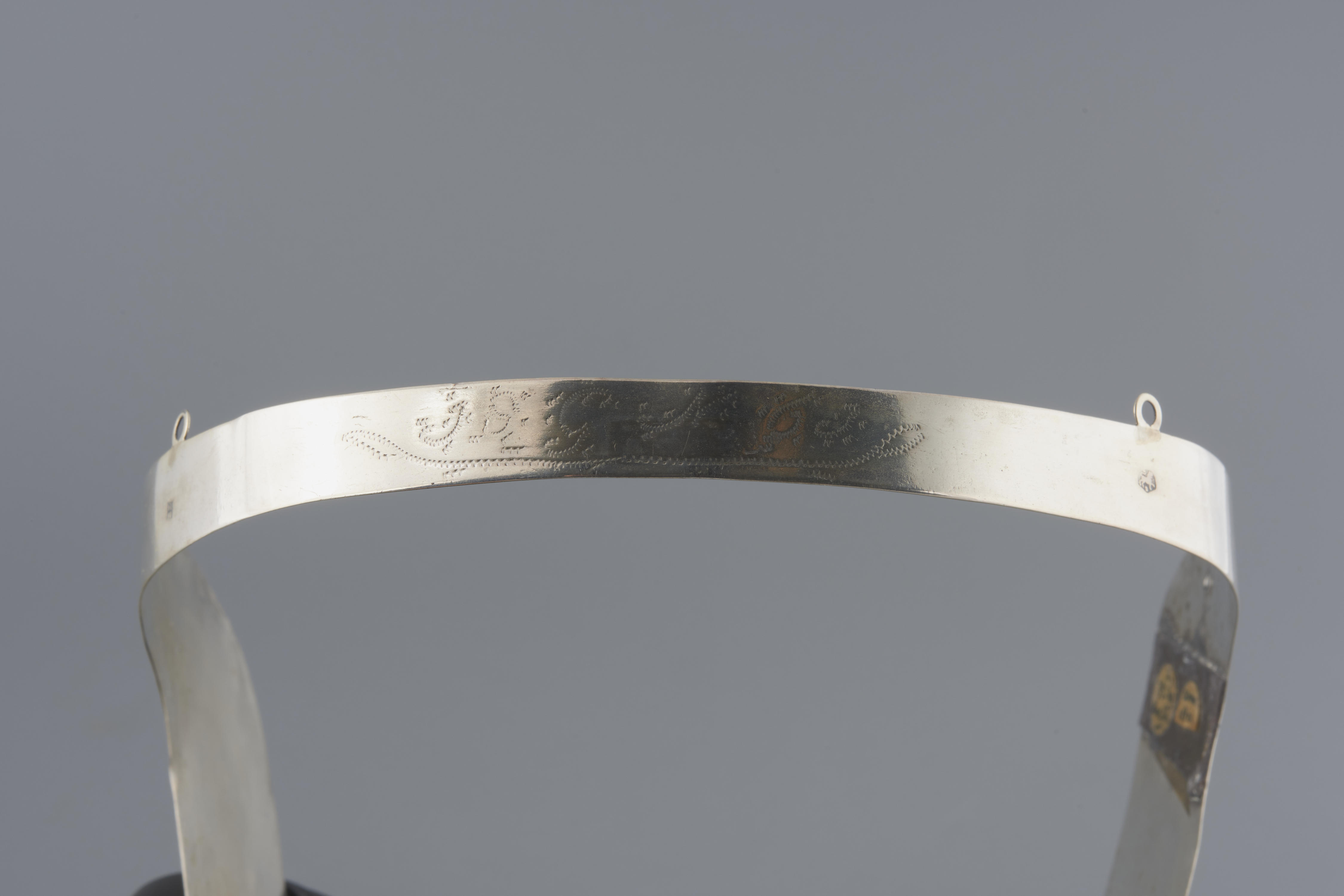 Zilveren oorijzer met gouden krullen. Het oorijzer is vermoedelijk gedragen door een vrouw van de Noord-Veluwe. Op de achterkant staan de initialen ‘GM’ en het jaartal ‘1861’ gegraveerd. Het ijzer is in 1861 gemaakt door de zilversmid J.W. Töpfer uit Kampen.