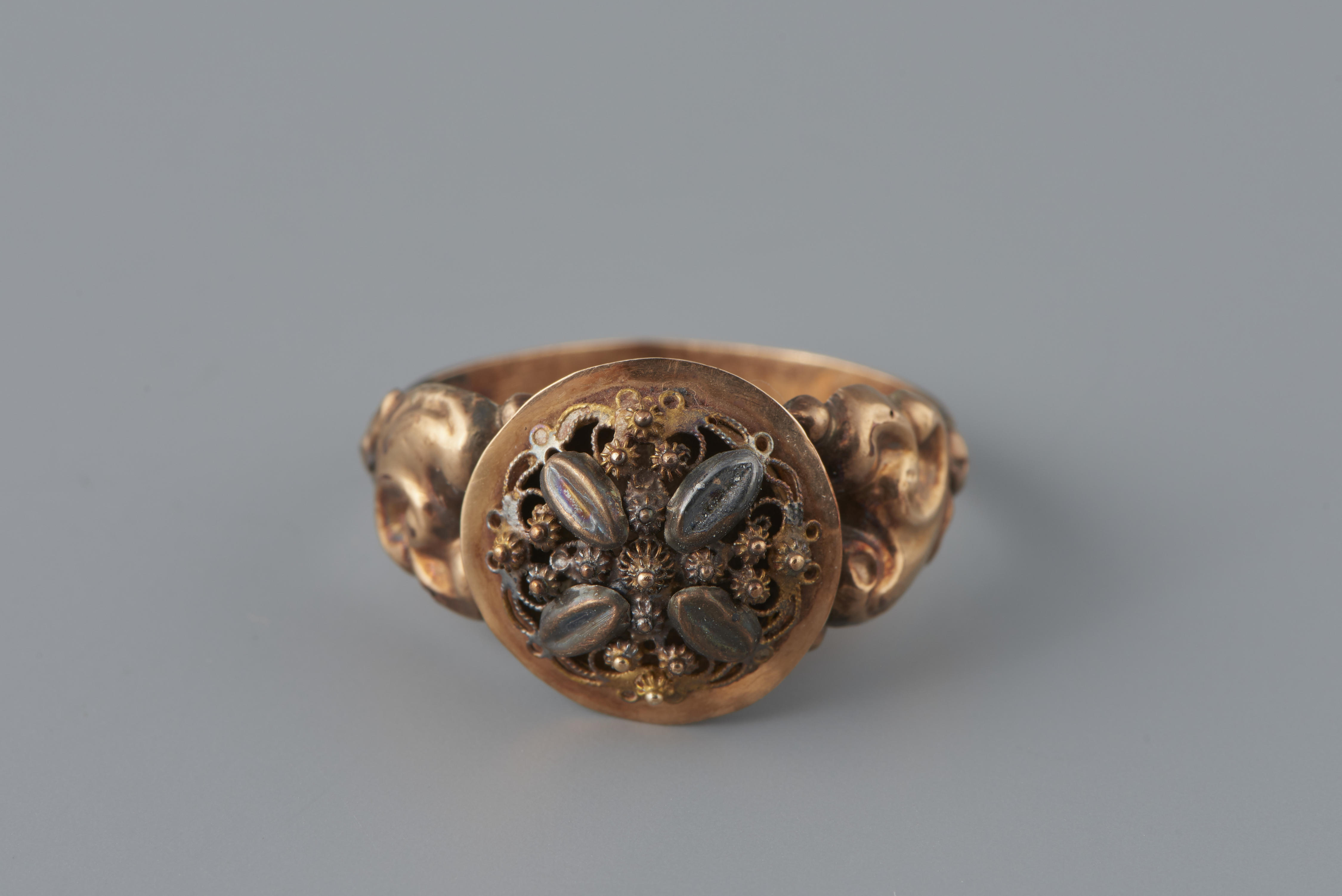 Ring van 14-karaats goud, gedragen door een vrouw uit Noord-Brabant. Dit type is niet specifiek streekgebonden en werd ook buiten Noord-Brabant gedragen. De vervaardiger is onbekend. De ring heeft een gehaltemerk dat gebruikt is tussen 1853 en 1906.