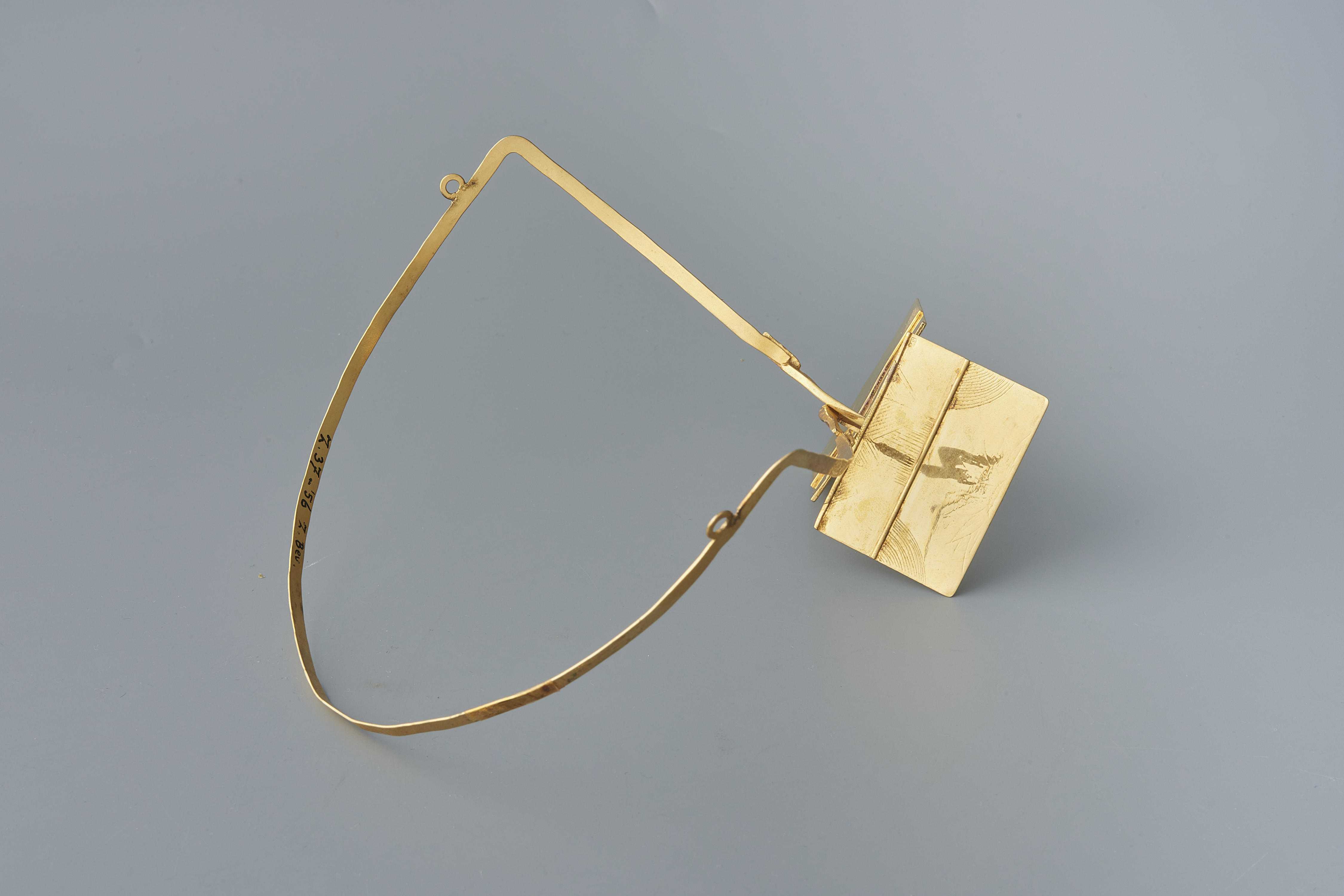 Oorijzer, gedragen door een meisje in Zuid-Bevelandse streekdracht. Het oorijzer bestaat uit een vergulde messing beugel en twee vergulde messing ‘stikken’ (rechthoekige oorijzeruiteinden). De stikken zijn aan de achterzijde versierd met graveerwerk. Op de stikken staat het merk JT. Het merk JT schijnt in gebruik geweest te zijn bij een koperslager die aan het eind ...