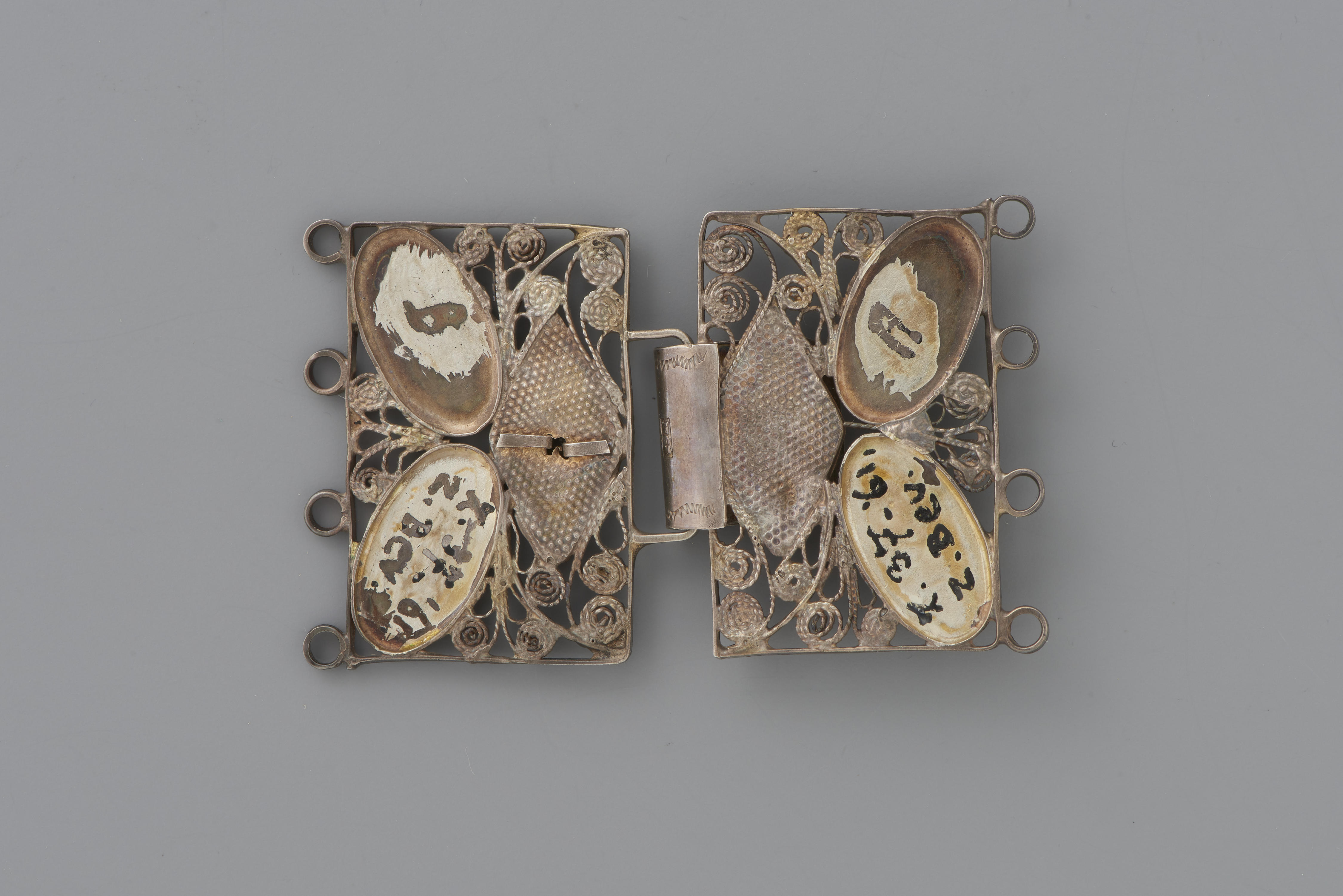 Haak en oog van ongewaarborgd zilver uit omstreeks 1870. Bij binnenkomst in het museum is het object toegeschreven aan Zuid-Beveland. Het zou gedragen zijn als sluiting van de 'nette', een wollen omslagdoek. Het kan ook een mantelineslotje uit Zeeuws-Vlaanderen zijn. Dit model komt op Zuid-Beveland weinig voor in zilver. Meestal waren netteslotjes daar van goud. ...