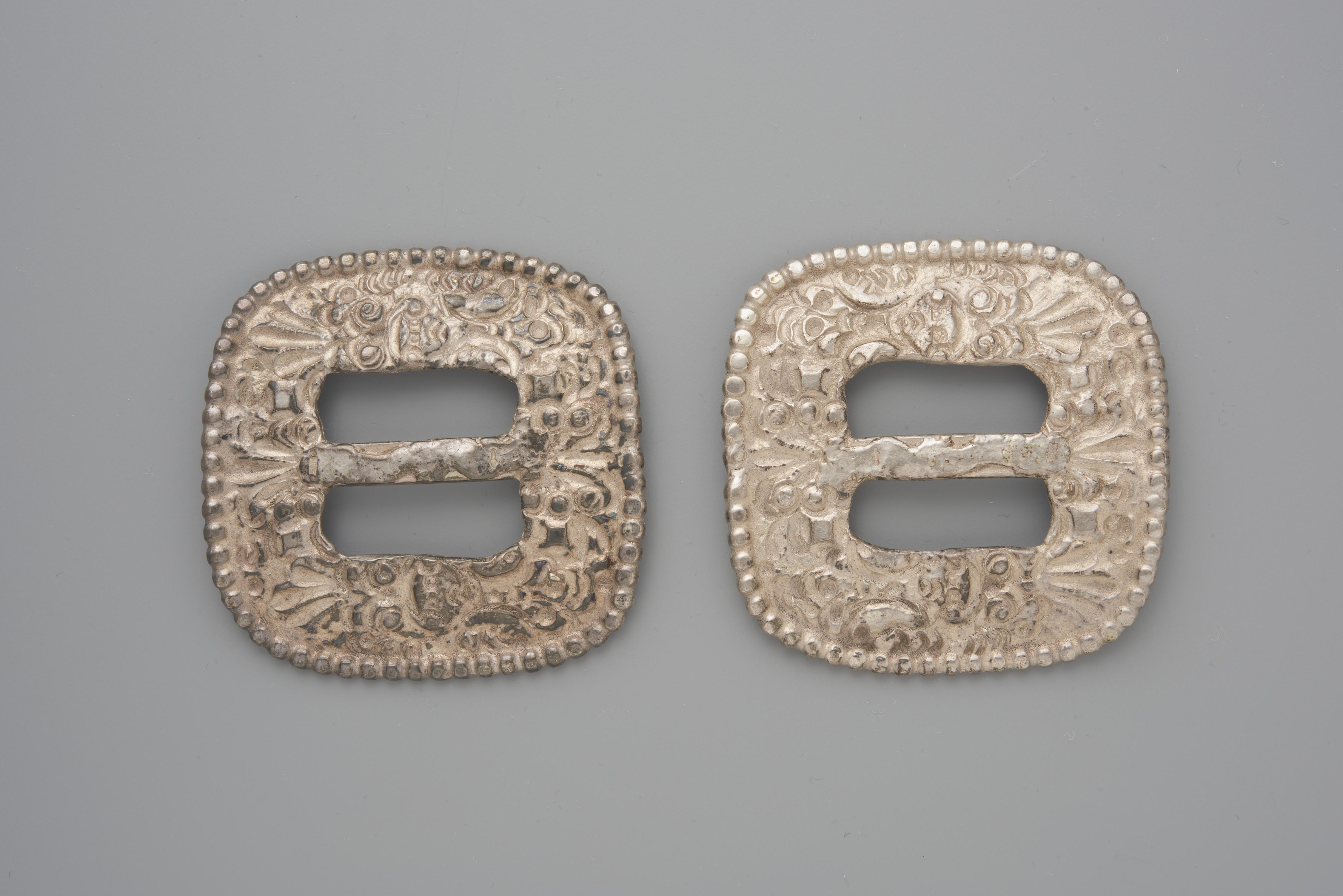 Paar zilveren schoengespen, door het museum in nieuwe staat verworven in Staphorst. De gespen kunnen gedragen worden door meisjes bij opknapdracht en kerkdracht en door vrouwen bij opknapdracht. Ze zijn in 1969 gegoten door J. Weeda in Haarlem, waarschijnlijk in opdracht van de Staphorster zilversmid Drost.