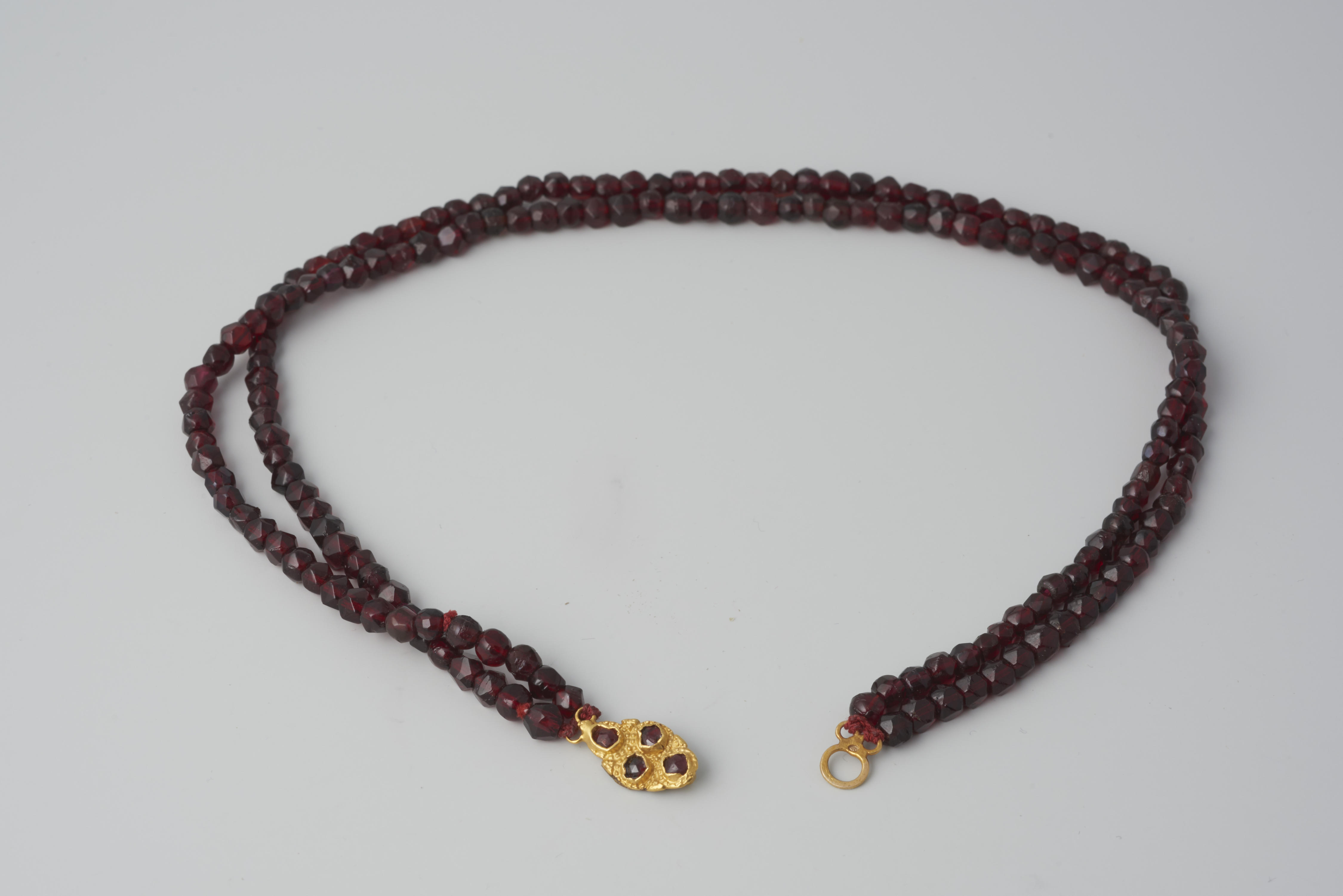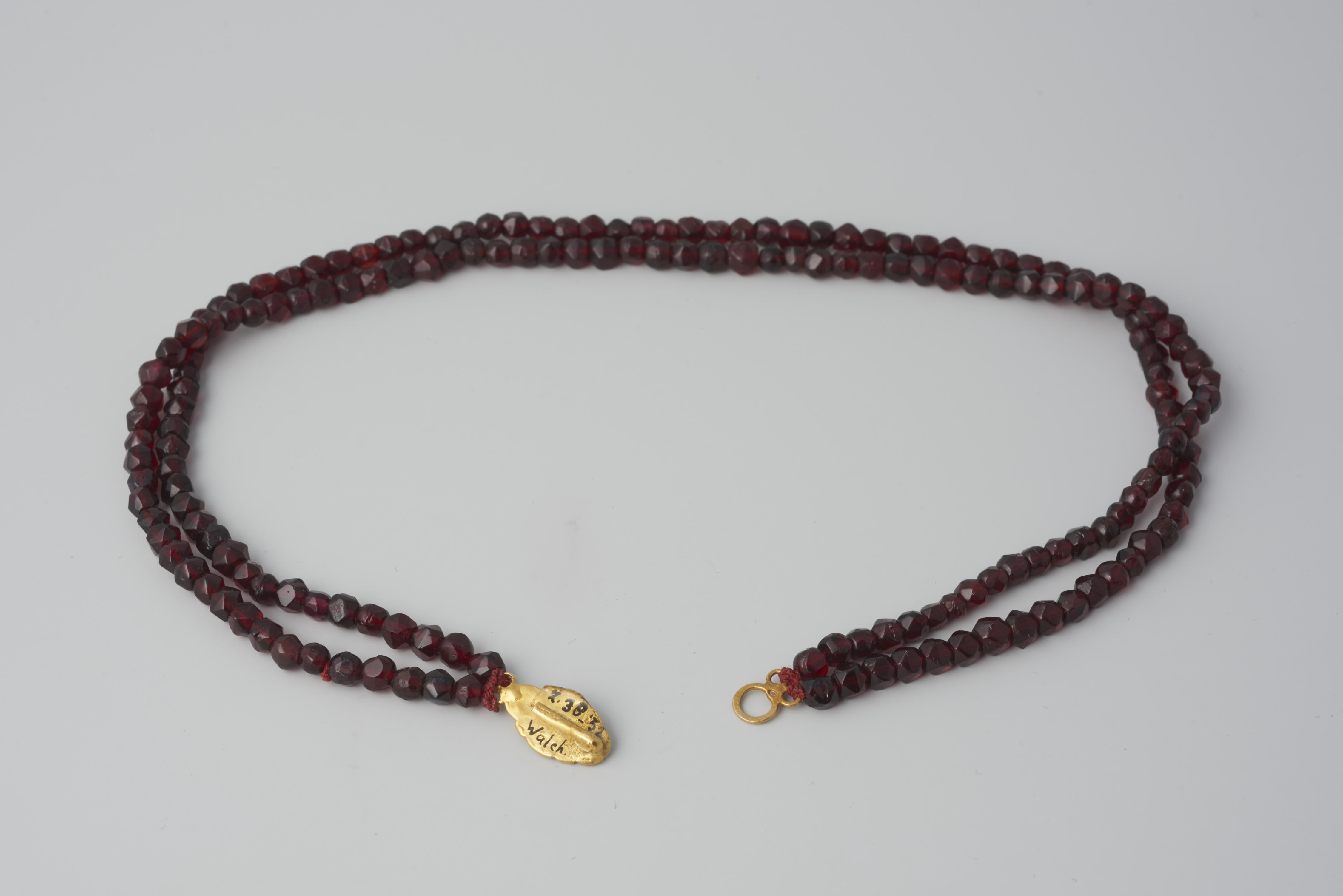 Halssnoer, bestaande uit twee strengen glazen kralen aan een 14-karaats gouden slot. Het slot is in 1952 verworven zonder kralen. In 1966 zijn de kralen door het museum aan het slot gezet. Het slot is gedragen door een vrouw van het eiland Walcheren. Het is mogelijk eind achttiende-eeuws of begin negentiende-eeuws en in de tweede ...