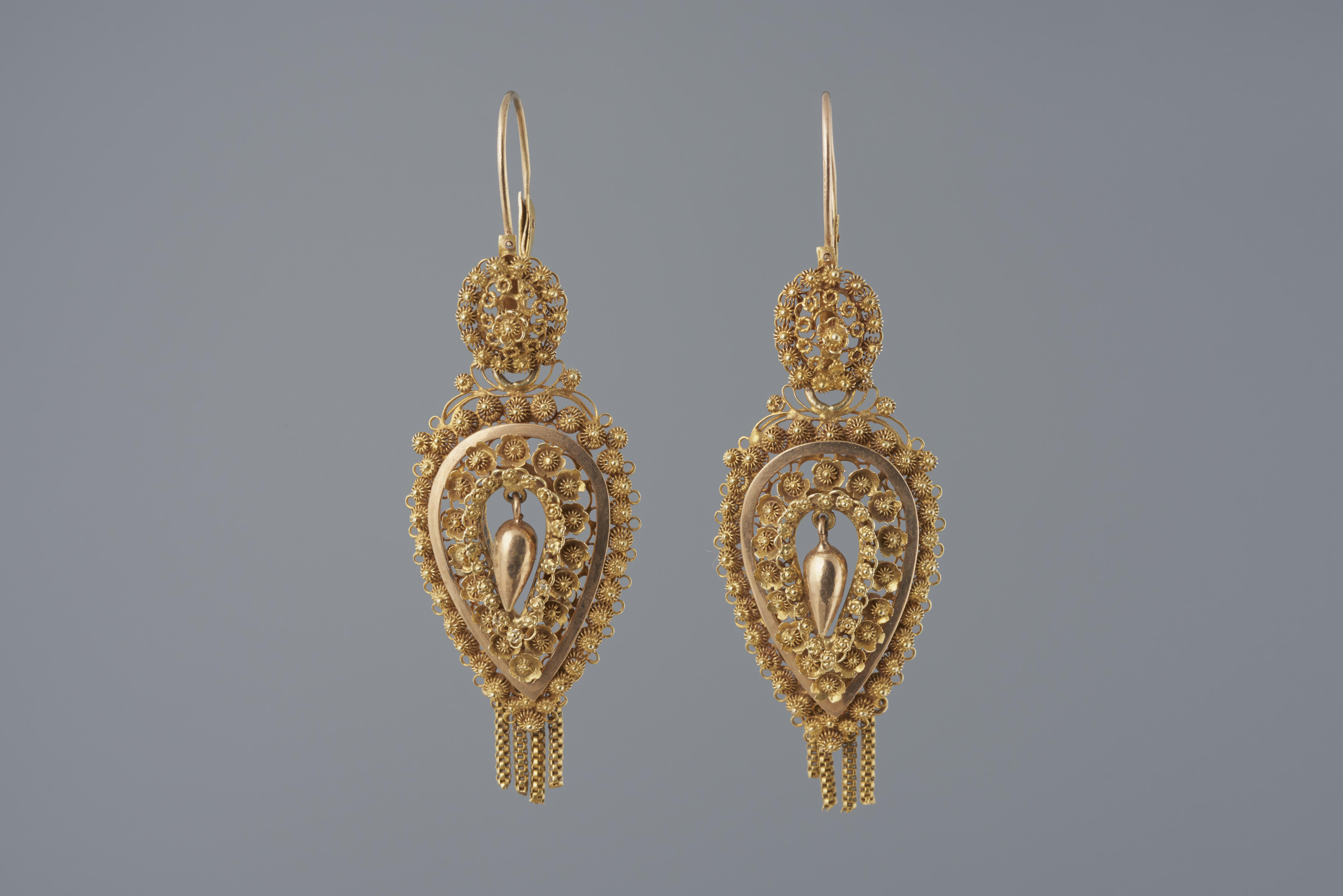 Paar 14-karaats gouden oorbellen, gedragen door een vrouw uit Zuid-Holland. Dit type hanger is niet specifiek voor één bepaalde plaats of streek. Het werd bijvoorbeeld ook als oorijzerhanger gebruikt in Vlaardingen en Rijn- en Delfland.
