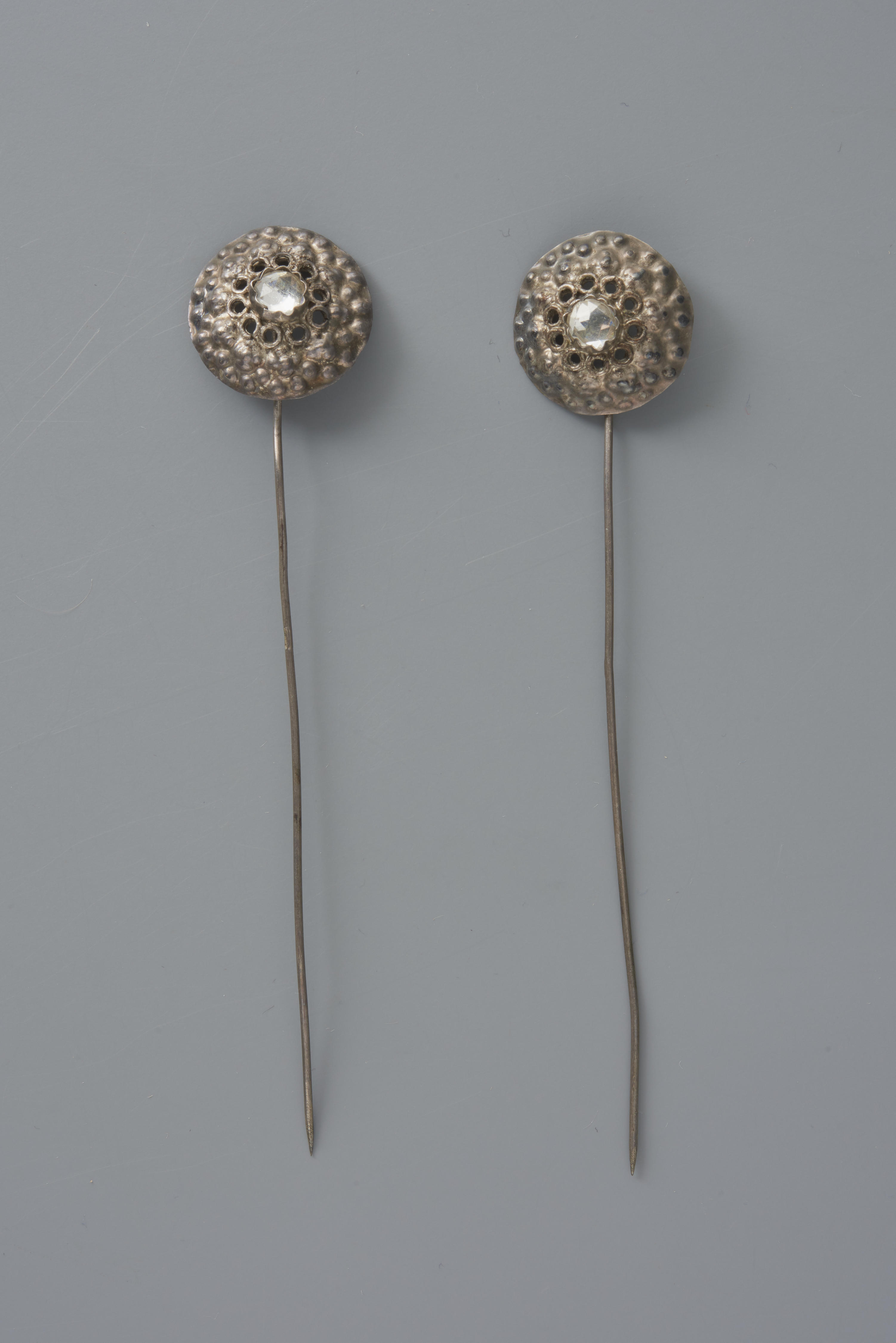 Een paar kapspelden, gedragen door een vrouw in streekdracht uit de provincie Groningen. De spelden hebben een zilveren steekspeld en een geperste zilveren kop, voorzien van een imitatie-diamant van geslepen glas. De vervaardiger is onbekend, want de kapspelden dragen geen meesterteken.