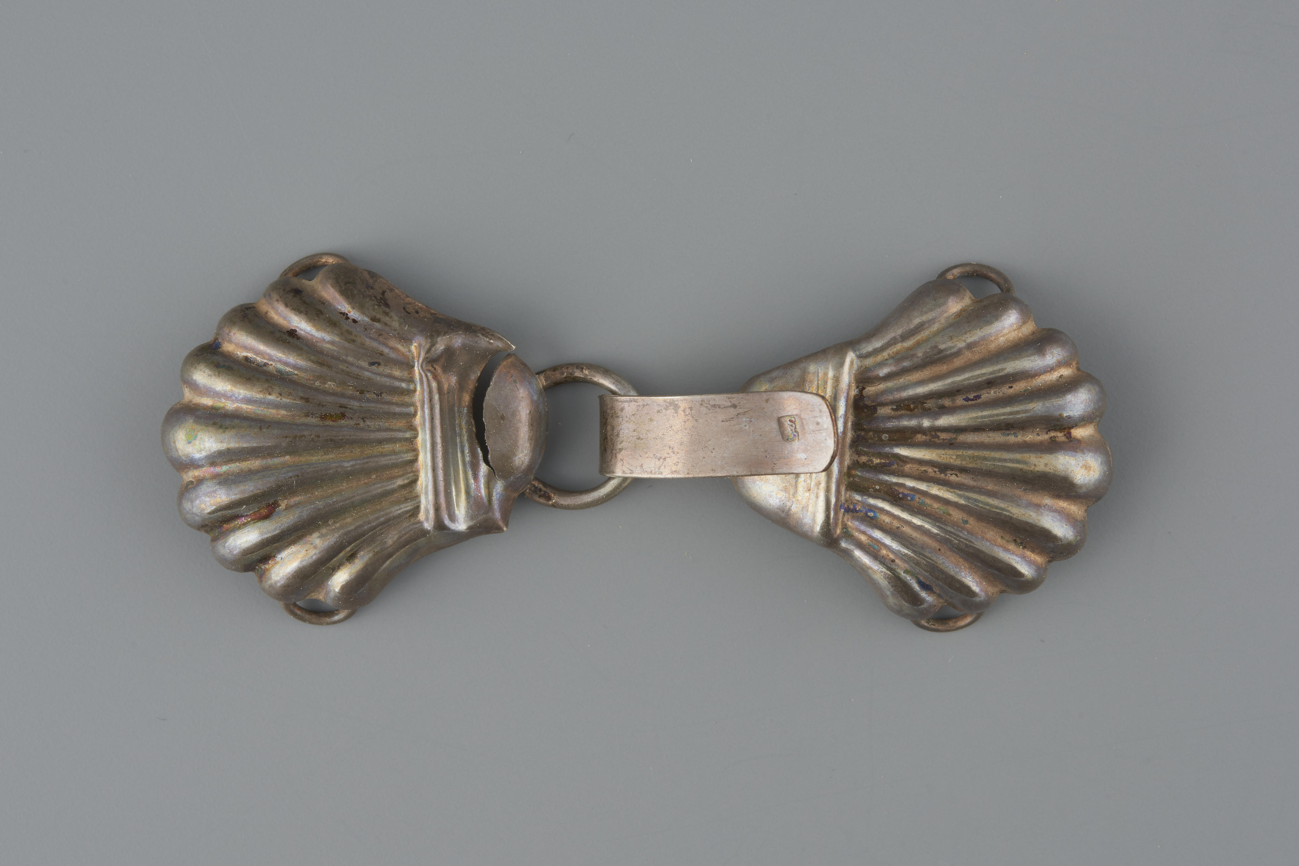 Mantelinehaak van ongewaarborgd zilver, gedragen in Cadzand. De manteline is een lang en ruim overkleed van zwart laken zonder mouwen, een soort cape met capuchon. Mantelinehaken bestaan zowel in goud als in zilver. Het meesterteken is wellicht van edelsmid T. Snoep uit Goes, werkzaam tussen 1838-1853.