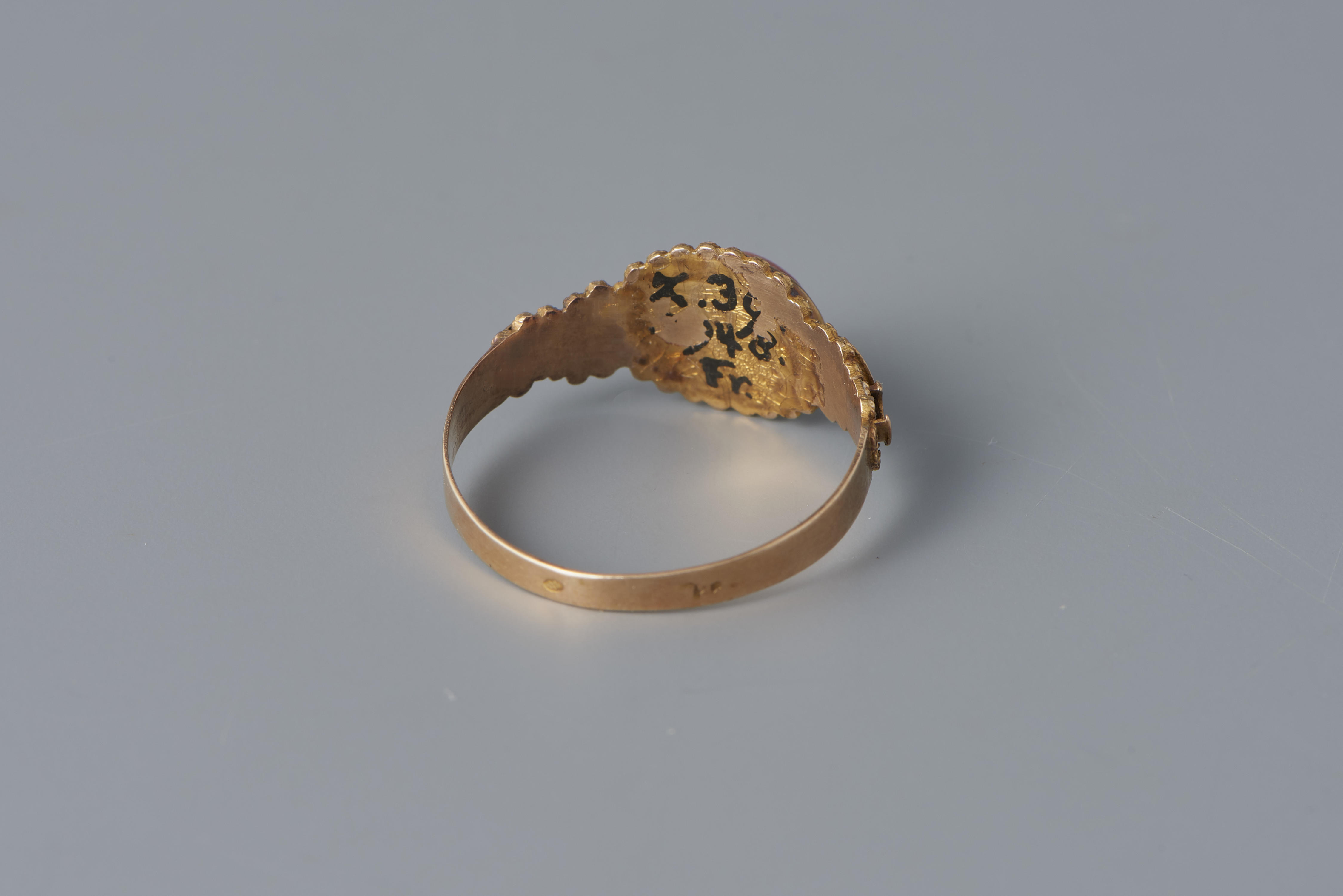 Ring van 14-karaats goud met bloedkoraal, gedragen in Friesland. Dit type is niet specifiek voor een bepaalde plaats of streek en kan ook bij algemene modedracht gedragen zijn. De vervaardiger is onbekend. De ring heeft een gehaltemerk dat gebruikt is tussen 1853 en 1906.