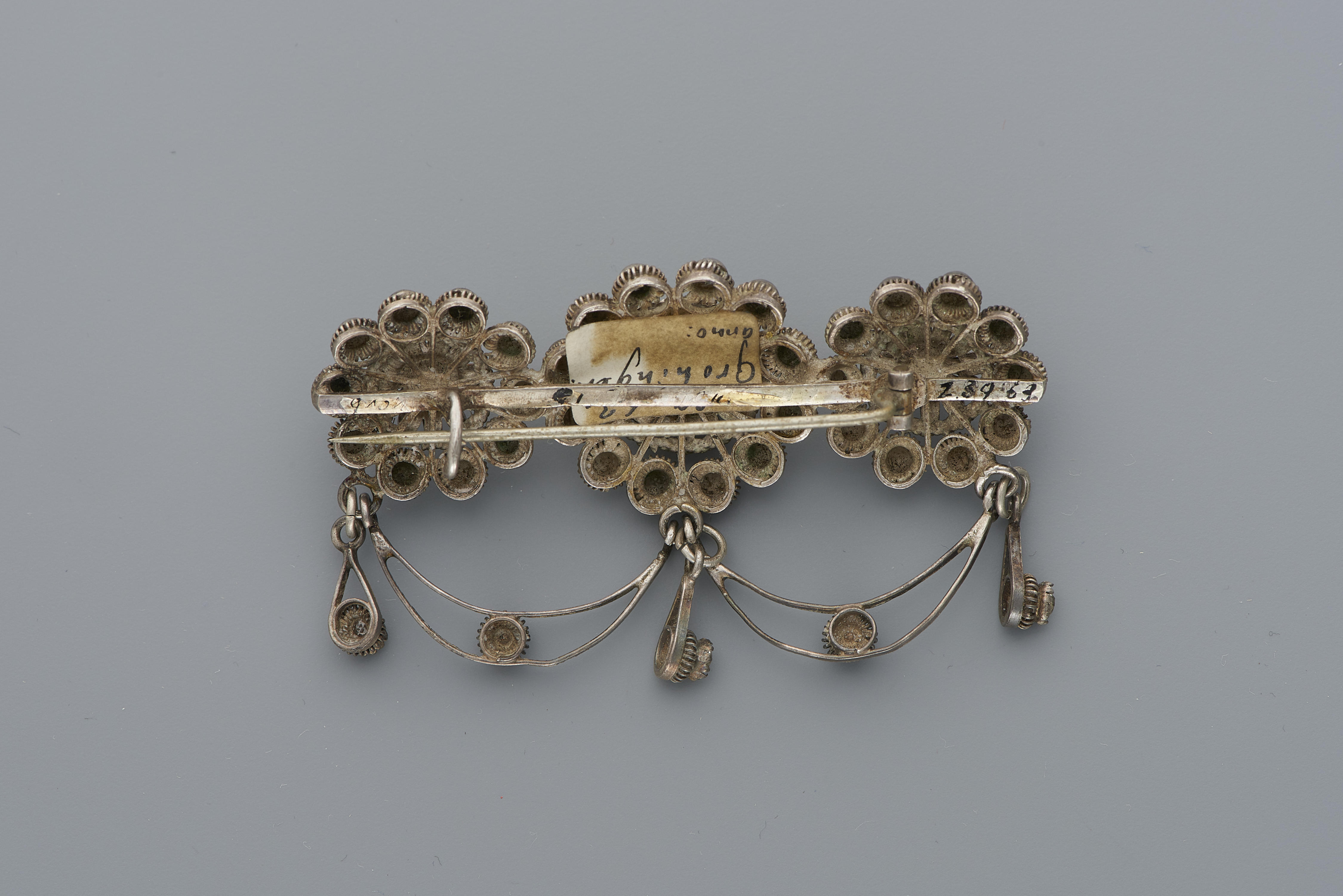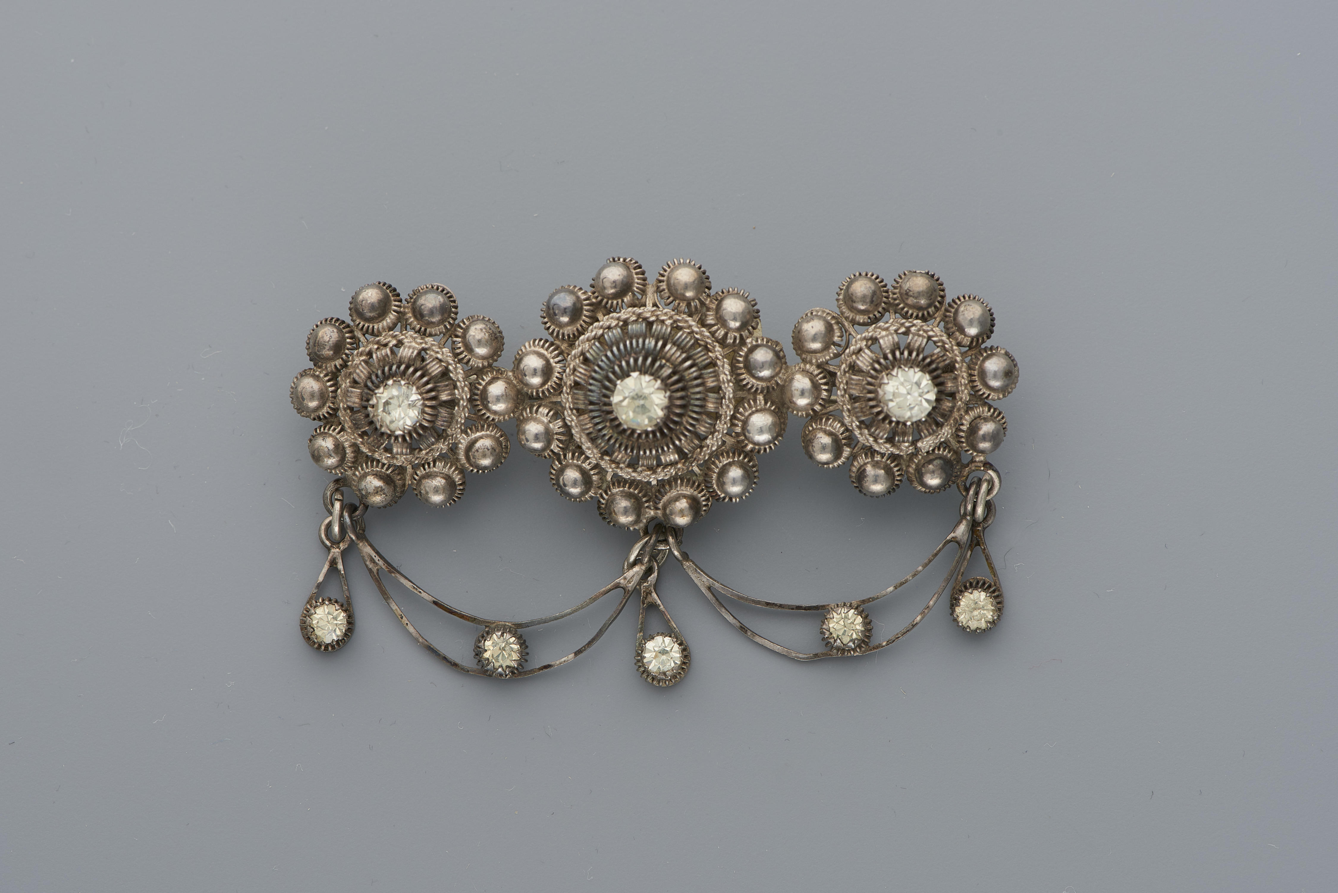 Zilveren broche met imitatiediamantjes van geslepen glas. De broche is gedragen door een vrouw uit de provincie Groningen. Ze is omstreeks 1910 gemaakt door C. Wendels in Schoonhoven. Dit type is niet specifiek streekgebonden.
