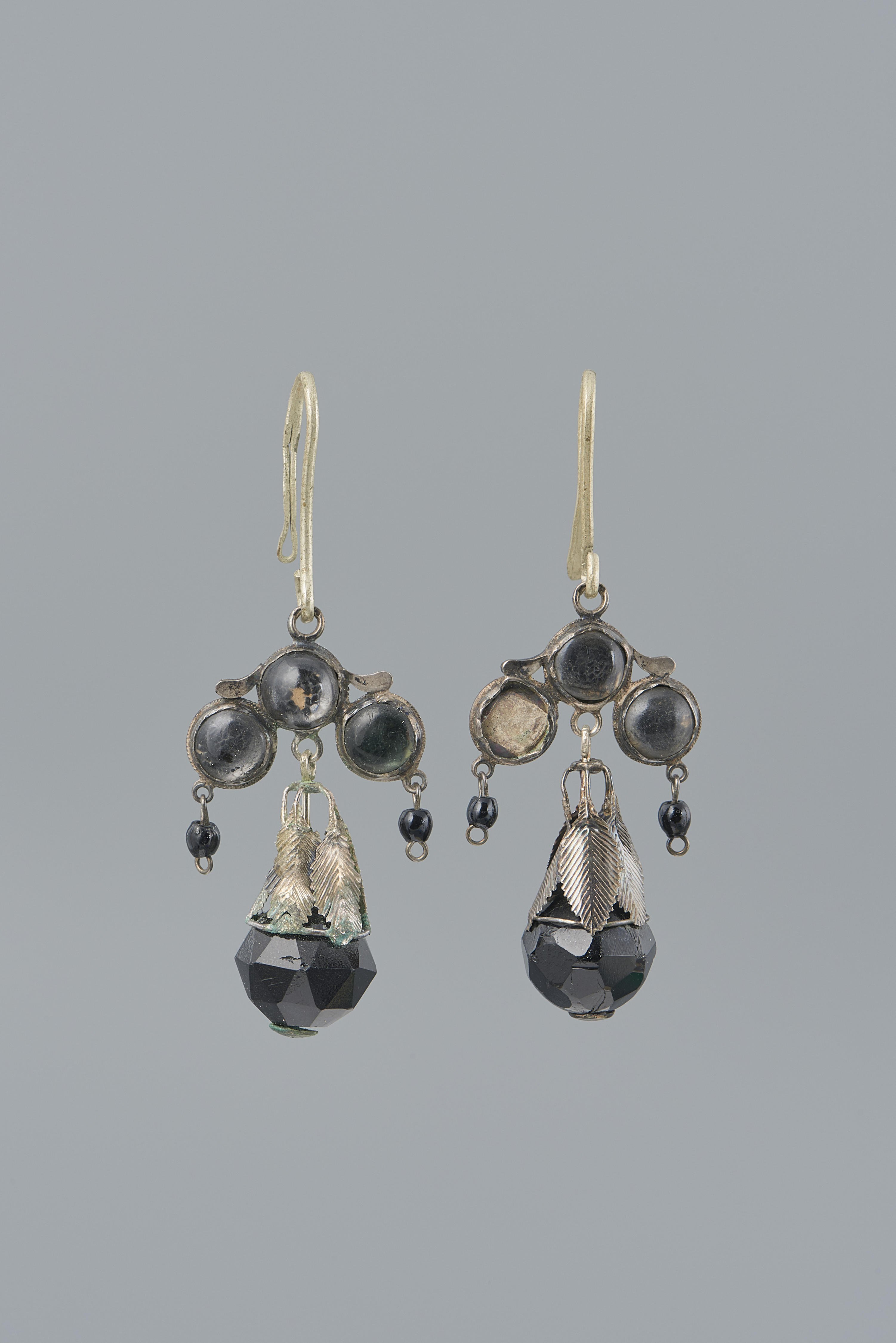Paar zilveren mutsenbellen, gedragen door een vrouw uit Cadzand bij de rouwdracht. De mutsenbellen werden in een lusje in de ondermuts gehaakt en tegen de wangen in de voorstrook van de kornetmuts gedragen. Dit type hanger is niet specifiek voor een bepaalde plaats en werd ook op andere plaatsen in Zeeland gedragen, bijvoorbeeld als oorijzerhanger ...