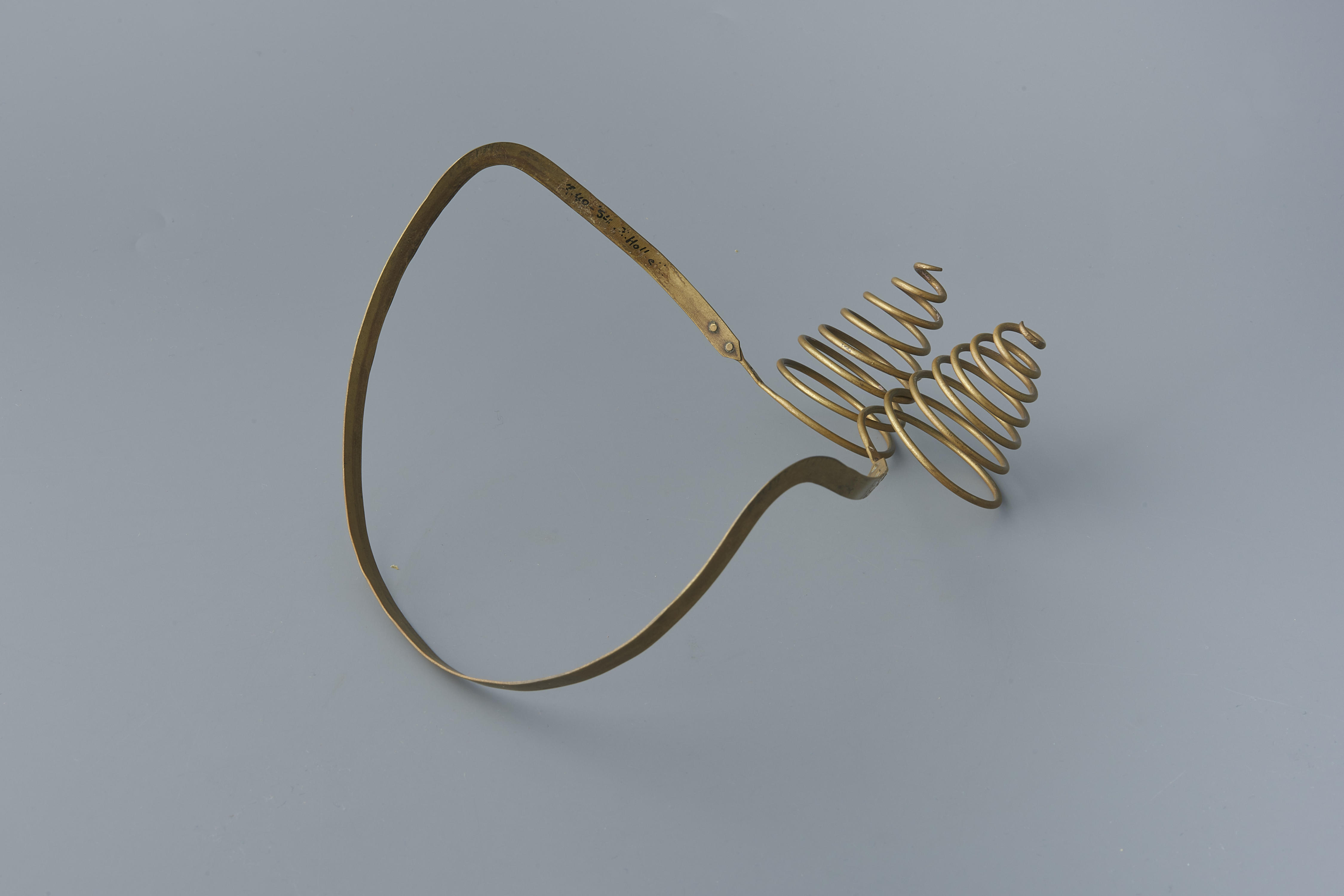 Oorijzer, bestaande uit een messing beugel en twee vergulde messing krullen. Het oorijzer is gedragen door een vrouw in streekdracht van de Zuid-Hollandse Eilanden. De krullen hebben zeven windingen. In de aanzet van de krullen zitten twee gaatjes. Door deze gaatjes kunnen spelden worden gestoken om het oorijzer en de muts aan elkaar vast te ...