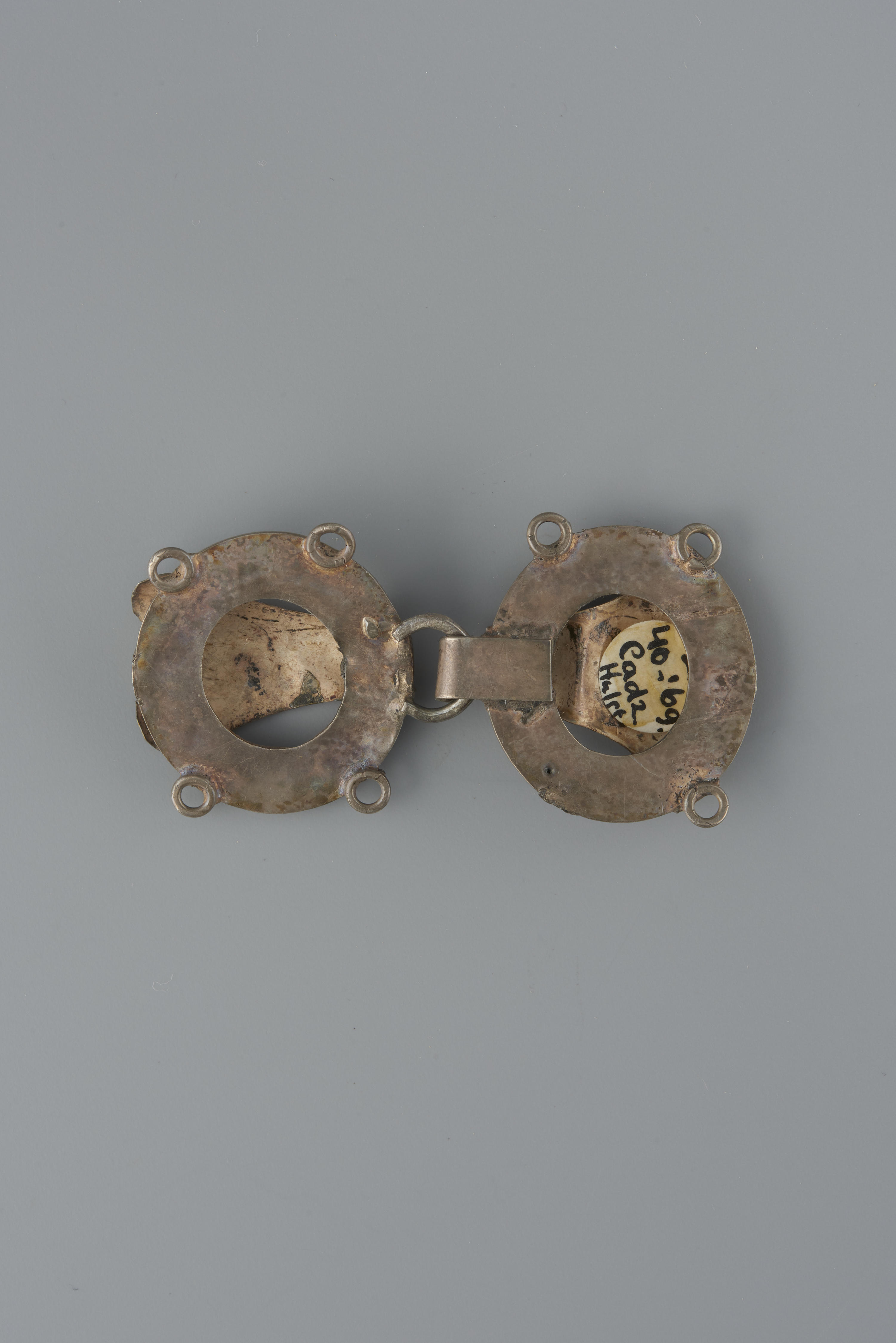 Mantelinehaak van ongemerkt zilver, gedragen in Cadzand of Hulst. De manteline is een lang en ruim overkleed van zwart laken zonder mouwen, een soort cape met capuchon. Er zijn zowel zilveren als gouden mantelinehaken.