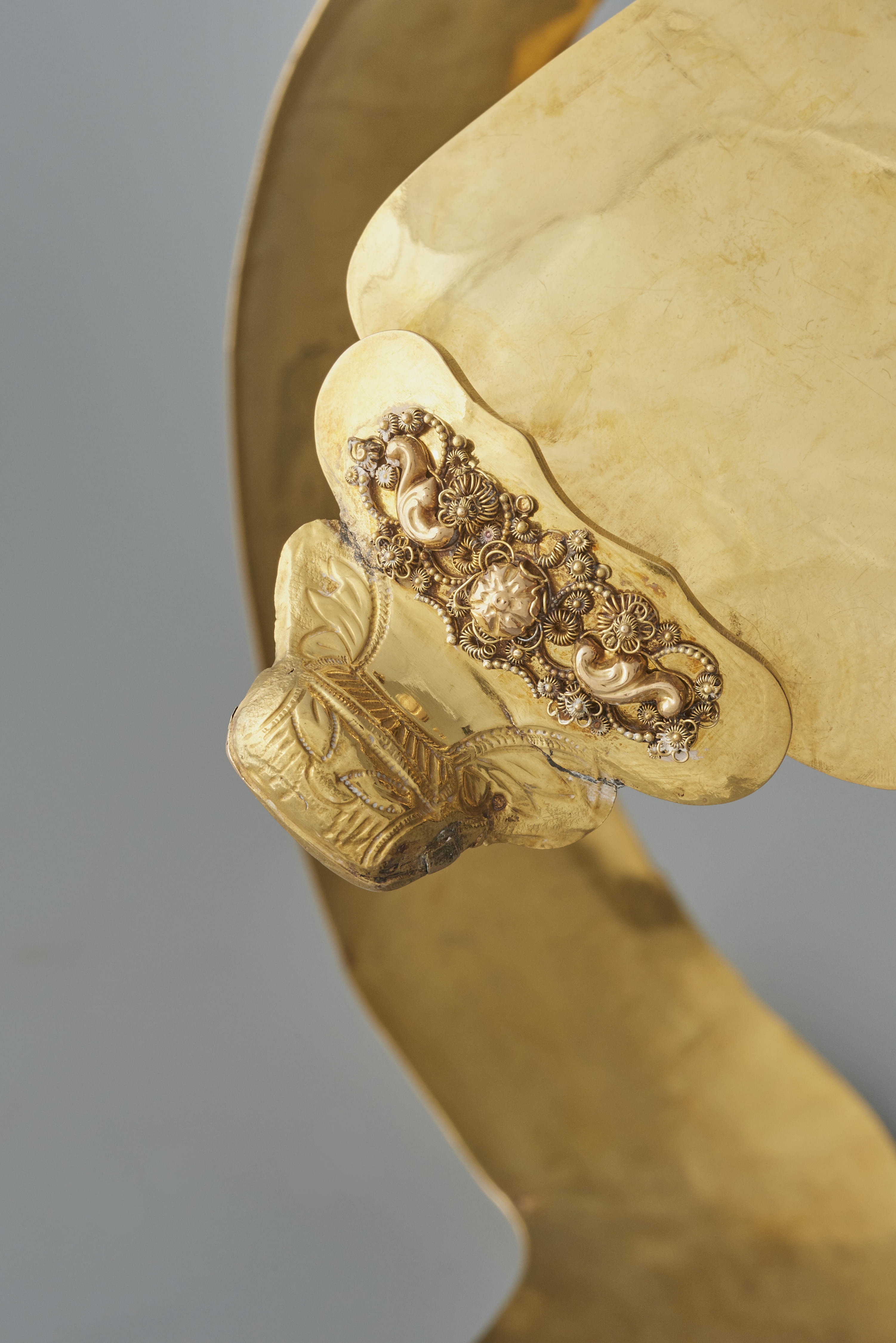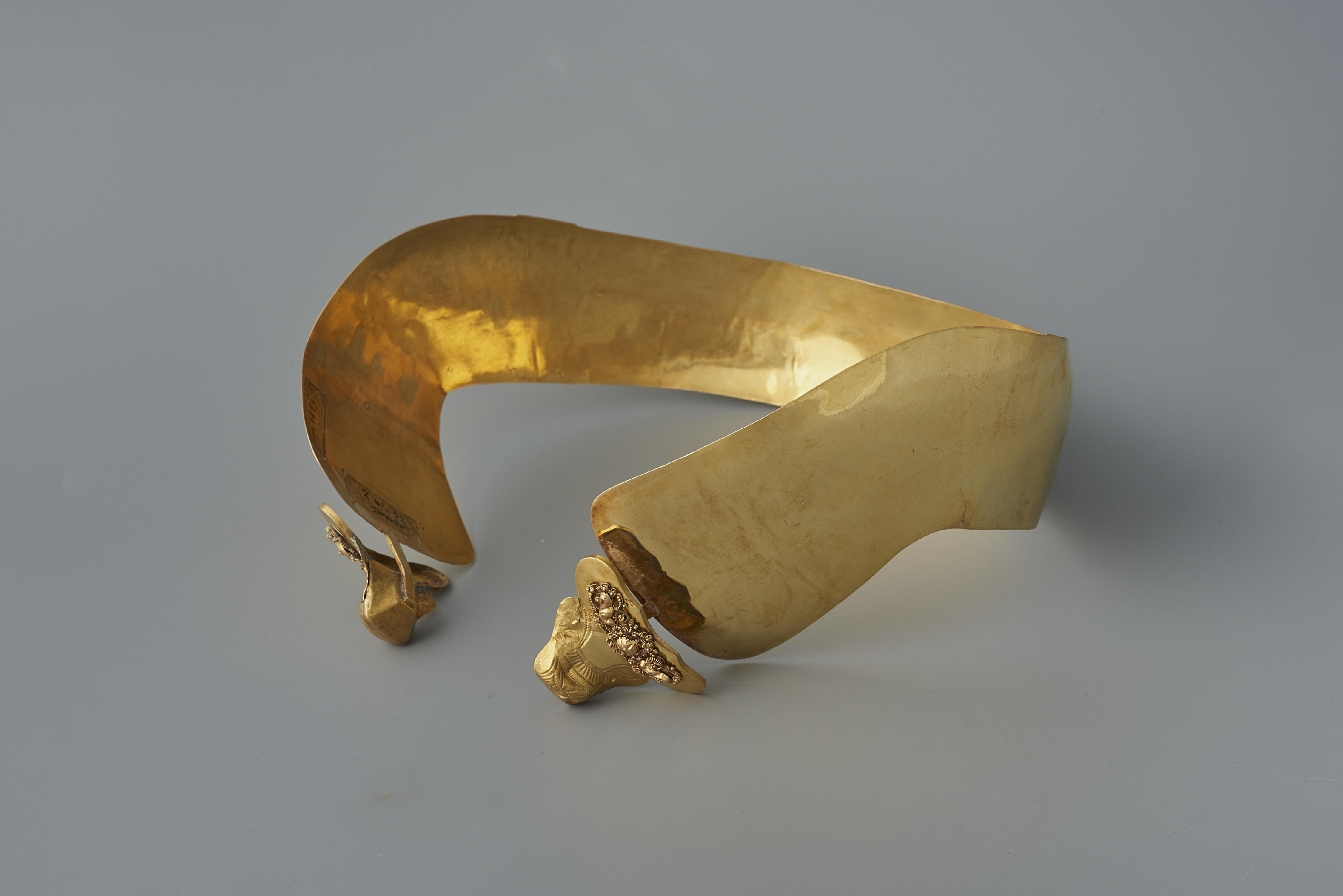 Gouden oorijzer met zogenaamde 'koeiekoppen' aan de uiteinden. Deze koeiekoppen zijn geponst en vervolgens versierd met filigreinwerk. Het oorijzer is in 1859 in Meppel gemaakt door Arjen Sweering. Het is vermoedelijk gedragen in de omgeving van Ruinerwold, Zuidwest-Drenthe.