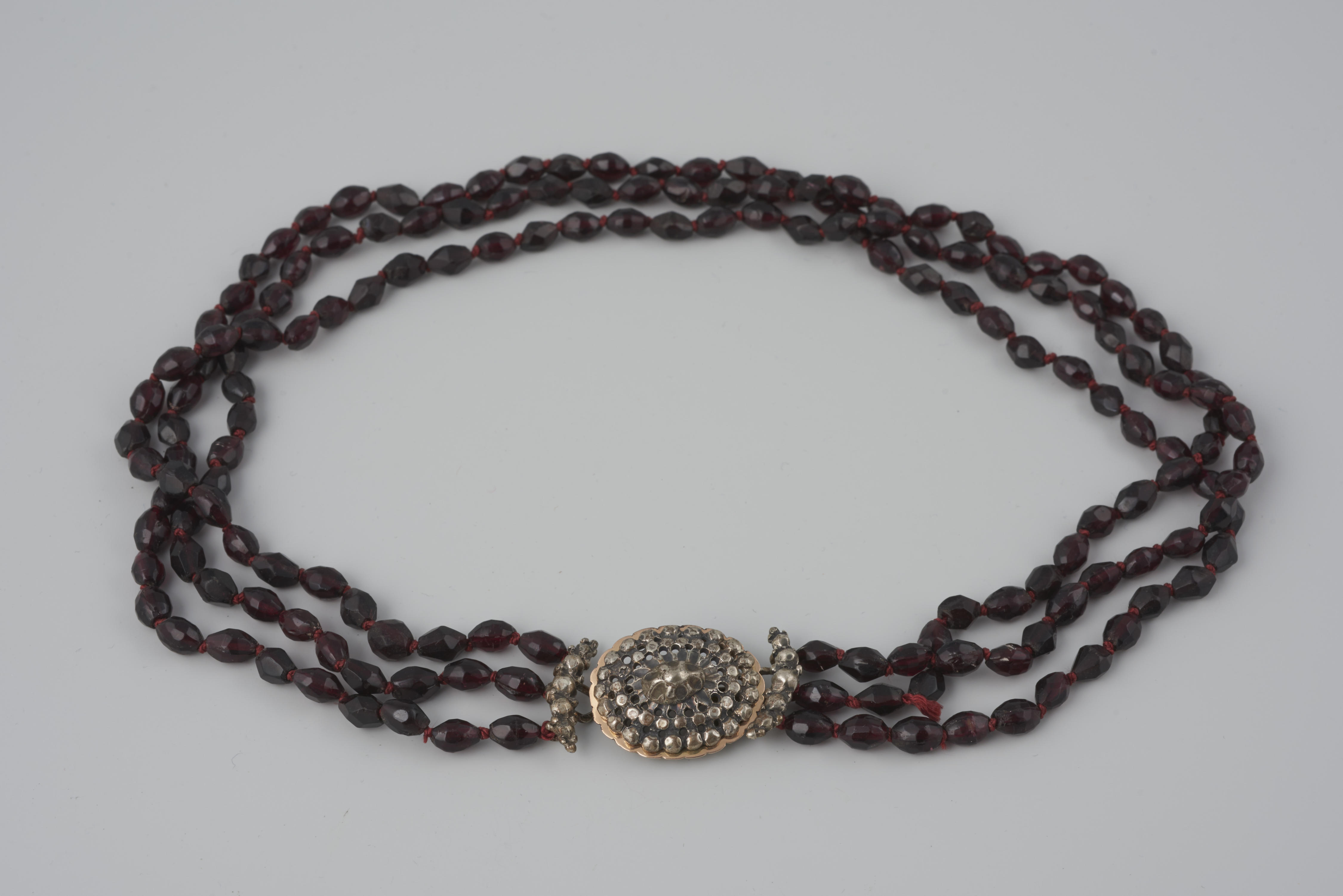 Halssnoer, bestaande uit drie strengen kralen aan een zilveren slot. Het slot is ingelegd met imitatiediamantjes van geslepen glas. Het halssnoer is gemaakt omstreeks 1875 en gedragen door een vrouw uit Noord-Holland. De vervaardiger is onbekend.