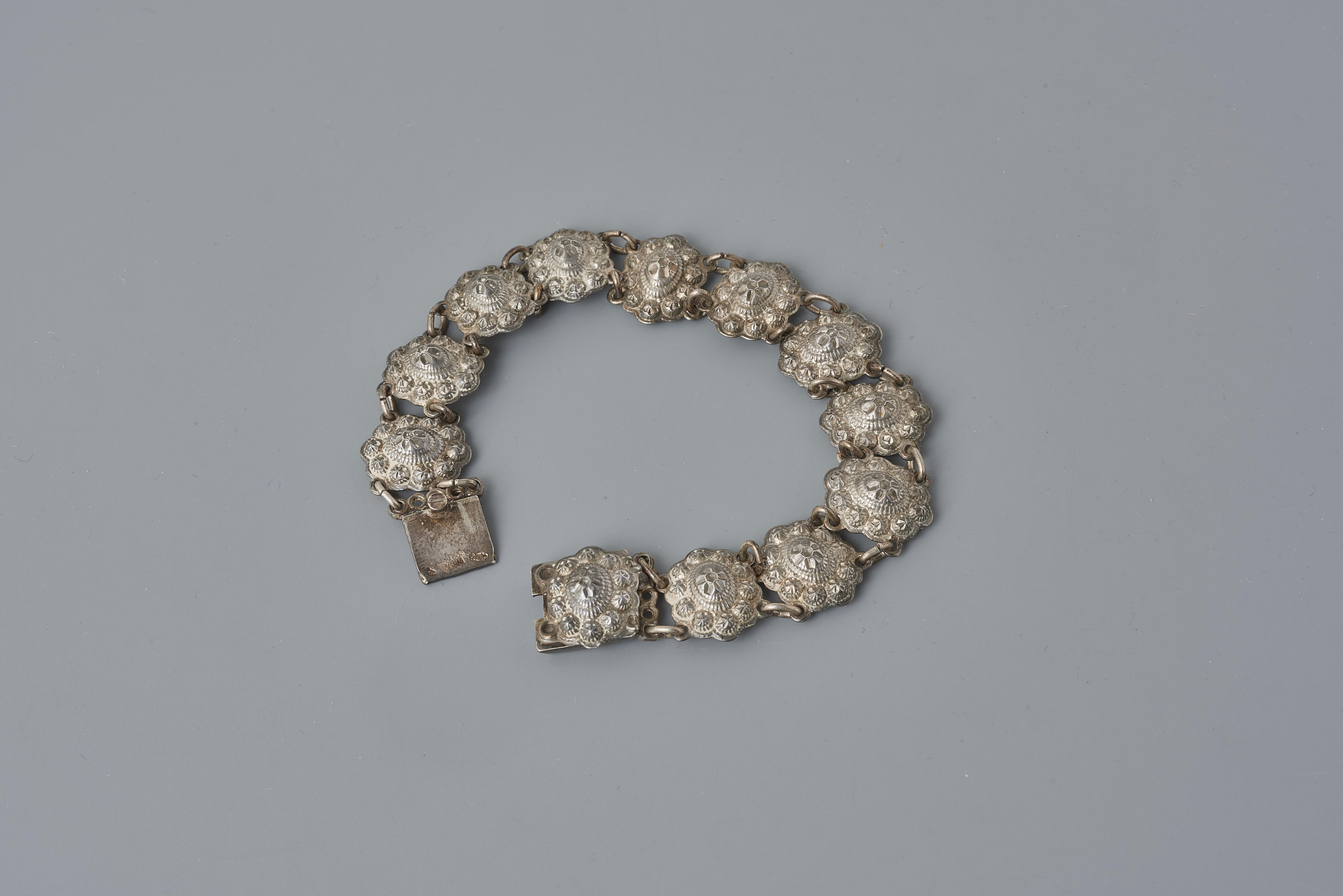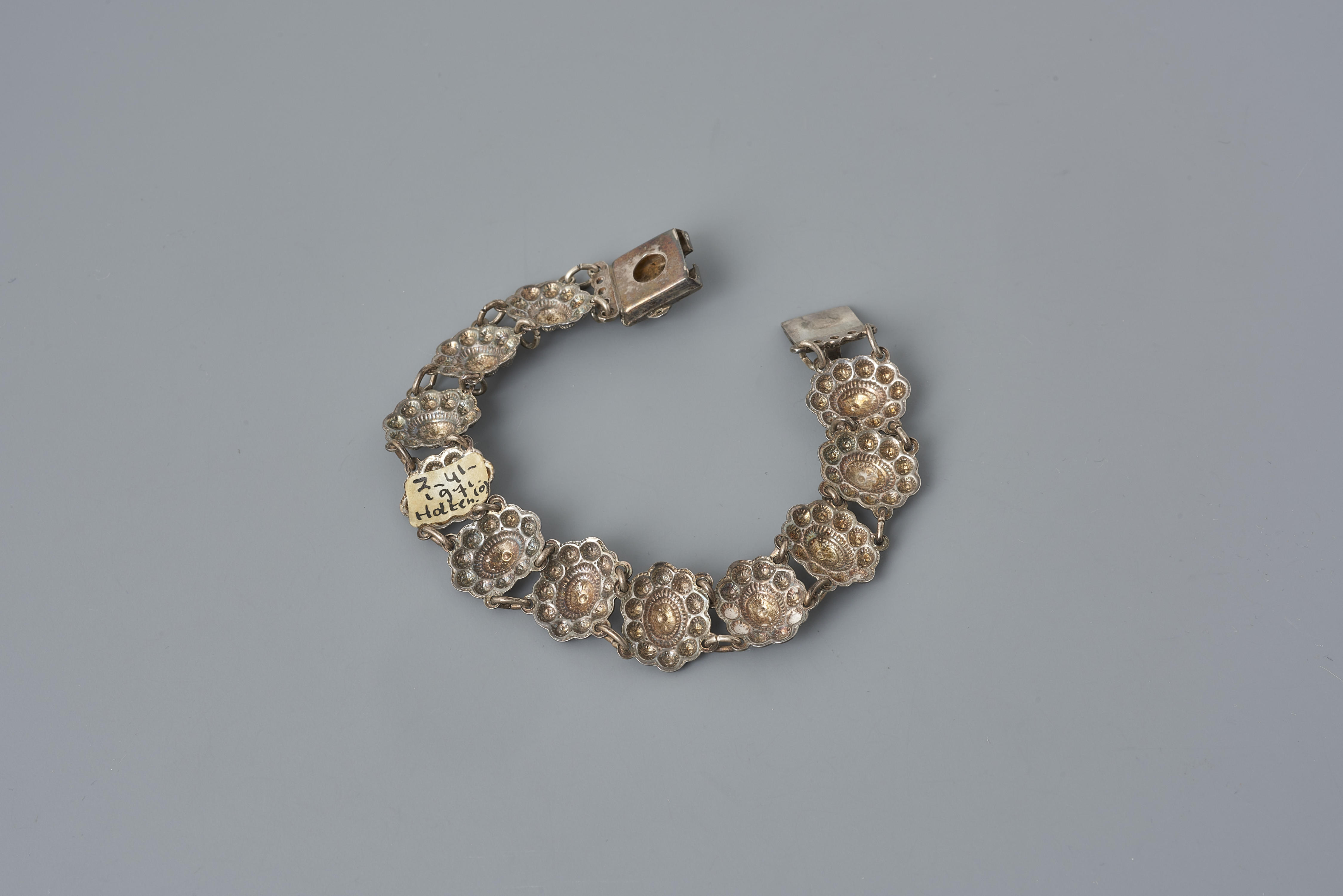 Armband van tweede gehalte zilver, bestaande uit twaalf schakels die onderling verbonden zijn met kleine ringetjes. Bij binnenkomst in het museum is de armband toegeschreven aan Holten, maar deze soort werd algemeen gedragen. De armband heeft een belastingstempel dat gebruikt werd tussen 1906-1953.
