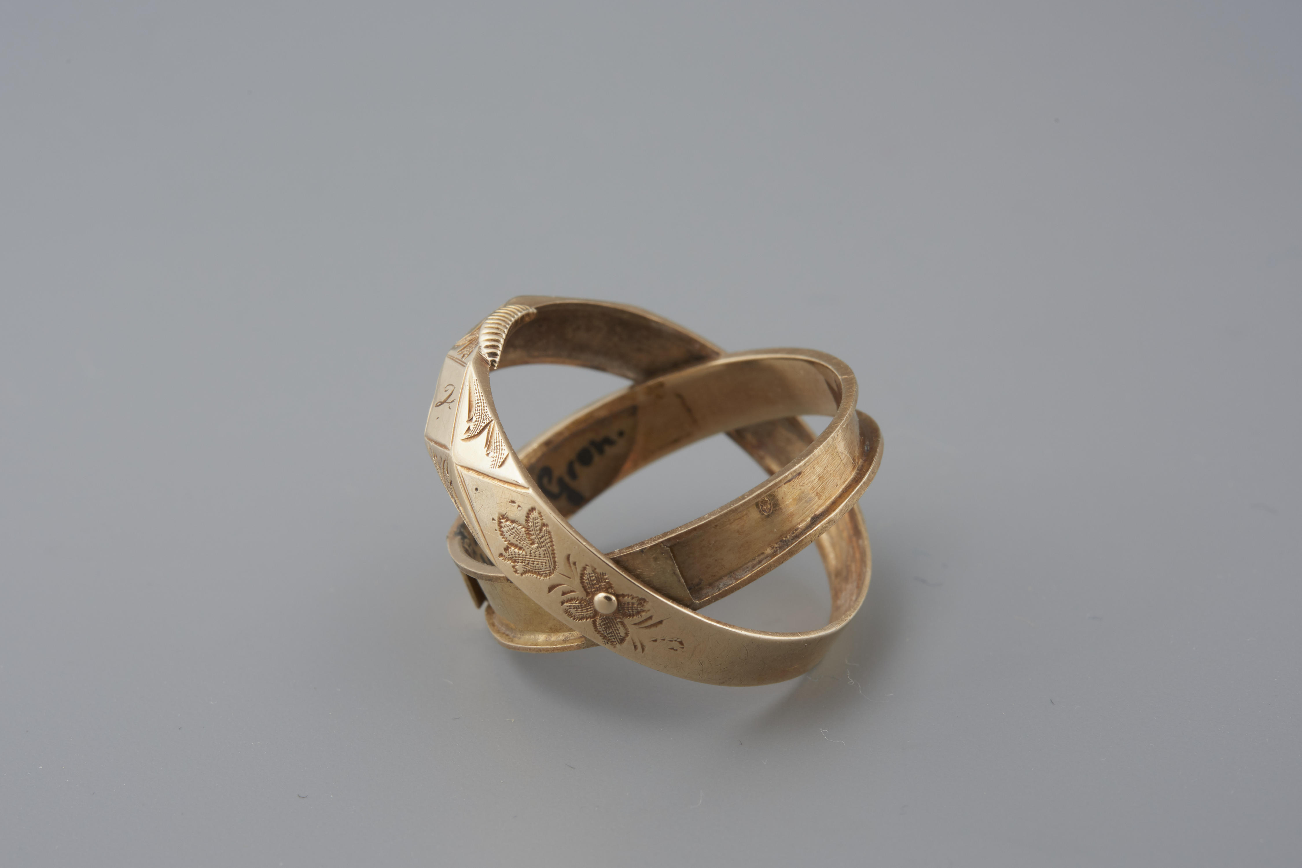 Gouden ring met de initialen ‘WJ’ en ‘V’. In de ring is het jaartal ‘1864’ gegraveerd. Hij is gedragen in de provincie Groningen. Tussen de binnenring en de buitenring kan een lokje haar worden gestopt.