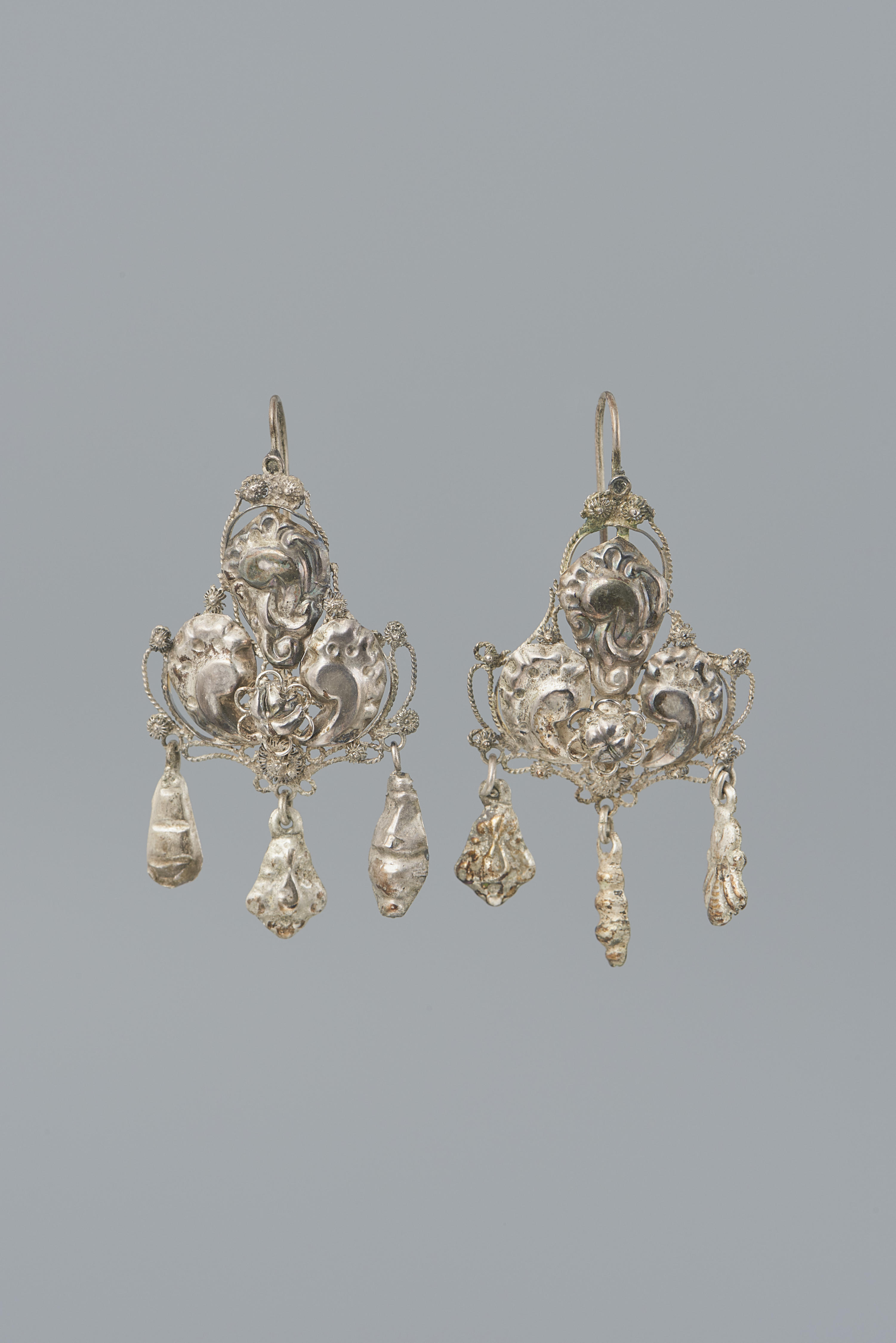 Paar zilveren oorhangers, gemaakt omstreeks 1875. De oorhangers zijn gedragen door een vrouw uit de provincie Groningen. De vervaardiger is onbekend.