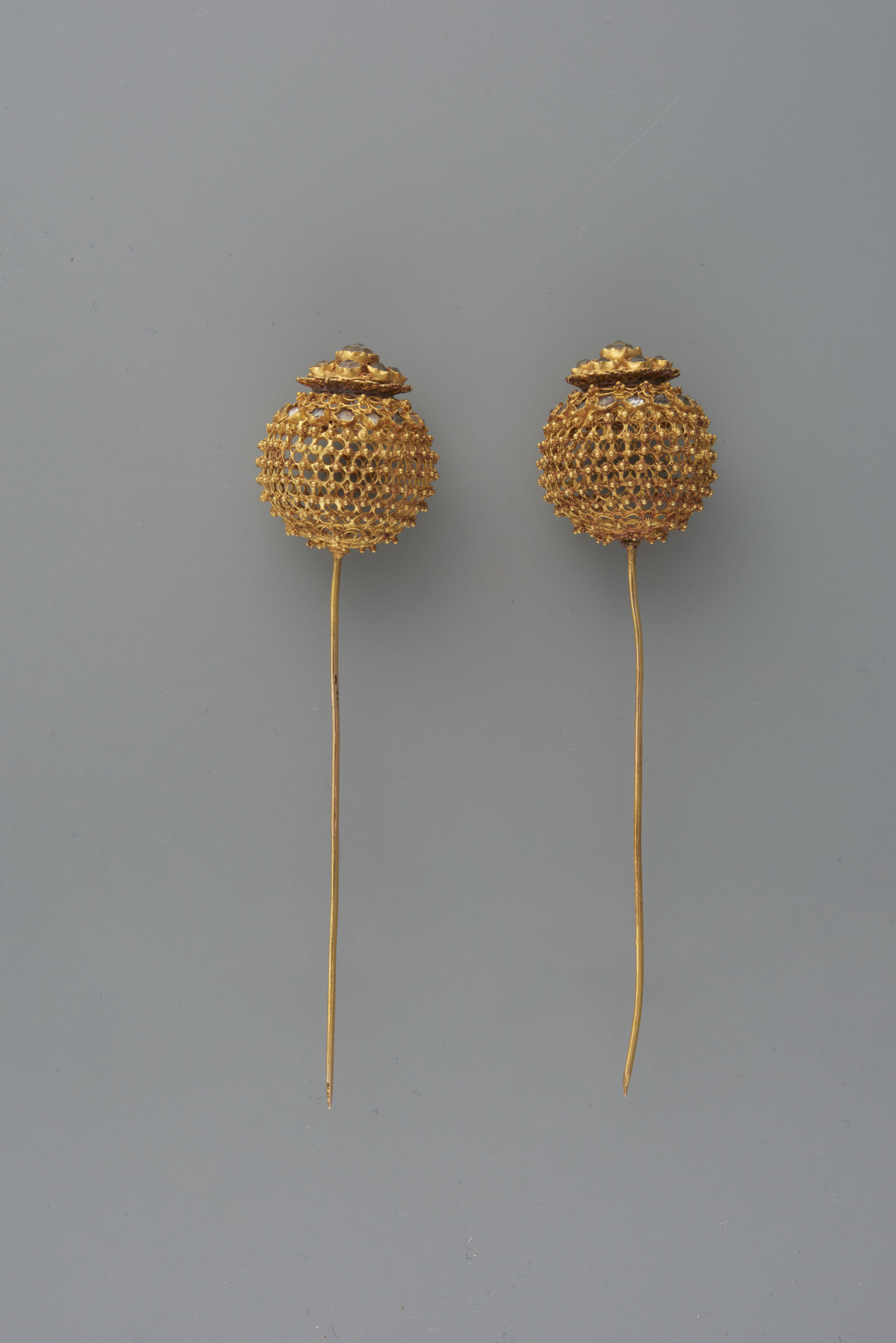Paar 14-karaats gouden mutsspelden, zogenoemde kroonspelden, van cantillewerk en ingelegd met stukjes glas op zilverfolie. Dergelijke mutsspelden werden voornamelijk gedragen door rooms-katholieke vrouwen op Zuid-Beveland. Ze werden in de ondermuts gestoken, vlak achter de uiteinden van het oorijzer. Zo werd de ondermuts aan het oorijzer vastgespeld. Kroonspelden van cantillewerk kwamen vanaf circa 1895 op Zuid-Beveland ...