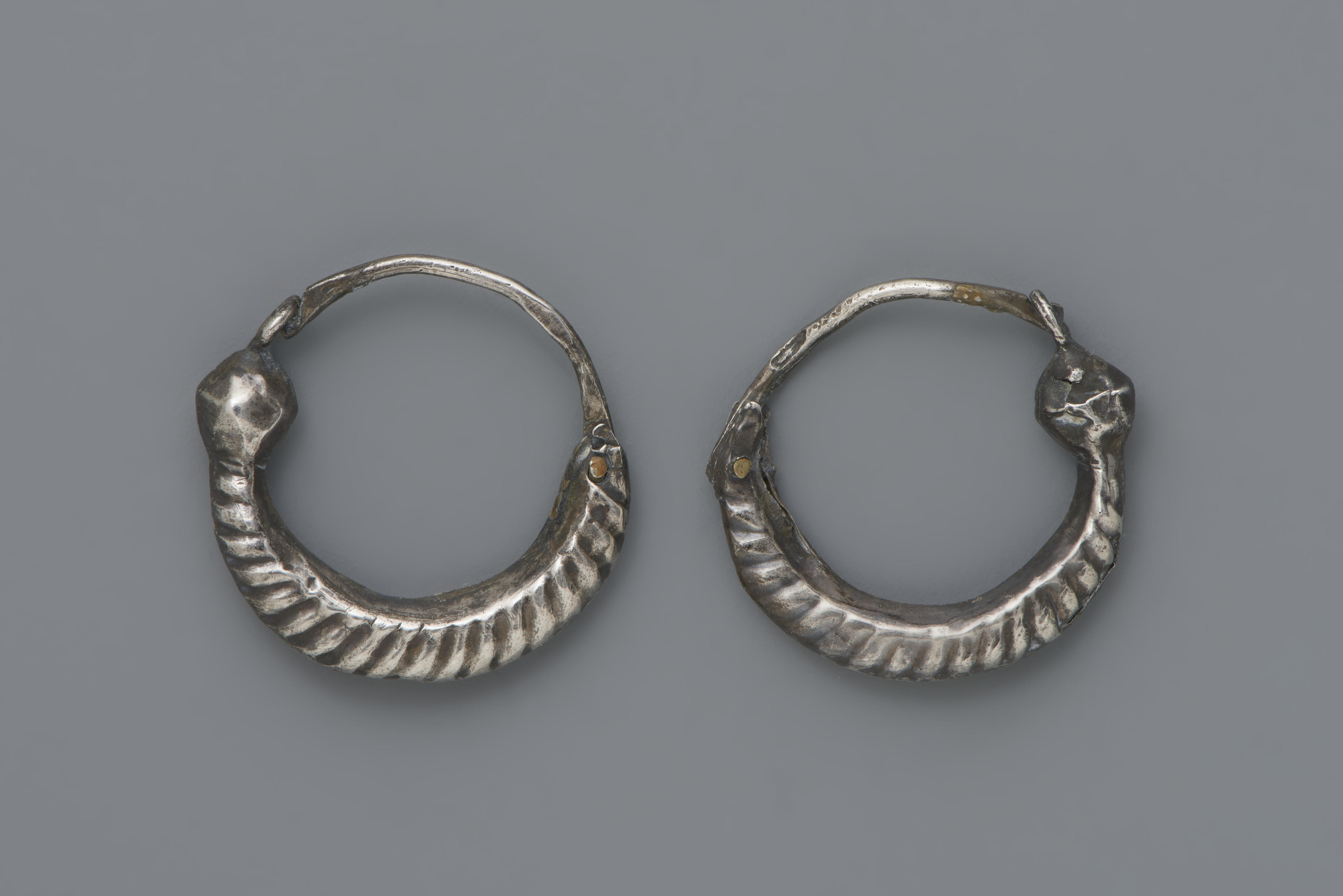 Paar zilveren oorringen, gedragen door een man uit de provincie Groningen. De oorringen hebben een gehaltemerk dat gebruikt is tussen 1814 en 1906.