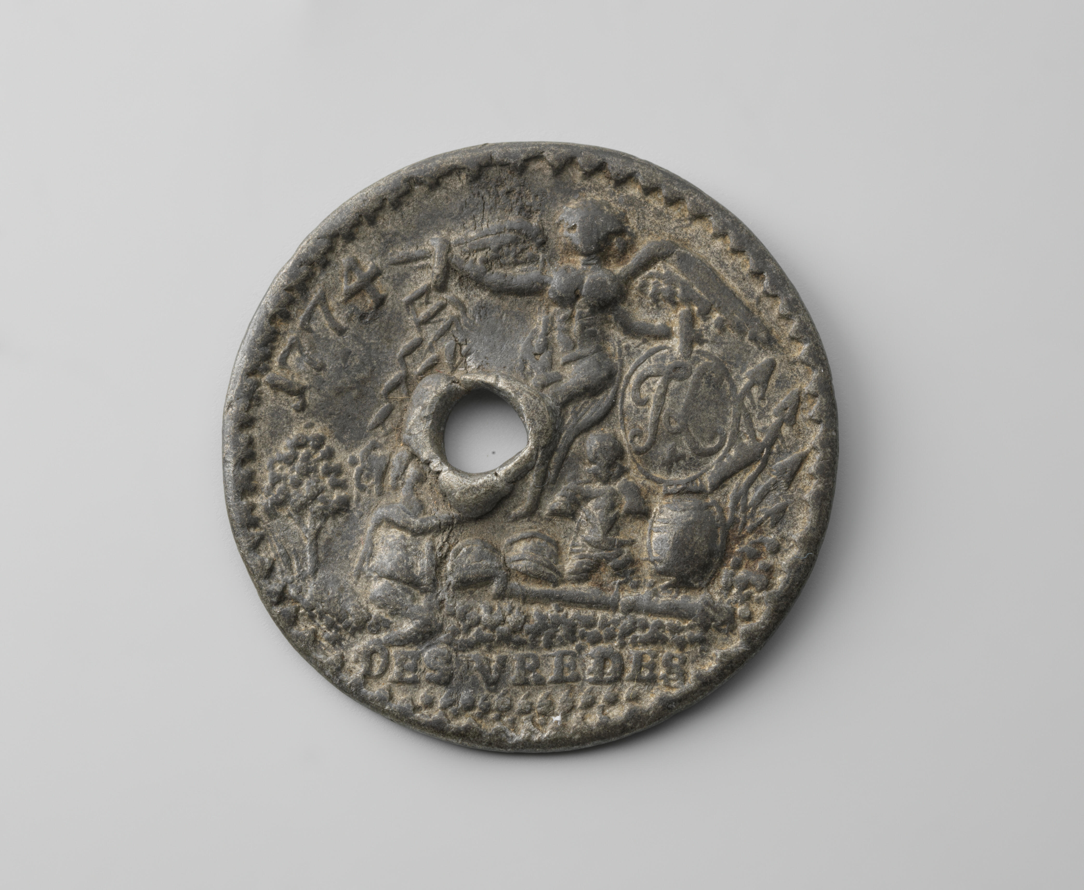 Tinnen knoop, waarschijnlijk een afgietsel van een penning. Op de voorzijde staat de voorstelling van een engel met de letter K, het jaartal 1774 en de tekst 'des vredes'. De knoop is samen met een tweede knoop gebruikt als broekstuk en gedragen door een jongen of man in streekdracht op Walcheren als sluiting van de ...