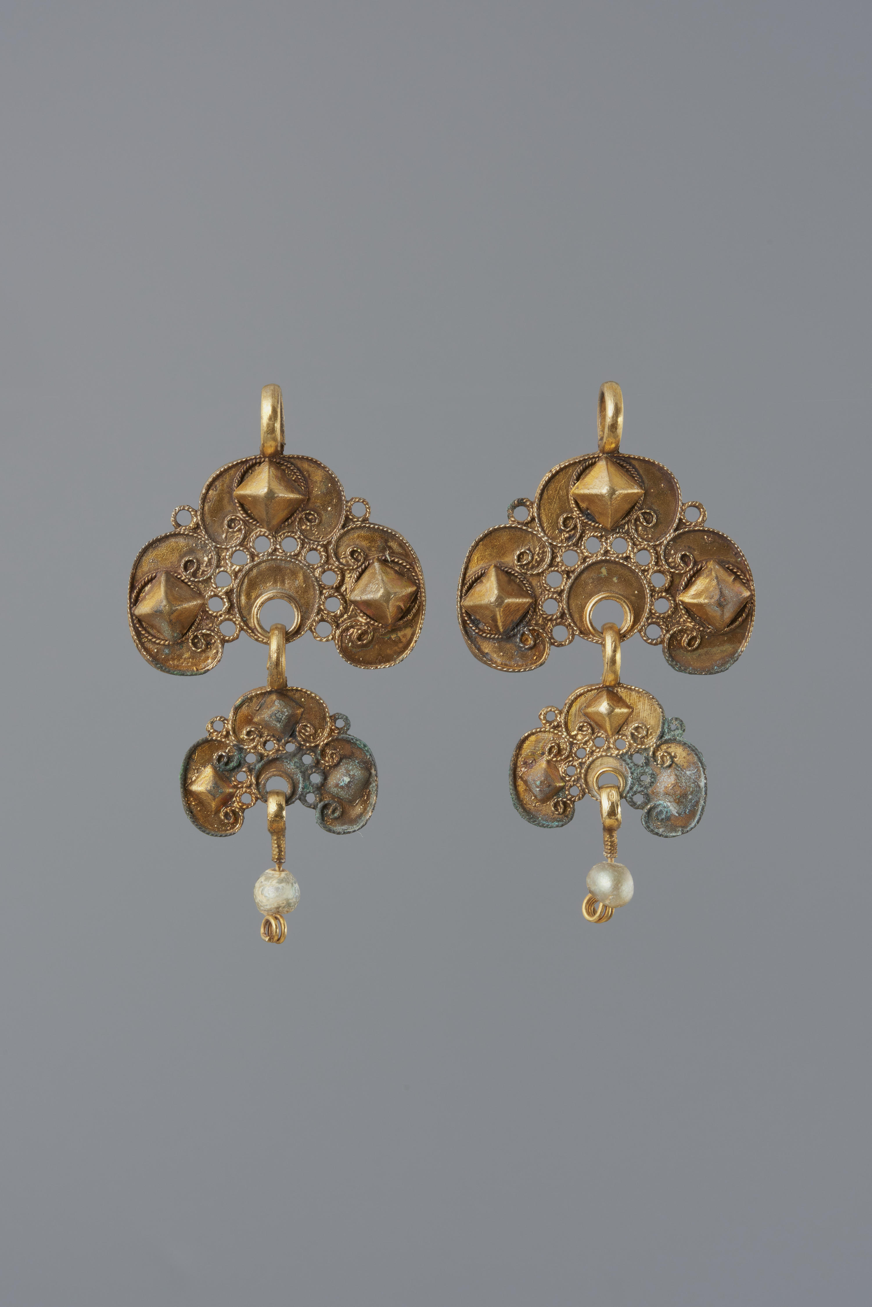 Paar 'dubbele strikken'. De oorijzerhangers zijn in het museum toegeschreven aan Axel, maar waarschijnlijk gedragen door een vrouw uit Arnemuiden. Axelse 'dubbele strikken' zijn meestal aan de voor- en achterzijde gelijk. Deze messing hangers zijn in 1955 in opdracht van het museum verguld en van andere parels voorzien. De vervaardiger en vervaardigingsdatum zijn onbekend.