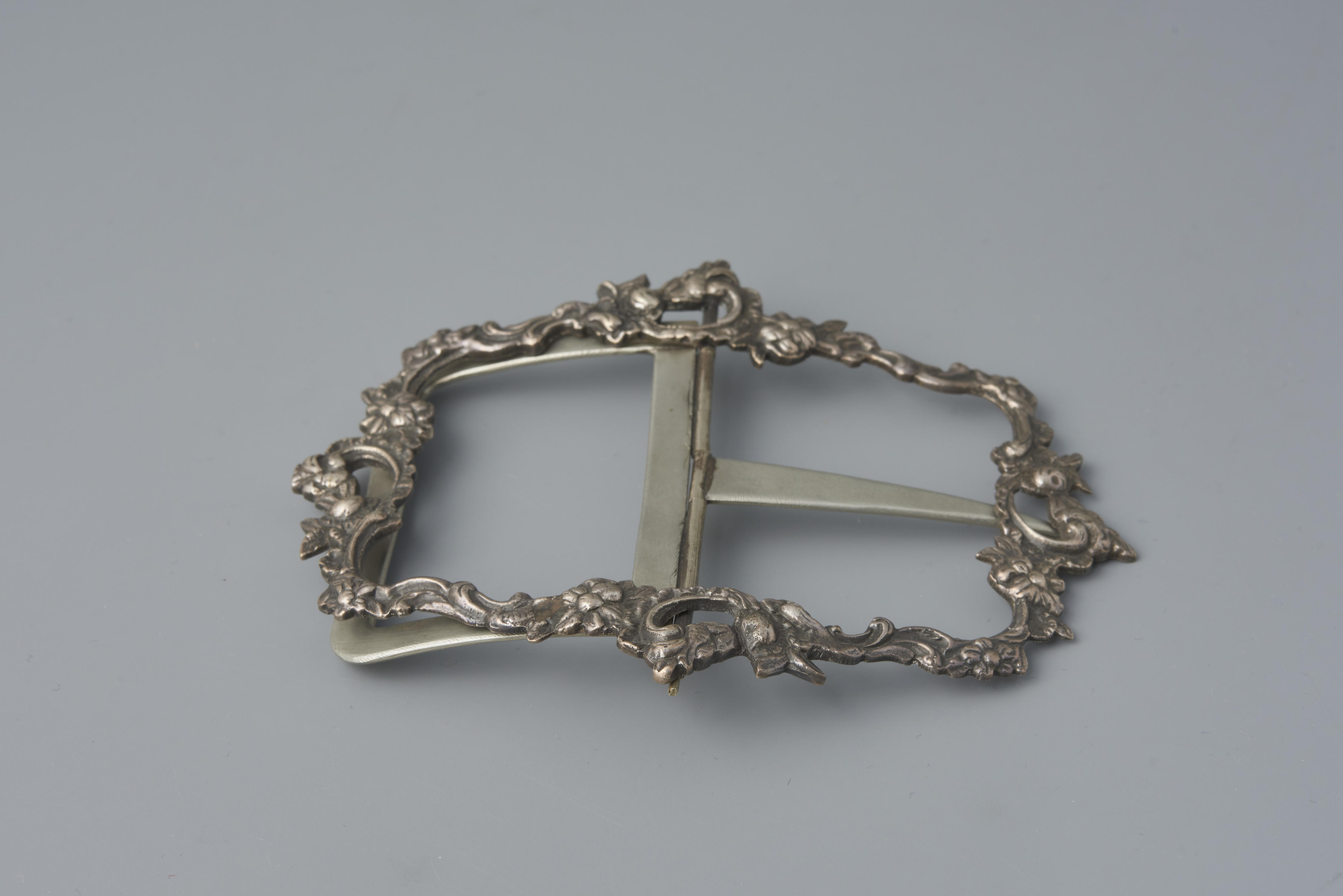Zilveren gesp, gedragen in Noord-Holland. De gesp heeft een jaarletter uit 1894. De vervaardiger is onbekend.