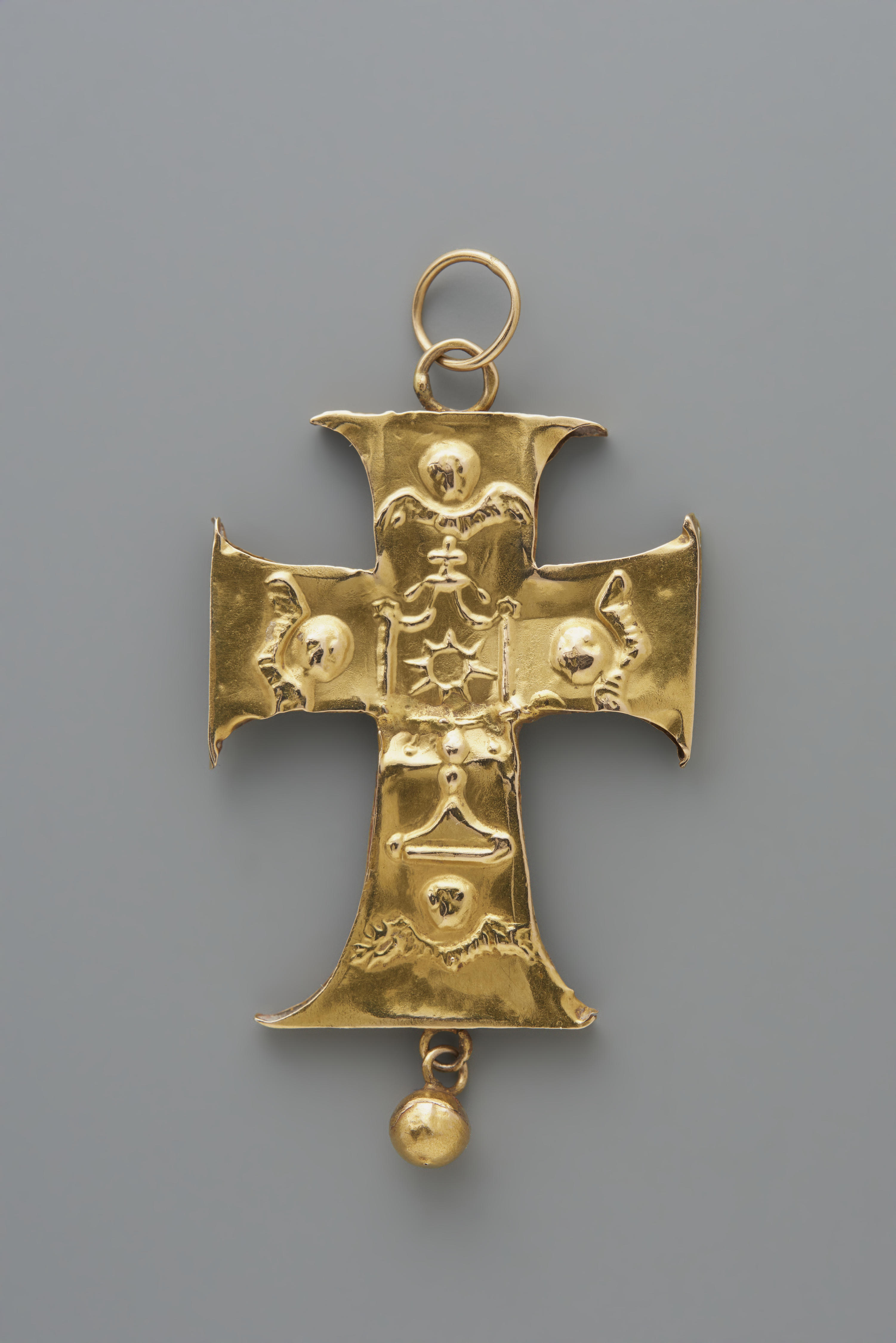 Kruishanger van 14-karaats goud, gedragen door een vrouw uit 't Gooi. Aan beide kanten is de kruishanger versierd met christelijke symbolen. Hier staat op de ene kant een monstrans en op de andere kant is het Lam Gods afgebeeld, omgeven door engelen. De kruishanger heeft een gehaltemerk dat gebruikt is tussen 1853-1906.